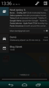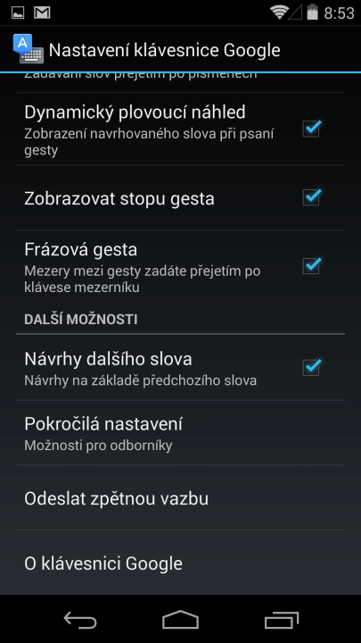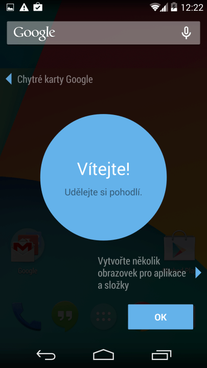 Android 4.4 KitKat - podrobný přehled novinek obrazem i slovem Hlavní stránka Články Sdílejte: Karel Kilián Publikováno: 21.11.2013 12:00 (Aktualizováno: 22.11.2013 15:40) 43 komentářů 43 Android 4.4 KitKat přinesl celou řadu větších i menších novinek, které již mohli ochutnat novopečení majitelé telefonu Nexus 5, jakož i šťastlivci, kteří se dočkali aktualizace Nexusů 4, 7 a 10. Pokud jste ještě neměli tu čest se s KitKatem podrobněji seznámit, přinášíme vám komentovaný obrázkový přehled, čítající více než 140 snímků obrazovky pořízených na Nexusu 5, se všemi podstatnými novými a vylepšenými funkcemi. Obsah Úvodní konfigurace Klávesnice s emoji Google Experience Launcher Google Now/Chytré karty Google jako souèást domovské obrazovky Kontakty a telefonování Integrace SMS do Hangouts Google Cloud Print Hlasové vyhledávání Hodiny Nahrávání videa z obrazovky Další „drobnosti“ Android 4.4 KitKat – podrobný přehled novinek obrazem i slovem Úvodní konfigurace Drobných změn se dočkal průvodce úvodní konfigurací telefonu, který se nyní například ptá na integraci Google Now. Úvodní konfigurace – volba jazyka Úvodní konfigurace – připojení k Wi-Fi Úvodní konfigurace – připojení k Wi-Fi Úvodní konfigurace – připojení k Wi-Fi Úvodní konfigurace – přihlášení k účtu Google Úvodní konfigurace – přihlášení k účtu Google Úvodní konfigurace – souhlas s podmínkami Úvodní konfigurace – přihlášení k účtu Google Úvodní konfigurace – záloha a obnova, přístup k poloze Úvodní konfigurace – přístup k poloze a informace o novinkách Úvodní konfigurace – jméno majitele Úvodní konfigurace – moment :) Úvodní konfigurace – Chytré karty Google Úvodní konfigurace – Chytré karty Google Uživateli jsou po nastartování vysvětleny některé základní principy práce se systémem Android Základní principy práce Základní principy práce Základní principy práce Klávesnice s emoji Jednou z novinek uživatelského rozhraní je klávesnice, která se dočkala mírného upgradu. Na první pohled se jedná o stejnou „klaviaturu“, s jakou se můžeme setkávat v Androidech 4.x Jelly Bean. Výchozí klávesnice z Androidu 4.4 Výchozí klávesnice z Androidu 4.4 Zásadní změnu ale zpozorujete, jakmile budete psát v aplikaci Hangouts. Pozici Enteru totiž zaujme tlačítko se smajlíkem, vedoucí k pestré nabídce 153 smajlíků, obrázků a „emoji“. Když si z Obchodu Play stáhnete aktualizovanou Klávesnici Google (viz zprávička Nově v Google Play klávesnice a Hangouts z KitKatu), dostanete také přístup ke smajlíkům, ovšem s podstatně omezenějším výběrem. Na následujících obrázcích si můžete prohlédnout přehled všech grafických symbolů, které klávesnice na Androidu 4.4 umí. Nabídka grafických symbolů klávesnice Nabídka grafických symbolů klávesnice Nabídka grafických symbolů klávesnice Nabídka grafických symbolů klávesnice Nabídka grafických symbolů klávesnice Nabídka grafických symbolů klávesnice Nabídka grafických symbolů klávesnice Nabídka grafických symbolů klávesnice Z dosavadních funkcí zůstává možnost přepínání mezi více jazyky podržením mezerníku, vibrační a zvuková odezva a deaktivovatelné tlačítko pro hlasové zadávání. S psaním pomohou připravené slovníky, které lze doplnit o vlastní slova, zatím ale stále nemůžeme počítat s funkcí automatického učení jazyka uživatele, například podle odeslaných e-mailů a příspěvků na sociálních sítí. Nedočkali jsme se ani synchronizace slovníků mezi více zařízeními. Možnosti nastavení klávesnice Možnosti nastavení klávesnice Možnosti nastavení klávesnice Možnosti nastavení klávesnice Možnosti nastavení klávesnice Možnosti nastavení klávesnice Psaní tahem prstu, neboli „psaní gesty“, dostalo drobné vylepšení, spočívající v automatickém oddělování slov přejetím mezerníku. Můžete tak psát, aniž byste museli zvedat prst z obrazovky. Google Experience Launcher Asi nejzásadnější změnou, která je prozatím vyhrazena pouze pro telefony Nexus 5, je nový launcher, nazvaný Google Experience. Jednou z často zmiňovaných novinek je částečně průhledná nabídka s tlačítky a oznamovací oblast. Průhledná oznamovací oblast Průhledná hlavní nabídka Jiný je také způsob přepínání launcheru – zatímco původně bylo nutné odebrat aktuálnímu launcheru nastavení jako výchozí, stisknout tlačítko Domů a poté vybrat z nabídky požadovaný launcher, nyní lze kromě obvyklého způsobu tuto operaci provést přes nastavení. V systémovém nastavení je nová položka Plocha, pod kterou lze přepínačem zvolit používaný launcher. Kromě toho je možné přes ikonku koše kterýkoli launcher (kromě výchozího) odinstalovat. Původní způsob přepínání launcheru je stále k dispozici V systémovém nastavení je nová položka Plocha Nabídka dostupných launcherů Volba výchozího launcheru Odinstalace launcheru Nabídka dostupných launcherů Android 4.4 KitKat také mění filozofii správy více ploch domovské obrazovky. Nefunguje tu gesto „štípnutí“ k přepnutí do režimu úprav, odebírání, přidávání nových obrazovek a změny jejich organizace. Nové plochy se vytvářejí automaticky podle potřeby – stačí na ně přetáhnout ikonu aplikace z některé z vedlejších ploch nebo ze seznamu programů. Podobně k odstranění plochy dojde automaticky, jakmile neobsahuje žádnou ikonu. Ve výchozím stavu má systém jen jednu (respektive s Google Now dvě) plochy, jejich počet se pak postupně navyšuje, jak přibývají nainstalované aplikace (Obchod Play má v nastavení, aby umísťoval ikony na domovskou obrazovku). Výchozí plochou je za všech okolnost