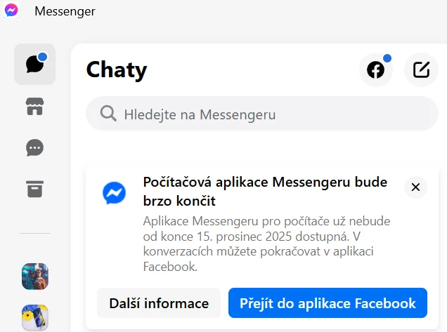 Aplikace Messenger pro Windows brzy skončí. Náhrada vás zklame Hlavní stránka Zprávičky Aplikace Messenger, která umožňuje komunikaci bez načtení celého Facebooku, končí Meta nabízí jako alternativu aplikaci Facebook, která je ke stažení ve Storu Nejedná se ani zdaleka o plnohodnotnou náhradu za pouze chatovací aplikaci Sdílejte: Libor Foltýnek Publikováno: 18.10.2025 12:00 3 komentáře 3 Komunikujete s přáteli pomocí Messengeru? Možná stejně jako já používáte ve Windows speciální aplikaci, protože nechcete mít v prohlížeči otevřený celý Facebook. Tak tomu bude brzy konec, Messenger začal zobrazovat oznámení, že od 15. prosince 2025 končí. Nabízí náhradu, ta má ale k dokonalosti daleko. Hlavním důvodem, proč používám aplikaci, je v mém případě to, že je zaměřená na jednu funkci a nerozptyluje vás nadbytečnými informacemi. Jasně, že jde přečíst si zprávy i na Facebooku, jenže to znamená načtení rozsáhlého webu. Navíc aplikaci můžete mít jako samostatnou ikonu na hlavním panelu. Messenger končí, přivítejme Facebook Co tedy Meta nabízí jako náhradu? Po kliknutí na tlačítko „Přejít do aplikace Facebook“ se mně otevřel Microsoft Store. V něm musíte aplikaci stáhnout. Store se bohužel chová docela náhodně a místo spuštění instalačního procesu se jen stáhl spustitelný soubor, který teprve vlastní aplikaci nainstaluje. Spustit instalaci musíte ručně. Mírně humorné mi připadá, že se samotná aplikace opět stahuje z Microsoft Store. Tomu tedy říkám uživatelská přívětivost! Co nás čeká po spuštění? Messenger Meta Platforms, Inc. Instalovat (Free) Google Play Aplikace okamžitě zobrazila obsah mé zdi na Facebooku, nechtěla ani přihlášení. To jednoznačně ukazuje, že jde ve skutečnosti pouze o webovou stránku, obalenou aplikací. Aplikace sdílí přihlášení s prohlížečem, což může být výhoda i nevýhoda. Když srovnáme zobrazení Facebooku v aplikaci (vlevo) a v prohlížeči Edge (vpravo), je velice těžké najít vůbec nějaký rozdíl. Jediné plus zdánlivě představuje možnost mít na liště onu samostatnou ikonku, a že se takto otevřený Facebook nebude plést mezi ostatní weby. Facebook Meta Platforms, Inc. Instalovat (Free) Google Play To ale nakonec také není úplně pravda. Když jsem zkusil z aplikace otevřít nějaký odkaz v nové záložce, otevřela se nová stránka v hlavním prohlížeči. Důvod k existenci speciální aplikace mně tedy uniká. Jako náhrada za relativně minimalistický Messenger tato aplikace nedává smysl vůbec. Bude vám Messenger pro Windows chybět? Zdroj: vlastní O autorovi Libor Foltýnek Libor Foltýnek je redaktor s rozsáhlými zkušenostmi v oblasti technologií a fotografie. Jeho práce je charakterizována důkladným výzkumem, poutavým vyprávěním a praktickými radami, které zpřístupňují… Více o autorovi Sdílejte: 3 komentáře Vložit komentář Facebook Facebook Messenger Windows Mohlo by vás zajímat Novoroční výprodej Godeal24: Získejte Microsoft Office 2021 Pro za 882 Kč za Life a klíče k Windows 11 Pro levněji Komerční článek 9.1. Xiaomi má novou hračku za pár drobných, která se hodí ke každému notebooku Adam Kurfürst 24.10.2024 Klikli byste na tohle? Nový podvod láká na falešné ověření skrz Captchu Libor Foltýnek 25.12.2024 Jak smazat Instagram? Poradíme, jak dočasně nebo trvale odstranit účet David Trlica 4.2.2019 Rusko zakázalo hovory z internetu do telefonních sítí, prý kvůli podvodům Libor Foltýnek 31.12.2024 Nejste sami! Messenger, Facebook, WhatsApp i Instagram mají výpadek Libor Foltýnek 11.12.2024