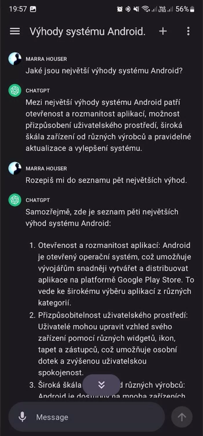 ChatGPT už je k mání jako Android aplikace. Toto všechno umí Hlavní stránka Články Sdílejte: Marek Houser Publikováno: 26.7.2023 18:00 (Aktualizováno: 31.7.2023 20:05) 2 komentáře 2 Několik týdnů trvající čekání a pár dní finálního vábení je u konce a společnost Open AI konečně globálně vydala jako aplikaci pro Android svého konverzačního AI bota ChatGPT. Ta v obchodě Google Play změnila svůj status z předregistrace na běžné stažení. Aplikace už oficiálně funguje i v ČR, včetně přihlášení. V tuto chvíli má již přes jeden milion stažení. ChatGPT OpenAI Instalovat (Free) Google Play Aplikace má kromě klasického textového pole pro vkládání příkazů (promptů) také mikrofon, se kterým je možné text nadiktovat. Zajímavá je haptická odezva, která doprovází generování textu. Dá se manuálně vypnout v nastavení. Zde najdeme i případné ukládání historie nebo přepínání mezi světlým a tmavým režimem. ChatGPT i zde rozumí češtině, nicméně rozhraní je anglicky. [alert-note-svetandroida title=“ChatGPT“ icon=“star“]Velký jazykový model vyvinutý společností OpenAI. Je to umělá inteligence, která byla trénována na velkém množství dat z internetu a knihoven, a je schopná generovat texty, odpovídat na otázky, provádět překlady, rozpoznávat obrazy a provádět mnoho dalších jazykových úkolů.[/alert-note-svetandroida] „Aplikace je zdarma a synchronizuje vaši historii napříč zařízeními. Integruje také Whisper, náš open-source systém rozpoznávání řeči, který umožňuje hlasové zadávání. Předplatitelé služby ChatGPT Plus získají exkluzivní přístup k možnostem GPT-4, včasný přístup k funkcím a rychlejší odezvu,” komentovali již dříve vývojáři z Open AI spuštění aplikace ve verzi pro iOS. Poskytli také podrobný seznam dalších funkcí, který je uveden i na Google Play… Okamžité odpovědi: Získejte přesné informace, aniž byste museli procházet reklamy nebo více výsledků. Poradenství na míru: Poradí vám s vařením, plánováním cest nebo psaním promyšlených zpráv. Kreativní inspirace: Vygenerujte nápady na dárky, načrtněte prezentace nebo napište dokonalou báseň. Profesionální vstupy: Zvyšte produktivitu díky zpětné vazbě k nápadům, shrnutí poznámek a odborné pomoci s tématy. Příležitosti ke vzdělávání: Prozkoumejte nové jazyky, moderní dějiny a další informace vlastním tempem. [cite author=“Tip“]Nechcete si nechat ujít zprávičky, články, návody či recenze ze Světa Androida? Můžete nás sledovat třeba přes Google News, na Facebookové stránce a také na Instagramu. Máme také komunitní skupiny na Discordu a na Facebooku. Další možnosti sledování najdete v našem návodu.[/cite] K čemu hodláte využívat ChatGPT na Androidu? O autorovi Marek Houser Fanoušek technologií už od chvíle, kdy jako malý kluk zadával příkazy Lemíkům na "dvaosmšestce". V záloze stále uchovává starý a podle všeho nezničitelný OnePlus2, ale… Více o autorovi Sdílejte: 2 komentáře Vložit komentář AI Android Aplikace ChatGPT Umělá inteligence Mohlo by vás zajímat Android Auto dostane schopnějšího asistenta! Takto (zhruba) vypadá Gemini v akci Adam Kurfürst 9.1. Fotky Google dají uživatelům větší kontrolu, chyby AI půjde opravit Libor Foltýnek 10.1. Roztomilý robůtek od Samsungu zamíří do domácností. Malý AI asistent pomůže zahnat nudu i samotu Jana Skálová 9.1. Tohle jsou zatím nejlepší obrázky řady Samsung Galaxy S25! Podívejte se Adam Kurfürst 10.1. Android XR oficiálně představen! Nový operační systém bere dech, první ukázky vypadají famózně Jakub Kárník 13.12.2024 Předpověď počasí vstupuje do nové éry. Google představil převratnou technologii a uvolnil ji zdarma Jakub Kárník 6.12.2024