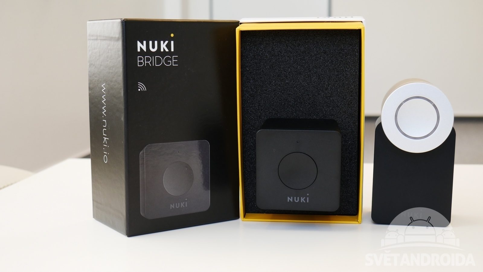 Chytrý zámek Nuki: Propojte své dveře s Androidem (recenze) Hlavní stránka Recenze Ostatní recenze Sdílejte: Jan Dolejš Publikováno: 3.10.2016 22:00 (Aktualizováno: 2.3.2022 15:10) 11 komentářů 11 Mobilním telefonem dnes zvládáme stále více věcí, tak proč mu nesvěřit i přístup k našemu domovu? To přesně zajistí chytrý zámek Nuki, který jsme pro vás otestovali. Jak dopadl v našem testu? Obsah Instalace Konstrukce a zpracování Ovládání zámku Zkušenosti a používání v praxi Závěr Instalace otázkou dvou minut Když jsme v redakci testovali chytrý zámek Danalock, uváděli jsme mezi jeho přednosti rychlou instalaci. Nuki na to jde ale jinak a autoři dokonce uvádějí, že instalace zámku na dveře je otázkou dvou minut. A to můžeme nyní i my potvrdit – Nuki se neinstaluje jako součást zámku, ale prostě se jen „přilepí“ na zámek a klíč. Jedná se tedy prostě jen o elektronickou pomůcku, která otáčí klíčem a nijak jinak nevstupuje do mechanismu zámku. A to má své výhody i nevýhody – výhodou je extrémně snadná instalace, kterou zvládne opravdu každý. V balení jsou dvě kovové základny k zámku, které lze využít podle typu dveří. Pokud cylindrická vložka vystupuje výrazně nad štít kování, lze využít základnu se třemi šrouby. Pokud k tomu prostor není, použije se druhá kovová základna, která se na zámek nalepí. První případ byl použit v případě dveří naší redakce, nalepovací vložku jsme zase použili u panelákových dveří. Na vložku stačí již jen nasadit zámek Nuki s bateriemi a lehkým přitlačením zajistit. Samozřejmostí je ale klíč vložený v zámku, na který se Nuki nasadí. A to je celá instalace. Spárování s telefonem je rovněž extrémně snadné – stačí do telefonu nainstalovat oficiální aplikaci a na zámku přidržet tlačítko po dobu 5 sekund, aby se Nuki přepnul do párovacího režimu. Následuje jednoduchý proces instalace, kdy je ještě nutné dveře zkalibrovat. Rychlé a snadné. Nuki Bridge – spojení se zámkem odkudkoliv Spolu se zámkem Nuki nám do redakce přišla ještě jedna krabička, která v sobě ukrývala tzv. Bridge. Ten má za úkol propojit zámek s domácí sítí, aby bylo možné zařízení ovládat a sledovat odkudkoliv z internetu. A důvod? Pokud třeba zapomenete doma zamknout, můžete to kdekoliv napravit. Zároveň lze zámek odemknout nebo zamknout ještě dříve, než se dostanete k dosahu Bluetooth. Z našich zkušeností je dokonce odemykání a zamykání přes Wi-Fi rychlejší než přes Bluetooth. Instalace proběhla opět velmi snadno a rychle – stačí Bridge zapojit do zásuvky nejdále 5 metrů od dveří a spustit v aplikaci přidání Nuki Bridge. Jako první je nutno vybrat Wi-Fi síť a její heslo (bohužel chybí podpora 5GHz sítí), následně přivést obě zařízení do stavu párování – na zámku i Bridge podržet 5 sekund současně tlačítko. To lze v některých případech provést pouze ve dvou osobách. Pokud se akce zdaří, zařízení je automaticky připojeno do domácí sítě a nemusíte se již o nic dále starat. Konstrukce a zpracování – kombinace plastu a skla Chytrého zámku Nuki si na dveřích rozhodně všimnete, a to nejen kvůli rozměrům, ale i designu. Konstrukce vypadá sice moderně, ale na dveřích působí trochu jako pěst na oko a o designový skvost se rozhodně nejedná. Ale design stranou, jde přeci o ulehčení práce. Konstrukce je zhotovena z plastu, stříbrná část poté z kovu. Uprostřed oválné části je funkční tlačítko, kterým lze ovládat zámek. Tlačítko ještě obklopuje prstenec, který svítí, pokud se se zámkem něco děje. Z aplikace je možné nastavovat intenzitu nebo osvětlení vypnout úplně. O napájení se stará čtveřice běžných AA článků, které jsou v balení. Podle výrobce vydrží zámek při používá 8 zamykání/odemykání denně přibližně 6-10 měsíců, což není špatná hodnota (Danalock uvádí rok). Zámek vás skrze aplikaci automaticky upozorní, pokud kapacita baterií klesne pod 20 %. I při vybití lze zámek stále ručně ovládat, případně použít klíč z venku (pokud to vložka umožní). Ovládání zámku telefonem, rukou nebo klíčem Uživatel má tři možnosti, kterými pomocí zámku Nuki odemknout dveře. Tím nejpoužívanějším bude v případě nákupu mobilní telefon, lze ale použít i ruční ovládaní (zevnitř) nebo použít klasický klíč. Aplikace Nuki Logicky nejhojnějším způsobem odemykání bude mobilní telefon – proto si totiž uživatelé nejspíše Nuki pořizují. Mobilní aplikace existuje pro Android i iPhone a nese se ve velmi jednoduchém a moderním duchu. Po úvodním spárování zámku, které je velmi snadné, se ihned po spuštění zobrazí zámek s jeho názvem a stavem (zamknuto/odemknuto). Kliknutím na zámek lze vybrat jeho akci: zamknout, odemknout, otevřít dveře (pokud máte z venku kouli, otevře i „západku“), Lock ‚n‘ Go – po zmačknutí se zámek odemkne a za 20 sekund se automaticky zamkne. Aplikace umožní přiřadit také gesta – posun prstu zprava doleva nebo naopak může dveře odemknout či zamknout. Trochu nám ale scházel Widget, který bychom umístili přímo na domovskou obrazovku, což by proces odemykání a zamykání značně usnadnilo, a podpora IFTTT (tak jako to má třeba Danalock). Celkově ale aplikaci hodnotíme jako povedenou. Ruční ovládání zámku Z vnitřní strany lze zámek ovládat pomocí tlačítka, jeho stisknutím dojde k zamčení či odemčení dveří podle předchozího stavu. Lze rovněž ručně točit prstencem, čímž dochází k otáčení klíče. To sice šetří baterii, ale trochu to ničí smysl použití zámku Nuki, který vám chce právě tyto úkony usnadnit. Další možnosti je tzv. Fob, tedy bezdrát