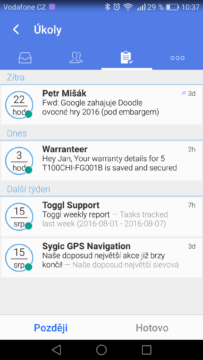 Nevyhovuje vám Gmail v Androidu? Zkuste povedenou alternativu TypeApp Hlavní stránka Recenze Recenze na aplikace Sdílejte: Jan Dolejš Publikováno: 8.8.2016 18:00 (Aktualizováno: 14.12.2022 00:06) 38 komentářů 38 Nevyhovuje vám Gmail v Androidu, ale své maily prostě v mobilním telefonu nějak spravovat musíte? Vyzkoušejte aplikaci TypeApp, která představuje velmi zajímavou alternativu. Povedená aplikace TypeApp – nejen Gmail v Androidu Alternativních klientů pro e-mail existuje pro Android celá řada, ty povedené však dokážeme spočítat na prstech jedné ruky. Dnes si přestavíme TypeApp, která má na Google Play výborné hodnocení 4,6 a doporučují ji i někteří naši čtenáři. Spravovat můžete nejen Google účty (tedy Gmail), ale samozřejmě i jiné libovolné poštovní schránky. Přidáváme nové účty snadno a rychle Po nainstalování aplikace a malém průvodci funkcí je potřeba přidat vaše e-mailové schránky. Pokud máte Gmail v Androidu, stačí jej přidat přes volbu Přidat účet Google a následně jej prostě jen vybrat ze seznamu. Není ani potřeba zadávat heslo, jen potvrdit souhlas s autorizací aplikace TypeApp. TypeApp nabízí i slušný výběr jiných poskytovatelů, u kterých stačí jen zadat přihlašovací jméno a heslo. Seznam.cz, který je v Česku nejrozšířenější, zde bohužel chybí. Přesto nám stačilo zadat pouze uživatelské jméno a heslo, TypeApp vše nastavil automaticky a správně. Oceňujeme tedy i velmi snadné přidání účtu Gmail i jiných schránek. Jednoduché a moderní prostředí TypeApp přichází s moderním, propracovaným a velice jednoduchým prostředím. Jsme přesvědčeni, že jde ještě dále než Gmail v Androidu – minimálně po stránce možností a přizpůsobení. V okně pro zprávy můžete zobrazovat jen e-maily od jedné schránky nebo od všech, které máte v telefonu. Řazení e-mailů a konverzací je podobné jako u klienta Gmail v Androidu, můžete ovšem mazat i jednotlivé zprávy uvnitř konverzací, což Gmail neumožňuje. A spoustě uživatelům to chybí. Prostřední záložkou lze zobrazit seznam kontaktů, které vám v poslední době poslali zprávu. Snadno díky tomu naleznete poslední zprávu od určitých kontaktů. Třetí záložky ukazuje funkci Úkoly, která tak trochu přidává prvky Inboxu – umožní vám odkládat e-maily na později. Představíme si ji později. Levé menu je vysouvací a nabídne nám tradičně možnost výběru schránek a složek. Nechybí pak ani vyhledávání e-mailů, mnohonásobné úpravy či přizpůsobení vzhledu. Uživatelé SuperAMOLEDů jistě ocení tmavý režim, který umožní šetřit baterii. Propracované upozornění a nastavitelná gesta Aplikace TypeApp myslí na pokročilé uživatele, kteří chtějí mít své e-maily a upozornění dokonale odlišené. Můžete tedy pro každý účet měnit styl vyzvánění a dokonce i barvu LED diody. U každého účtu lze navíc aktivovat režim Nerušit v určité dny i hodiny. Zvykli jste si na správu e-mailů pomocí tažení prstu do stran? TypeApp si s tím poradí, navíc přidává možnost nastavení voleb pro každé gesto. Úkoly a připomenutí e-mailů E-mailové zprávy často slouží jako úkoly – přichází v nich žádosti či rovnou úkoly, které je potřeba zpracovat. Mnoho z nás jistě používá svůj vlastní systém pro správu úkolů (třeba výborné GTD), úkoly si pak ale musí ručně přepisovat. Co k tomu využít rovnou TypeApp? Pokud vám taková zpráva dorazí, lze ji jednoduše označit jako úkol. A to dokonce tak, že vyberete, kdy má být úkol splněn nebo spíše připomenut. TypeApp vás v tento čas na e-mail znovu upozorní a vy se můžete pustit do jeho vyřízení. Takové e-maily naleznete v sekci Úkoly – Později. Po splnění stačí úkol označit jako Hotovo. Zajímavý doplněk k e-mailové schránce, který Gmail v Androidu nenabídne. Pokročilé možnosti nastavení Aplikace TypeApp toho nabízí opravdu hodně. Stejně tak ale umožní uživatelům nastavit si spoustu dalších funkcí a vlastností. Díky tomu si uživatelé přizpůsobí nejen vzhled aplikace, její rozložení, ale i její chování. Počínaje nastavením barevného schéma, gesty pro práci se zprávami, detailním nastavením upozornění až po konfiguraci tlačítek, výchozích účtů, potvrzení voleb a další. Vyplatí se vyhradit si čas na prozkoumání nastavení a upravit si jej podle svého. Závěr – skvělý klient, který stojí za zkoušku TypeApp nás opravdu příjemně překvapil. Nabízí moderní kabátek, příjemné prostředí, všechny důležité funkce, bonus v podobě úkolů a navíc nepřeberné množství nastavení. K dispozici je navíc úplně zdarma. Pokud patříte mezi uživatele, kteří často používají mobilní telefon pro správu e-mailů, rozhodně by vám neměl TypeApp uniknout. TypeApp mail - email app TypeApp LLC Instalovat (Free) Google Play Vyhovuje vám Gmail v Androidu? Jakého klienta používáte? O autorovi Jan Dolejš Uchvácen mobilními technologiemi a veškerým dějstvím v oblasti IT. Google Android se stal mojí srdcovou záležitostí a nehodlám se jej jen tak vzdát. S oblibou… Více o autorovi Sdílejte: 38 komentářů Vložit komentář Android e-mail Gmail Mohlo by vás zajímat Tohle jsou zatím nejlepší obrázky řady Samsung Galaxy S25! Podívejte se Adam Kurfürst 10.1. Android XR oficiálně představen! Nový operační systém bere dech, první ukázky vypadají famózně Jakub Kárník 13.12.2024 WhatsApp dokáže zlikvidovat paměť vašeho mobilu. Jak ho zkrotit? Jana Skálová 30.12.2024 Přechod na nový mobil bude jednodušší. Google přinesl na Android fantastickou novinku Jakub Kárník 27.11.2024 Konec rozdílů. Nabíjení Androidu nabíječkou z iPhonu musí od roku 2025 fungovat Peťo Vnuk 5.1. Pozo