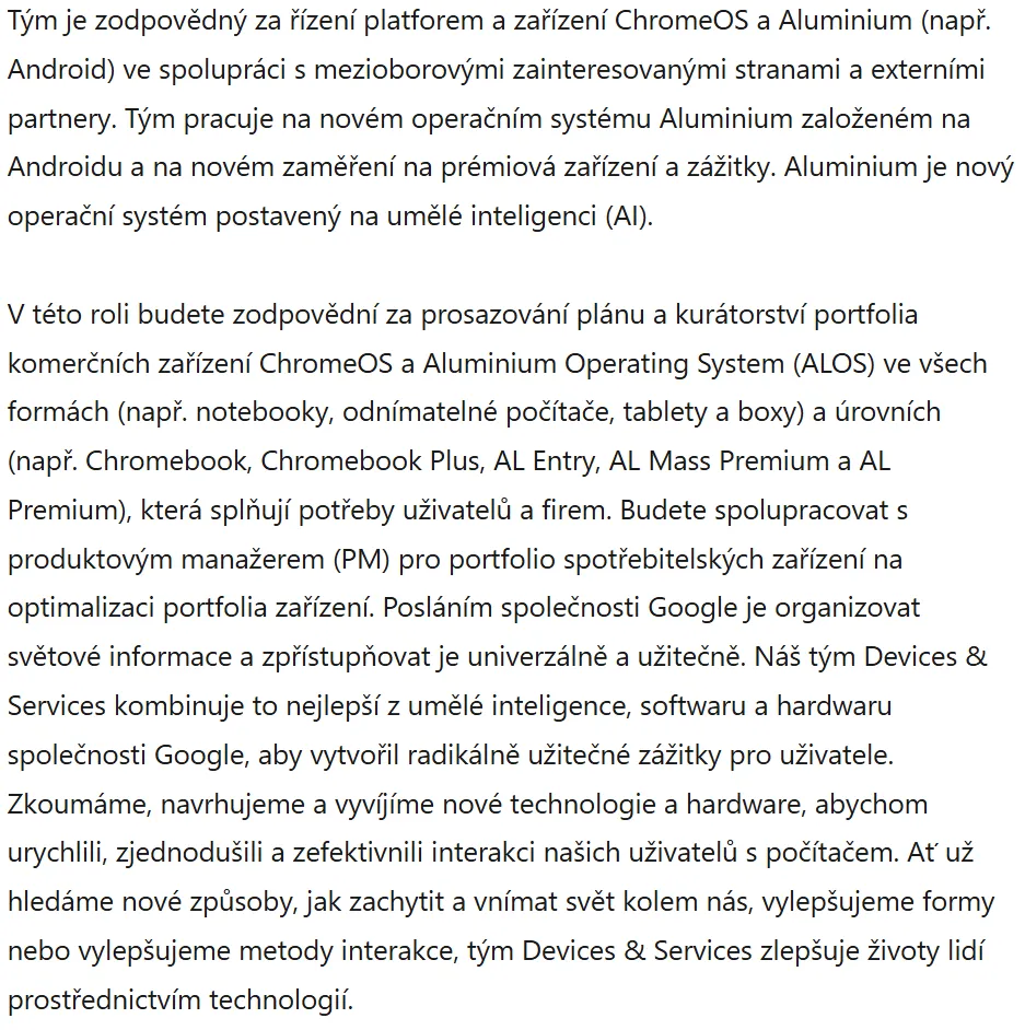 Google prozradil detaily o novém systému pro počítače. Aluminium OS vsadí na umělou inteligenci Hlavní stránka Zprávičky Google v pracovním inzerátu na LinkedInu prozradil kódové označení nového systému – Aluminium OS Nový operační systém postavený na Androidu má mít umělou inteligenci přímo v jádru Zařízení s Aluminium OS budou existovat vedle klasických Chromebooků v několika cenových kategoriích Sdílejte: Adam Kurfürst Publikováno: 25.11.2025 16:00 Žádné komentáře 0 Už několik měsíců víme, že Google pracuje na sloučení operačních systémů Android a ChromeOS. Nyní se díky pracovnímu inzerátu na LinkedInu patrně dozvídáme další podrobnosti – včetně kódového označení nového systému. Ten se interně nazývá Aluminium OS (zkráceně ALOS) a podle Googlu bude mít umělou inteligenci přímo v jádru. Pracovní inzerát prozradil více, než měl Na zajímavé detaily upozornil server 9to5Google, který si všimnul pracovního inzerátu pro pozici Senior Product Manager zaměřenou na Android laptopy a tablety. V popisu pozice Google otevřeně hovoří o systému Aluminium, který označuje jako „nový operační systém postavený na Androidu“. Popis pracovní pozice na LinkedIn (strojově přeloženo) Z inzerátu vyplývá, že tým má na starosti platformy ChromeOS i Aluminium a pracuje na „novém operačním systému s důrazem na prémiová zařízení a zážitky“. Google v textu přímo uvádí, že Aluminium je nový operační systém s umělou inteligencí v jádru. Několik cenových kategorií vedle Chromebooků Pracovní inzerát také prozrazuje, jak bude Google nová zařízení kategorizovat. Vedle stávajících Chromebook a Chromebook Plus se objevují nové úrovně: AL Entry, AL Mass Premium a AL Premium. Co se týče konkrétních typů zařízení, Google počítá s laptopy, odnímatelnými zařízeními (detachables), tablety i set-top boxy. Důležité je, že inzerát naznačuje postupný přechod z ChromeOS na Aluminium. Jedna z odpovědností uvedené pozice zahrnuje „vytvoření produktového plánu, který zajistí přechod Googlu z ChromeOS na Aluminium s kontinuitou podnikání“. To naznačuje, že klasický ChromeOS časem zcela nahradí nová platforma, ale aspoň chvíli budou koexistovat. Sloučení Androidu a ChromeOS je potvrzené Připomeňme, že Google oficiálně potvrdil plány na sloučení obou systémů již v létě. Během rozhovoru pro server TechRadar to prozradil Sameer Samat, prezident ekosystému Android v Googlu. „Budeme kombinovat ChromeOS a Android do jedné platformy,“ uvedl tehdy doslova. Dříve v tomto měsíci se pak objevily zprávy o tom, že Qualcomm pracuje na podpoře Androidu 16 pro čipy Snapdragon X Elite. Uniklý snímek interního repozitáře naznačoval, že se připravují první počítače běžící na Androidu s těmito procesory, které aktuálně pohání řadu Windows notebooků. Počítače s Androidem jsou prý v přípravě. Využít mají procesory Qualcomm Snapdragon X Adam Kurfürst Zprávičky Adam Kurfürst Zprávičky Kdy přesně Google nový systém Aluminium OS představí, zatím není jasné. Počítače s Androidem by se nicméně měly objevit v průběhu roku 2026. Co říkáte na název Aluminium OS? Zdroje: 9to5Google, LinkedIn O autorovi Adam Kurfürst Adam studuje na gymnáziu a technologické žurnalistice se věnuje od svých 14 let. Pakliže pomineme jeho vášeň pro chytré telefony, tablety a příslušenství, rád se… Více o autorovi Sdílejte: Žádné komentáře Vložit komentář Android Google operační systém Počítač Mohlo by vás zajímat Android Auto dostává první letošní aktualizaci. Co je nového? Adam Kurfürst 10.1. Google Quick Share přináší pro všechny skvělou funkci, kterou už Samsung umí dávno Libor Foltýnek 8.1. Fotky Google mají novou utajenou funkci. Už jste ji objevili? Jana Skálová 24.12.2024 Tohle jsou zatím nejlepší obrázky řady Samsung Galaxy S25! Podívejte se Adam Kurfürst 10.1. Pixel 9 Pro má problém! Některým mobilům prý odpadává fotoaparát Jana Skálová 7.1. Android XR oficiálně představen! Nový operační systém bere dech, první ukázky vypadají famózně Jakub Kárník 13.12.2024