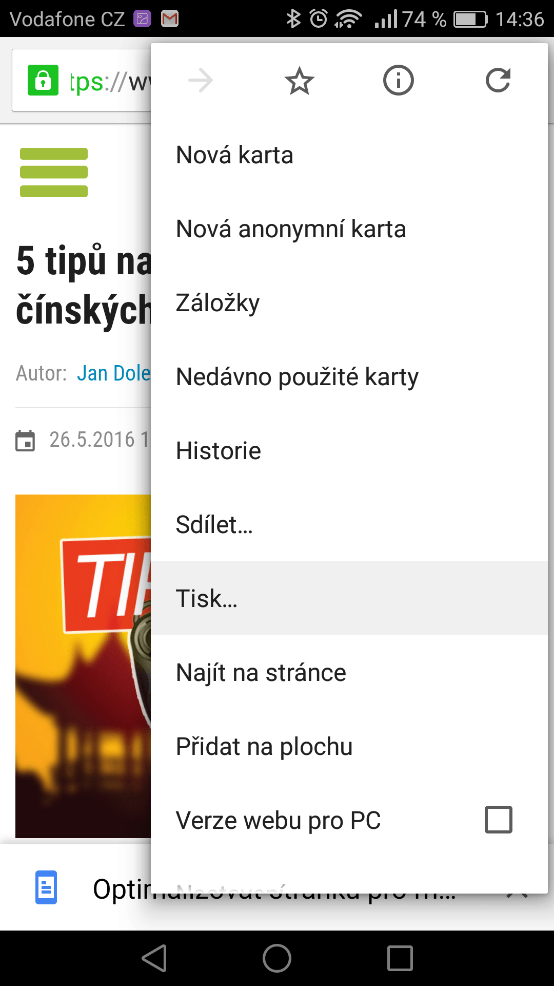 Google Chrome: 5 šikovných triků, které by měl znát každý #2 Hlavní stránka Návody Sdílejte: Jan Dolejš Publikováno: 26.5.2016 18:00 (Aktualizováno: 8.6.2016 09:32) 19 komentářů 19 Díky tomu, že je Google Chrome předinstalován v každém zařízení s Androidem, je známý téměř všem. Pojďme se podívat na dalších 5 tipů a triků, které by měl každý uživatel znát. Chrome: 5 šikovných triků, které by měl znát každý 1) Šetřete svá mobilní data Začněme funkcí, kterou spousta uživatelů zná, přesto velké části stále uniká. Google Chrome dokáže myslet i na naše skromné balíčky dat a nabízí funkci, která již na straně serveru komprimuje data stránek, a telefon tedy stahuje celkově menší objem dat. Načítání stránek je sice logicky pomalejší, na oplátku nám ale podstatně méně ubývá datový tarif. Aktivace je velmi snadná – stačí přejít pomocí tří teček v pravém horním rohu do Nastavení a zvolit Spořič dat. Zde už stačí jen funkci aktivovat. 2) Režim čtečky pro snadnější čtení Jistě jste mnohokrát při surfování narazili na stránky, které nebyly pro mobilní telefony zrovna ideálně přizpůsobeny. Text byl malý, špatně uspořádaný a čtení bylo zkrátka nepohodlné. Google Chrome s tím ale pomůže – přesněji tedy režim čtečky. Ten je se ve výchozím nastavení neukazuje, lze jej ovšem ručně vynutit v nastavení. Stačí do adresového řádku vepsat chrome://flags a v následném nastavení najít řádek Aktivace režimu čtečky a změnit volbu na Vždy. Po restartu Chromu se vám u každé stránky ve spodní části ukáže možnost optimalizovat stránku pro čtení. U některých webů to rozhodně pomůže. A jindy si toho všímat nemusíme. 3) Prohlížejte si otevřené taby z jiného zařízení Propojení Google účtu s prohlížečem Google Chrome na PC i na mobilním telefonu není žádnou novinkou. Věděli jste ale, že si můžete na mobilním zařízení snadno a rychle zobrazit záložky, které máte právě otevřené na počítači? Díky tomu lze třeba před odchodem od PC velmi snadno a rychle otevřít rozečtený článek na mobilním telefonu. Jak na to? Jako první musíte být na PC i na mobilním telefonu v prohlížeči přihlášeni ke svému účtu. Pak už stačí jen stisknout ikonu pro novou kartu, vpravo dole vybrat Nedávno použité karty a vybrat si otevřené stránky z jiných zařízení. 4) Jak uložit stránku jako PDF pro čtení offline? Sami to znáte – chcete si po cestě přečíst nějaký článek z internetu, ale náhle zjistíte, že nemáte internetové připojení. Nebo třeba narazíte na velmi zajímavé čtení, které byste si chtěli uchovat. Zase bez pozdější nutnosti internetu. Chrome to zvládne i bez jiných doplňků. Postačí otevřít stránku, kterou chcete uložit, a zvolit Tisk. Ano, opravdu Tisk. Další stránka už prozradí, že se jedná u uložení do souboru PDF, zobrazí se rovněž náhled. Šikovné a snadné. 5) Ukončení všech otevřených karet naráz S mobilními telefony dnes brouzdáme úplně běžně – není tedy vůbec žádnou zvláštností mít otevřeno zároveň několik webových stránek. Jak se jich zbavit snadno a rychle? Stačí kliknout na ikonu pro výběr běžících tabů, následně tři tečky v pravém horním rohu a zvolit Zavřít všechny karty. Věřte nebo ne, tato jednoduchá funkce je pro oči většiny uživatelů naprosto skryta. Tento způsob bude samozřejmě fungovat, jen pokud máte aktivované standardní zobrazení stránek (viz náš předchozí díl Google Chrome: 5 šikovných triků, které by měl znát každý). Znáte další šikovný trik v prohlížeči Google Chrome? Podělte se s námi v komentářích O autorovi Jan Dolejš Uchvácen mobilními technologiemi a veškerým dějstvím v oblasti IT. Google Android se stal mojí srdcovou záležitostí a nehodlám se jej jen tak vzdát. S oblibou… Více o autorovi Sdílejte: 19 komentářů Vložit komentář Google Chrome Tipy a triky triky Mohlo by vás zajímat 33 nebezpečných rozšíření pro Google Chrome shromažďuje hesla a citlivé údaje. Máme kompletní seznam! Jana Skálová 6.1. Máte Xiaomi, Redmi nebo POCO? Těchto 5 tipů a triků v MIUI musíte znát Jakub Kárník 8.12.2022 Jak psát rychleji na telefonu s Androidem? Tohle je 8 tipů pro Gboard (2024) Adam Kurfürst 10.12.2024 Ovládněte své poznámky: Jak využít Google Keep na maximum v roce 2024? Adam Kurfürst 30.11.2024 Google Chrome pro Android nyní konečně umí otevírat PDF soubory! Poradíme, jak funkci zprovoznit Adam Kurfürst 8.12.2024 Jak vypnout reklamy v telefonech od Xiaomi a proč tam vůbec jsou? Jakub Kárník 24.2.2023