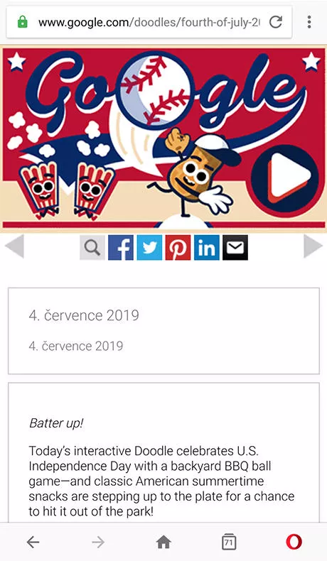Google vydává další Doodle, tentokrát pro Den nezávislosti Hlavní stránka Zprávičky Sdílejte: Barbora Koďousková Publikováno: 4.7.2019 12:00 Žádné komentáře 0 Doodles, alternativní logo a minihry spojené se stránkou vyhledávače Google mají svou tradici již od roku 1998. Google v rámci speciálních příležitostí, mění vzhled svého vyhledávače a připravuje pro své uživatele nejrůznější minihry. Zpočátku se jednalo jen o mezinárodní události a významné dny spojené s USA, postupem času však začal vnímat také svátky v ostatních zemích. Můžeme se tak setkat i s Doodles připravených speciálně pro Českou republiku. Nejnovější Doodle vychází 4. července, který je v USA spojený s Dnem nezávislosti a Google pro tuto příležitost připravil svou další minihru, z prostředí baseballu. Zahrát si ji můžeme i u nás. Zkraťte si pracovní odpoledne s Google Doodle Google dnešní Doodle připravil k oslavě Dne nezávislosti v USA spojeného s podpisem Deklarace nezávislosti, je proto primárně určen právě pro Spojené státy. Minihru si však můžeme zahrát i u nás v Česku. Najdete ho pod tlačítkem „Zkusím štěstí“ na stránce vyhledávače Google, případně v archivu Doodles. Tématem dnešního Doodle je baseball. Dostáváte se tak do role pálkaře, který má za úkol odpálit míček a proběhnout mety hřiště. Na pálce se postupně střídají všichni členové týmu. Patří mezi ně hotdogy, kečupy a další motivy spojené s barbeque, které se obvykle v USA na Den nezávislosti pořádají. Hra se ovládá stisknutím modrého kulatého tlačítka ve spodní části obrazovky. S jeho stisknutím byste měli počkat až do chvíle, kdy nadhazovač skutečně míček vyhodí, jinak se může stát, že minete a dostanete strike. Se ziskem tří striků hra končí a začíná znovu. Nejnovější Doodle je tak zaměřen především na zkoušku vašeho postřehu. Své výsledky můžete následně sdílet dál. Smyslem Doodles však není jen změna vzhledu vyhledávače Google a vytvoření speciální minihry. Typicky slouží také pro připomenutí významných národních a mezinárodních událostí proto, aby si uživatelé uvědomili, proč vlastně nejdou ten den do práce a do školy. Jinak tomu není ani v tomto případě. Po skončení Doodle hry na vás vyskočí obrazovka se třemi tlačítky, jedno umožňuje sdílení výsledků na sociální sítě, druhým začnete hrát novou hru a třetí vás odkáže do vyhledávače Google, kde se zobrazí informace týkající se Dne nezávislosti. Google Google LLC Instalovat (Free) Google Play Hrajete minihry Doodle? Jaké je vaše skóre? O autorovi Barbora Koďousková Už jako malá propadla kouzlu počítačů a probouzejících se technologií. Své nejnovější poznatky vždy nadšeně sdílela se svým okolím. Přes svůj první, tlačítkový telefon Ericsson… Více o autorovi Sdílejte: Žádné komentáře Vložit komentář Doodle Google svátek Vyhledávač Google Mohlo by vás zajímat Android Auto dostává první letošní aktualizaci. Co je nového? Adam Kurfürst 10.1. Google Quick Share přináší pro všechny skvělou funkci, kterou už Samsung umí dávno Libor Foltýnek 8.1. Fotky Google mají novou utajenou funkci. Už jste ji objevili? Jana Skálová 24.12.2024 Pixel 9 Pro má problém! Některým mobilům prý odpadává fotoaparát Jana Skálová 7.1. Předpověď počasí vstupuje do nové éry. Google představil převratnou technologii a uvolnil ji zdarma Jakub Kárník 6.12.2024 Android Auto dostává nový hudební přehrávač. Mrkněte, jak vypadá Adam Kurfürst 29.12.2024