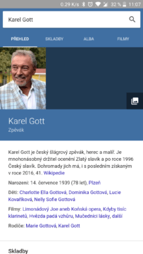 Další změny se dočkalo samotné vyhledávání, kde nyní najdete informační karty. Nejlépe se to dá ukázat na známých osobnostech, filmech, seriálech apod. Když nyní zadáte například jméno Karel Gott, tak úplně na prvním místě najdete právě informační karty. Ty nabízí krátký popis o tom, kdo je to Karel Gott a základní informace. Pak se ale jednoduchým přesunem prstu podívat na písničky tohoto zpěváka a také alba. A protože Google ví, že se Gott věnoval i herectví, tak v poslední záložce jsou filmy, ve kterých hrál.