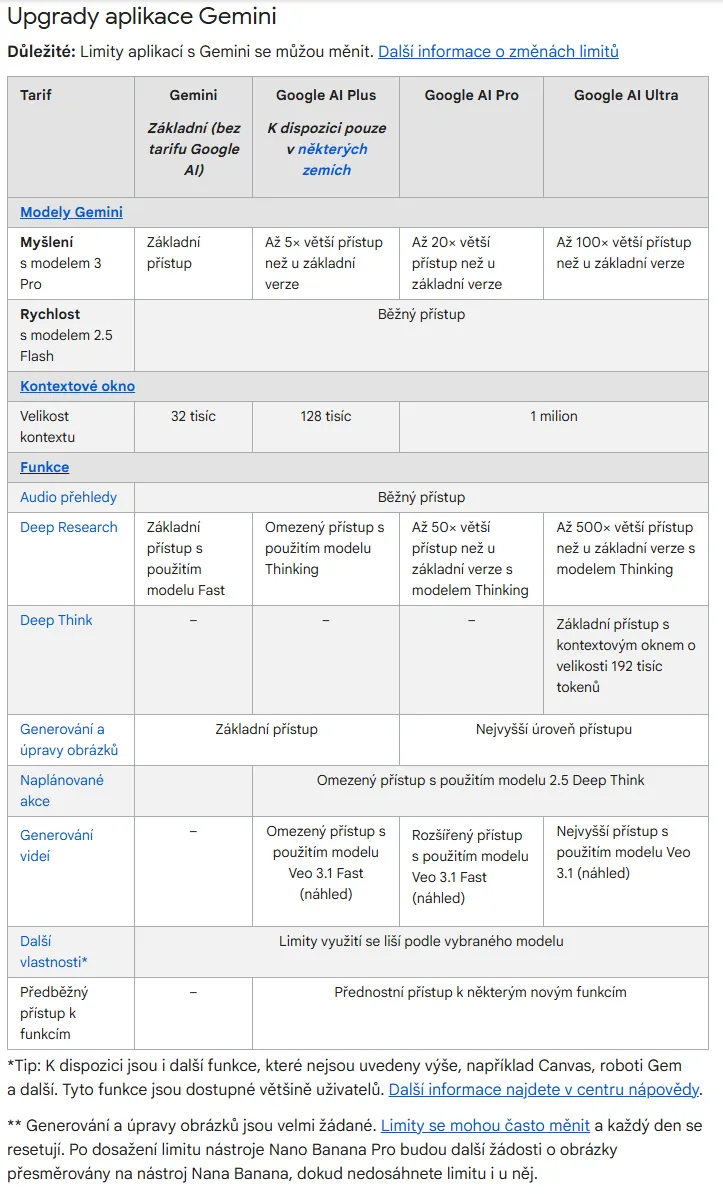Google zdánlivě omezuje Gemini 3 Pro uživatelům bez předplatného, zřejmě kvůli nadměrnému zájmu Hlavní stránka Zprávičky Google snížil denní limity pro bezplatné uživatele modelu Gemini 3 Pro kvůli vysoké poptávce Původní limit 5 promptů denně nahradil vágní „základní přístup" s měnícími se limity Omezení se dotkla také generování obrázků přes Nano Banana Pro a některých funkcí NotebookLM Sdílejte: Adam Kurfürst Publikováno: 29.11.2025 10:00 Žádné komentáře 0 Nedlouho po uvedení svého nejnovějšího modelu umělé inteligence Gemini 3 Pro přistoupil Google k omezení přístupu pro účty bez předplatného. Důvodem je podle všeho masivní zájem, který překročil kapacity serverů společnosti. Neplatící uživatelé tak nyní čelí nejasným limitům, které se mohou měnit ze dne na den. Z pěti promptů denně na „základní přístup" NotebookLM přišel o nové funkce Kdy se limity vrátí do normálu? Z pěti promptů denně na „základní přístup“ Při spuštění Gemini 3 Pro měli uživatelé bez pořízeného tarifu k dispozici až 5 promptů denně, což odpovídalo předchozím limitům pro Gemini 2.5 Pro. Google nicméně v posledních dnech aktualizoval svou stránku podpory a nahradil konkrétní číslo vágní informací Základní přístup s poznámkou, že se denní limity mohou často měnit. Podobná změna postihla i Nano Banana Pro, tedy model pro generování obrázků postavený právě na novém Gemini 3 Pro. Původní limit 3 obrázků denně klesl na pouhé 2 obrázky. Google k tomu přidal upozornění, že generování a úprava obrázků jsou aktuálně velmi žádané a limity se budou resetovat každý den. Zatímco uživatelé bez předplatného čelí nejistotě ohledně denních limitů, předplatitelé tarifů Google AI Pro a Google AI Ultra mají situaci jednodušší. Tarif Pro nabízí až 100 promptů denně pro Gemini 3 Pro a stejný počet obrázků přes Nano Banana Pro. Ultra předplatitelé pak mají k dispozici až 500 promptů a 1 000 obrázků denně. NotebookLM přišel o nové funkce Jak upozornil server 9to5Google, kapacitní problémy se dotkly i služby NotebookLM. Google zde dočasně odebral bezplatným uživatelům přístup k novým funkcím Infografika a Prezentace, které využívají právě model Nano Banana Pro. Předplatitelé tarifu Pro pak sice k funkcím přístup mají, ale také musí počítat s dodatečnými omezeními. Kdy se limity vrátí do normálu? Google zatím neoznámil, kdy hodlá obnovit původní limity pro „neplatiče“. S ohledem na probíhající vánoční sezónu, kdy zájem o nové technologie tradičně vrcholí, se dá očekávat, že k návratu k původním hodnotám dojde nejdříve začátkem ledna. Do té doby budou muset uživatelé bez předplatného počítat s omezeným přístupem k nejnovějšímu modelu Gemini. Překvapilo vás omezení přístupu k Gemini 3 Pro? Zdroje: Google, 9to5Google, Android Police, GSMArena O autorovi Adam Kurfürst Adam studuje na gymnáziu a technologické žurnalistice se věnuje od svých 14 let. Pakliže pomineme jeho vášeň pro chytré telefony, tablety a příslušenství, rád se… Více o autorovi Sdílejte: Žádné komentáře Vložit komentář AI Gemini Google Umělá inteligence Mohlo by vás zajímat Android Auto dostane schopnějšího asistenta! Takto (zhruba) vypadá Gemini v akci Adam Kurfürst 9.1. Android Auto dostává první letošní aktualizaci. Co je nového? Adam Kurfürst 10.1. Google Quick Share přináší pro všechny skvělou funkci, kterou už Samsung umí dávno Libor Foltýnek 8.1. Fotky Google dají uživatelům větší kontrolu, chyby AI půjde opravit Libor Foltýnek 10.1. Roztomilý robůtek od Samsungu zamíří do domácností. Malý AI asistent pomůže zahnat nudu i samotu Jana Skálová 9.1. Google se chystá nasadit Gemini na chytré hodinky s Wear OS. Můžeme čekat češtinu? Libor Foltýnek 8.1.