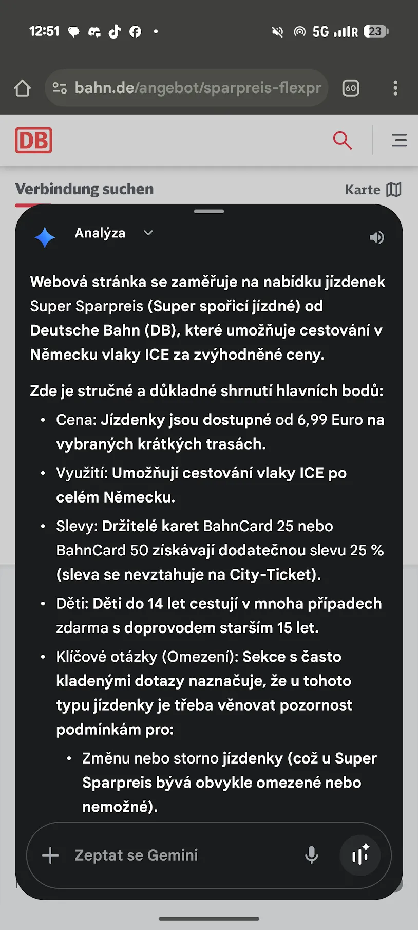 Google Gemini vám na Androidu nyní vytvoří souhrn stránky na jedno kliknutí. Jak to funguje? Hlavní stránka Zprávičky Google přidává do překrytí Gemini tlačítko pro okamžité shrnutí webových stránek Nová funkce je dostupná v prohlížeči Chrome pro Android a šíří se mezi uživatele Generování souhrnu trvá přibližně 15 sekund a používá model Gemini 2.5 Flash Sdílejte: Adam Kurfürst Publikováno: 14.10.2025 22:00 Žádné komentáře 0 Prohlížení dlouhých článků na mobilním telefonu může být někdy zdlouhavé. Google proto do překrytí Gemini v Chrome pro Android přidává nové tlačítko Shrnout stránku, které dokáže během několika sekund vytvořit stručný souhrn celé webové stránky. Rychlé shrnutí na jedno kliknutí Když v Chrome na Androidu aktivujete překrytí Gemini, nad textovým polem se nyní zobrazují tři tlačítka. Mezi stávajícími možnostmi Sdílet obrazovku s režimem Live a Zeptat se na stránku přibylo nové tlačítko Shrnout stránku. Po jeho stisknutí se spustí barevná animace a během přibližně 15 sekund Gemini vygeneruje souhrn celého obsahu webové stránky. Jako první na novinku upozornil server 9to5Google, funkce se však již začíná objevovat i na zařízeních v našich končinách. Na mém Google Pixelu 9 Pro XL je tlačítko již dostupné, což naznačuje postupné rozšiřování mezi všechny uživatele. Jak funkce funguje v praxi Souhrn se zobrazí v plovoucím okně, které můžete rozbalit pro zobrazení celého textu. Zajímavostí je, že funkce vždy využívá model Gemini 2.5 Flash, bez ohledu na to, jaký model máte nastavený v samotné aplikaci Gemini. Po vygenerování souhrnu můžete pokládat doplňující otázky přímo k obsahu stránky. Nabídka, která se neodmítá. Studenti v Česku dostanou pokročilou Google AI a 2 TB místa na rok zdarma Adam Kurfürst Zprávičky Adam Kurfürst Zprávičky Praktické využití ocení zejména ti, kdo často čtou dlouhé odborné články, recenze produktů nebo rozsáhlé návody. Místo procházení desítek odstavců získáte během několika sekund přehled o hlavních bodech. Funkce se hodí také při rychlém průzkumu více zdrojů k jednomu tématu nebo když potřebujete rychle zjistit, zda článek obsahuje informace, které hledáte. Dostupnost nové funkce Google funkci oznámil v září 2025 společně s uvedením Gemini do Chrome pro Windows a Mac. Na Androidu se nyní začíná postupně objevovat u všech uživatelů. Tlačítko se zobrazuje nejen při prohlížení běžných webových stránek, ale také při čtení článků z Google Discover, výsledků vyhledávání nebo zpráv v aplikaci Google News. Používáte Gemini pro práci s webovými stránkami? Zdroje: 9to5Google, Android Authority, vlastní O autorovi Adam Kurfürst Adam studuje na gymnáziu a technologické žurnalistice se věnuje od svých 14 let. Pakliže pomineme jeho vášeň pro chytré telefony, tablety a příslušenství, rád se… Více o autorovi Sdílejte: Žádné komentáře Vložit komentář AI Gemini Google Umělá inteligence Mohlo by vás zajímat Android Auto dostane schopnějšího asistenta! Takto (zhruba) vypadá Gemini v akci Adam Kurfürst 9.1. Android Auto dostává první letošní aktualizaci. Co je nového? Adam Kurfürst 10.1. Google Quick Share přináší pro všechny skvělou funkci, kterou už Samsung umí dávno Libor Foltýnek 8.1. Fotky Google dají uživatelům větší kontrolu, chyby AI půjde opravit Libor Foltýnek 10.1. Roztomilý robůtek od Samsungu zamíří do domácností. Malý AI asistent pomůže zahnat nudu i samotu Jana Skálová 9.1. Google se chystá nasadit Gemini na chytré hodinky s Wear OS. Můžeme čekat češtinu? Libor Foltýnek 8.1.