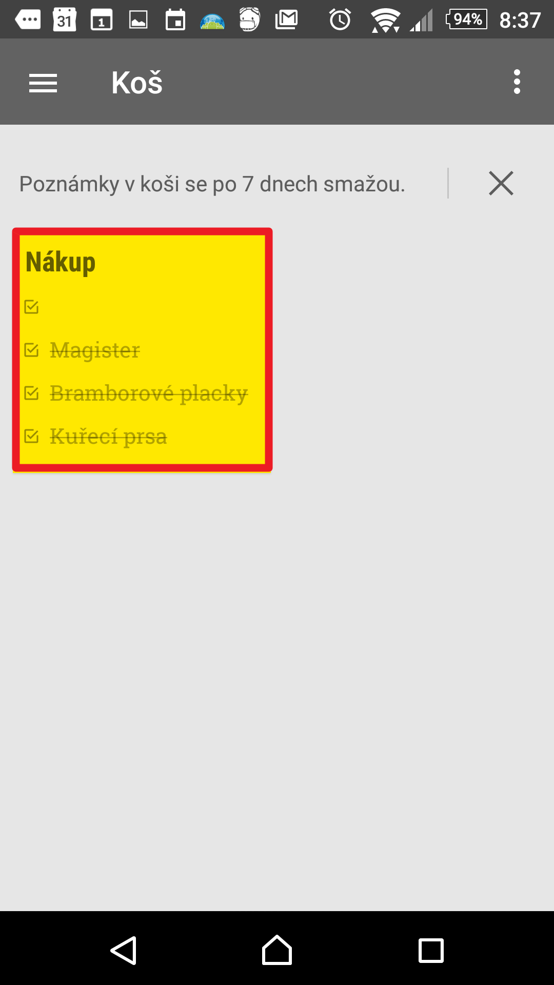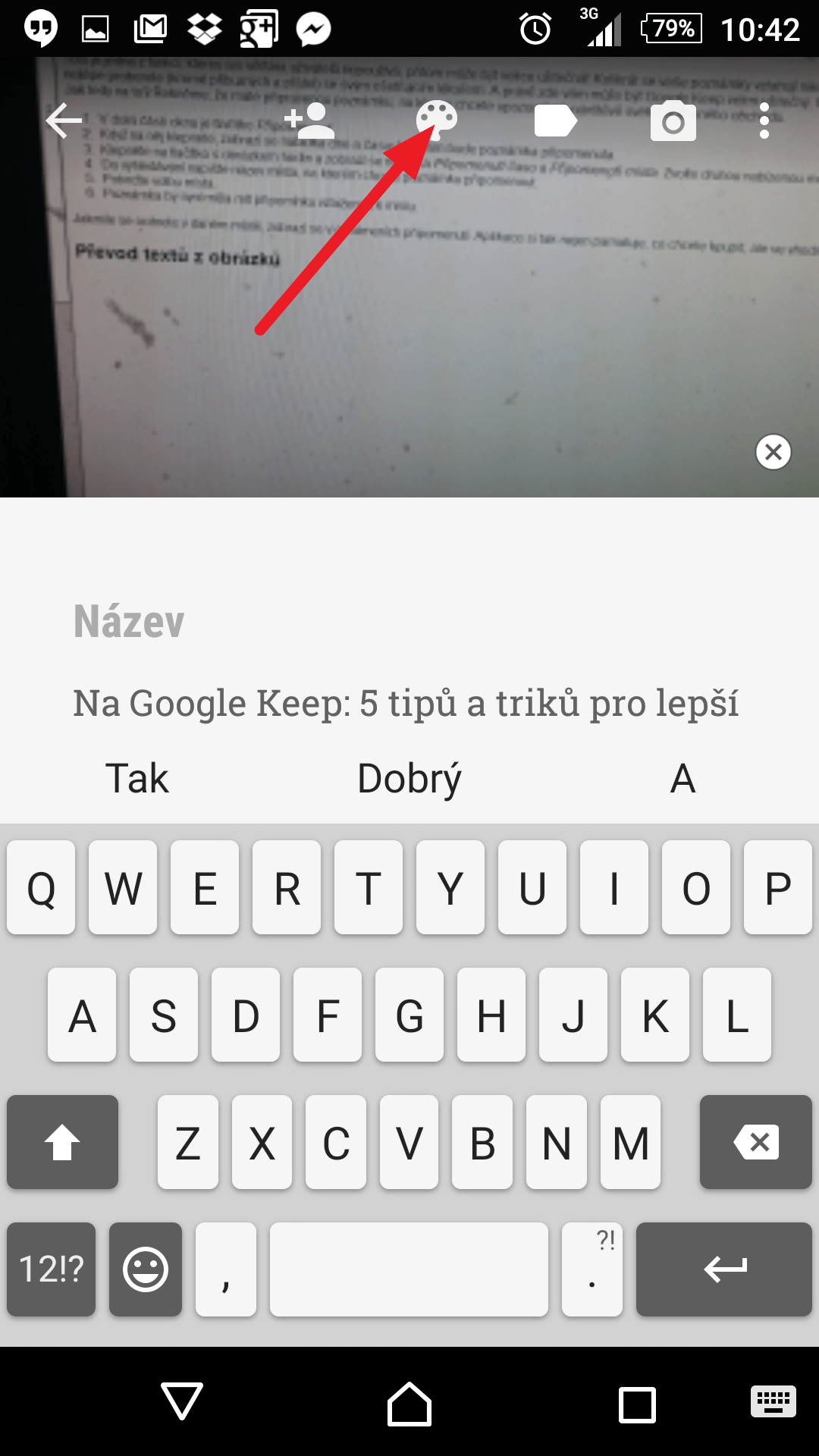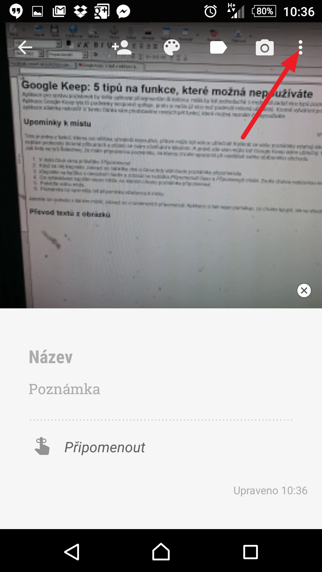 Google Keep: 5 tipů na funkce, které možná nepoužíváte či neznáte Hlavní stránka TOP Sdílejte: Karel Kilián Publikováno: 31.7.2015 12:00 (Aktualizováno: 27.8.2015 14:43) 32 komentářů 32 Aplikace pro správu poznámek by měla splňovat přinejmenším tři kritéria: měla by být jednoduchá s možností zadat více typů poznámek, schopná provozu na více platformách (přinejmenším mobil a web) a neměla by zabírat příliš mnoho místa v úložišti a operační paměti. Aplikace Google Keep tyto tři podmínky naplňuje beze zbytku, proto si našla již více než padesát milionů uživatelů. Kromě vytváření prostých textových poznámek, zvládá také odrážkové „odškrtávací“ seznamy, zadávání hlasem a přidávání fotografií. Tím ale možnosti tohoto nástroje zdaleka nekončí! V tomto článku vám představíme rovných pět funkcí, které možná neznáte či nepoužíváte. Google Keep umí textové poznámky, odrážkové seznamy, zadávání hlasem a přidávání fotografií. Upomínky k místu Toto je jedna z funkcí, kterou asi většina uživatelů nepoužívá, přitom může být velice užitečná! Kolikrát se vaše poznámky vztahují nikoli k datu a času, ale ke konkrétnímu místu? Například rohlíky a mléko budete chtít patrně koupit v obchodě s potravinami. Své zdravotní obtíže nejlépe proberete (kromě příbuzných a přátel) se svým ošetřujícím lékařem. Slíbili jste rodičům opravu počítače „až přijedete na návštěvu“? A právě zde vám může být Google Keep velmi užitečný. Umí totiž upozornit na danou poznámku v momentě, kdy se objevíte v určeném místě. Jak tedy na to? Řekněme, že máte připravenou poznámku, na kterou chcete upozornit při návštěvě svého oblíbeného obchodu. V dolní části okna je tlačítko Připomenout. Když na něj klepnete, zobrazí se nabídka dne a času, kdy vám bude poznámka připomenuta. Klepněte na tlačítko s obrázkem hodin a zobrazí se nabídka Připomenutí času a Připomenutí místa. Zvolte druhou nabízenou možnost. Tlačítko Připomenout Klepněte na tlačítko s obrázkem hodin Zvolte Připomenutí místa Do vyhledávání napište název místa, na kterém chcete poznámku připomenout. Potvrďte volbu místa. Poznámka by nyní měla mít připomínku vztaženou k místu. Napište název místa Potvrďte volbu místa Připomínka vztažená k místu Jakmile se ocitnete v daném místě, zobrazí se v oznámeních připomenutí. Aplikace si tak nejen pamatuje, co chcete koupit, ale ve vhodný moment vám také tuto informaci předloží. Převod textů z obrázků Pokud chcete do poznámek uložit text – například z učebnice, knihy, prospektu, prezentace, … – můžete samozřejmě udělat fotku a přiložit ji k poznámce. Pokud ale budete s textem chtít dále pracovat – například ho citovat, zařadit do dalších dokumentů či materiálů – má Google Keep velmi užitečnou pomůcku. Namísto pracného opisování využijte funkci rozpoznávání textů. Tato funkce však vyžaduje funkční připojení k Internetu a (pochopitelně) fotografii, snímek obrazovky nebo jiný obrázek, který obsahuje text. Jak tedy na to? Vytvořte v Google Keep novou poznámku a připojte k ní obrázek. Připojte k poznámce obrázek Pořiďte nebo vyberte obrázek Zvolte obrázek z galerie Poté, co bude dokončeno nahrávání obrázku, otevřete kontextovou nabídku. Zvolte položku Načíst text z obrázku. Text z obrázku bude následně převeden do obsahu poznámky, kde ho můžete dále upravovat. Otevřete kontextovou nabídku Zvolte položku Načíst text z obrázku Text převedený do poznámky Kvalita převodu samozřejmě závisí na mnoha faktorech – především na čitelnosti předlohy. Na základě zběžného testu však můžeme konstatovat, že výsledky jsou poměrně uspokojivé. Barvy pro lepší přehled Díky barvám budou vaše poznámky nejen lépe vypadat, ale lze je tímto způsobem také kategorizovat. Stačí jen několik klepnutí a vaše poznámka může mít jednu z osmi barev – na výběr je bílá, červená, oranžová, žlutá, šedá, modrá, zelenomodrá a zelená. Expert na produktivitu Mike Vardy doporučuje používat barvy pro snadnější orientaci. Sám přitom používá čtyři barvy pro čtyři kategorie: osobní, pracovní, jiné a dokončené. Můžete také rozdělit úkoly do několika kategorií a přiřadit každé kategorii jednu barvu. Pak bude pro vás snazší rozhodnout se, který úkol byste měli udělat jako první. Barvu poznámce přiřadíte takto: Vytvořte v Google Keep novou poznámku, nebo otevřete již existující. V horním panelu nástrojů klepněte na tlačítko s malířskou paletou. Zvolte barvu dle svých představ či pravidel. Klepněte na tlačítko s malířskou paletou Nabídka osmi barev Zvolte barvu dle svých představ či pravidel Obarvená poznámka Obarvená poznámka Obarvená poznámka Pokud si v barvách zavedete nějaký řád, uvidíte, o kolik lépe se vám bude v aplikaci orientovat. Obnova smazaných poznámek Pokud omylem odstraníte poznámku z Google Keep, můžete ji obnovit. Hned na začátek ale nezapomeňme na jeden důležitý fakt: totiž že obnovení je možné pouze do sedmi dnů od smazání. Chcete-li obnovit smazanou poznámku, postupujte takto: Otevřete postranní nabídku. Přejděte do sekce Koš. Vyberte poznámku, kterou chcete obnovit. Otevřete postranní nabídku Přejděte do sekce Koš Vyberte poznámku, kterou chcete obnovit Po výběru poznámky uvidíte v pravém horním rohu obrázek škrtnutého koše. Klepněte na toto tlačítko pro obnovení poznámky. Klepněte na ikonu se škrtnutým košem Poznámka byla obnovena Koš je prázdný Jednoduchá spolupráce s dalšími uživateli Chcete-li některou z poznámek sdílet s dalším uživatelem (hodí se například v dom
