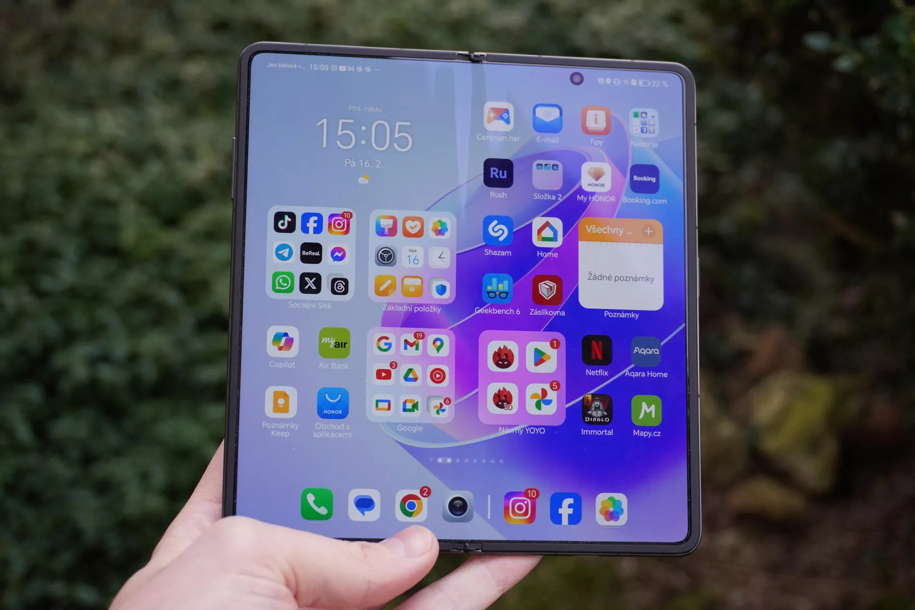 Honor Magic V2: Futuristický sen, který uchvátí i největší odpůrce skládaček (recenze) Hlavní stránka Recenze Recenze telefonů Honor Magic V2 dorazil do Číny už loni v létě a nedávno zamířil konečně i na český trh Ambiciózní skládačka vás dostane futuristickou konstrukcí i kvalitními fotoaparáty Díky praktickému poměru stran ho lze používat jako standardní mobil Sdílejte: Jakub Kárník Publikováno: 18.2.2024 12:00 Žádné komentáře 0 Honor Magic V2 se v Číně představil už v loni v létě, na evropské trhy však míří ambiciózní skládačka až nyní. Nutno však hned ze startu říct, že právě pozdní dostupnost je jedna z mála nevýhod tohoto zařízení. Mám vyzkoušené všechny ohebné Samsungy a se čtvrtým Foldem jsem žil téměř rok. Po přibližně třítýdenním testování konkurence mám jednoznačný závěr, který budu prezentovat v následujících řádcích. Recenze Honor Magic V2 Obsah balení je téměř kompletní Zdaleka nejlepší konstrukce široko daleko Oba displeje zaujmou na první pohled Výkonu je i přes loňský hardware dostatek MagicOS 7.2 umí dobře pracovat s foldables Výdrž baterie patří k nejlepším ve své třídě Fotoaparáty jsou velmi dobré a zábavné Cena a dostupnost Honor Magic V2 Závěrečné zhodnocení Obsah balení je téměř kompletní Honor Magic V2 se pyšní stylovou a celkem velkou krabičkou. Ještě před rozbalením jsem si myslel, že je zde vše potřebné, ale v jedné věci jsem se přece pletl – chybí bohužel nabíjecí adaptér, který by měl být u takto drahého zařízení standardem, zvlášť když podporuje specifikace 66W nabíjení. Originální vyjde ale v obchodě asi na pětistovku, takže to v porovnání s investicí do zařízení není nic závratného. A nutno zmínit, že konkurence v podobě Foldu na tom není lépe. Naopak. Honor do krabičky přibalil kromě USB-C kabelu také moc pěkné pouzdro imitující kůži. Je navíc tenké, působí kvalitně a disponuje stojánkem, který můžete ocenit nejen na pouštění videí, ale třeba také při delším videohovoru. Snad jen škoda, že je chráněna jen jedna část telefonu, Samsung dodává k Foldu i druhou část pouzdra, která chrání boční rám i po otevření. Honor Magic V2: Specifikace Specifikace Honor Magic V2 Vnější displej 6,43″ 10bitový LTPO OLED, 2376 x 1060, 120 Hz, 2500 nitů (špička), HDR10+, Always-On Vnitřní displej 7,92″ 10bitový LTPO OLED, 2344 x 2156, 120 Hz, 1600 nitů (špička), HDR10+, IMAX Enhanced Rozměry a váha 156.7 x 145.4 x 4.7 mm (otevřený), 156.7 x 74.1 x 9.9 mm (složený), 231 gramů Čipset Qualcomm Snapdragon 8 Gen 2 Paměť 16 GB LPDDR5X RAM, 512 GB UFS 4.0 Software Android 13, MagicOS 7.2 Baterie 5000mAh, 66W kabelové nabíjení Zadní fotoaparáty 50MP širokoúhlý, 20MP teleobjektiv (2,5x), 50MP ultraširoký Selfie kamery 16MP (vnější displej) 16MP (vnitřní displej) Konektivita Wi-Fi 6E, Bluetooth 5.3, GPS, NFC, Dual SIM, infraport Tělo Hořčík, titan, sklo a umělá kůže Certifikace chybí Stylus chybí Reproduktory 2x stereo Cena od 48 990 Kč Zdaleka nejlepší konstrukce široko daleko Předně kratší intermezzo a můj názor na ohebné telefony – asi rok jsem žil po boku Galaxy Z Foldu4 (a předtím Foldu2). Nové technologie a ohebné konstrukce mě vždy bavily, avšak po představení Ultry od Samsungu jsem zakotvil u telefonu s tradičním form factorem. Zjistil jsem totiž, že mi ohebný telefon nedává nic zásadního navíc, naopak je jeho tloušťka občas přítěž, práce na tenkém displeji není nic moc a ne vždy můžete/chcete používat vnitřní panel. Na loňském MWC jsem měl možnost pár minut využívat Oppo Find N2, které mi bylo celkově sympatičtější než Fold a u Honoru mám ten pocit ještě větší. Když držím v ruce Fold a Magic V2, mám pocit, že telefon od Honoru je o pár let novější produkt. A to hlavně díky až neuvěřitelné tenkosti (narvání 5000mAh akumulátoru do tak tenkého a v porovnání s ostatními skládačkami poměrně lehkého telefonu je mimo moje chápání) a velkému vnějšími displeji. Honor Magic V2 můžete totiž úplně v pohodě používat jako normální telefon, který jen tak mimochodem lze i rozložit. Honor Magic V2 můžete totiž úplně v pohodě používat jako normální telefon, který jen tak mimochodem lze i rozložit. O tom ale budu mluvit až později. Samotná konstrukce je naprosto špičková, nalezneme zde jen ty nejlepší materiály (konkrétně hořčík s titanem) a tato konkrétní testovaná černá verze se zády z umělé kůže a bronzovým ohraničením fotoaparátů, vypadá výborně. A to nejsem veliký fanoušek černých telefonů. Pojďme se ale ještě na okamžik zastavit u rozměrů. Ve složeném stavu totiž Honor Magic V2 disponuje tloušťkou pouhých 9,9 mm, což je oproti 13,4 mm u Foldu markantní rozdíl. Vedle Magic V2 používám také Galaxy S24 Ultra, který má tloušťku 8,6 mm, takže už možná chápete, proč čínská skládačka opravdu začíná připomínat v zavřeném stavu standardní telefon. Na velké placky jsem zvyklý, Honor je navíc oproti Ultře dramaticky menší, takže mi přesedlání na něj nedělalo žádný problém, ba naopak je díky skvělému rozložení váhy pocitově lehčí (přestože Ultra váží pouze o gram více). Po rozložení se dostaneme na absurdně nízkou hodnotu 4,7 mm, přesto ale telefon působí v ruce dobře a nemáte pocit, že byste jej každým přehmatem ohnuli. Jestliže jste tedy vlastníkem nějakého velkého telefonu a bojíte se, že by vám Honor kvůli rozměrům vadil, můžete s klidem tuto obavu nechat plavat. Snad jen pokud nosíte úzké džíny, kde může hrát každý milimetřík rozdíl. Ale předpokládám, že ani do nich nervete telefon silou. Nutno také zmínit, že v zavřeném 