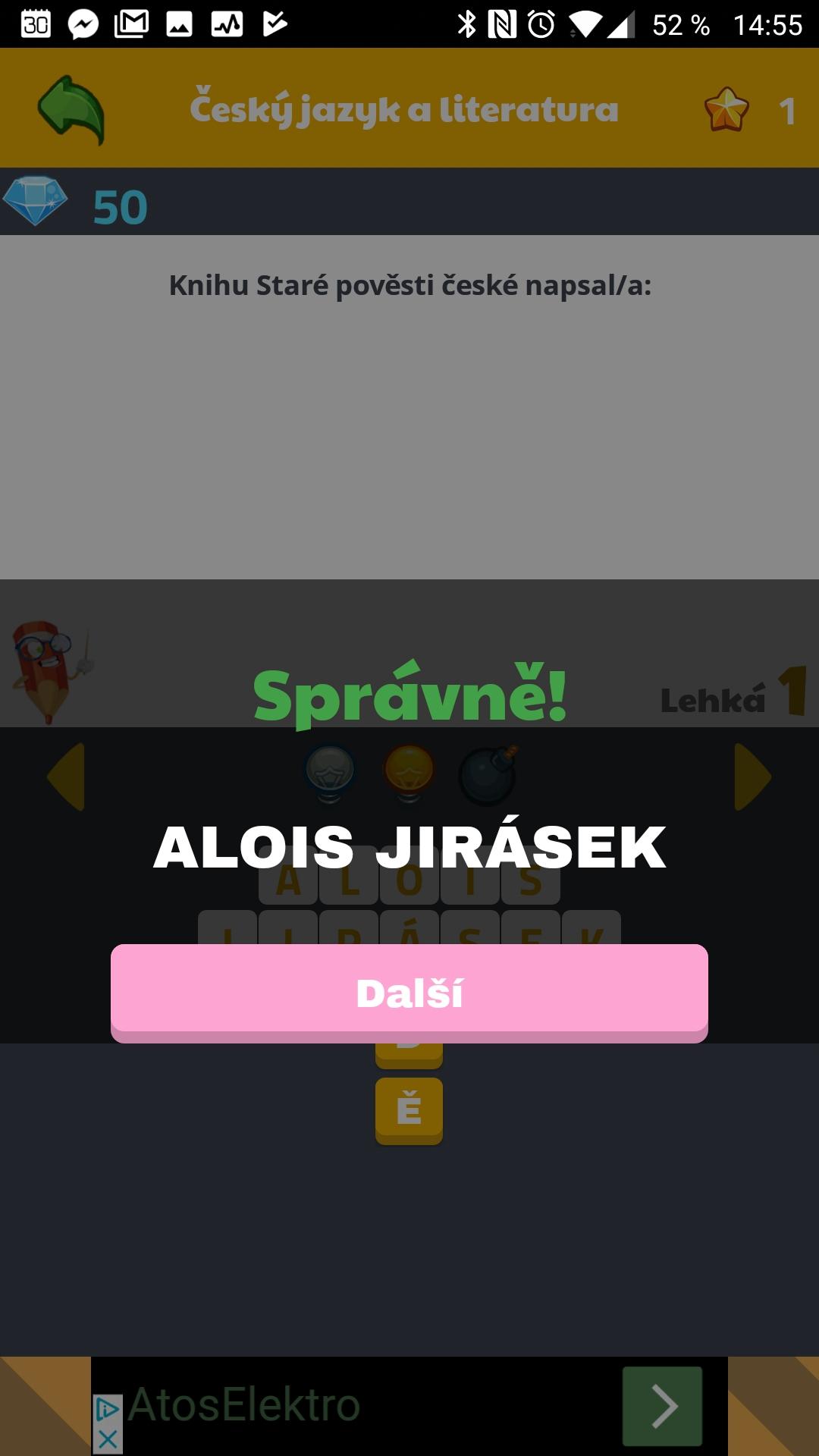Hra Vědomostní kvíz: potrapte své mozkové závity Hlavní stránka Recenze Recenze her Sdílejte: Karel Kilián Publikováno: 2.10.2018 16:07 9 komentářů 9 Vyzkoušejte své znalosti a rozšiřte si obzory díky nové české aplikaci Vědomostní kvíz! Čeká na vás několik tisíc otázek ve třech úrovních obtížnosti z celé řady oborů. A na co se ještě můžete těšit? Na to vám odpovíme v této recenzi. Obsah článku Co aplikace slibuje? Jak hra funguje v praxi? Resumé Co aplikace Vědomostní kvíz slibuje? V popisku v Obchodě Play autoři slibují, že potrápí vaše mozkové závity otázkami z osmi oborů. Jsou to: dějepis český jazyk a literatura fyzika a chemie biologie zeměpis sport U vědomostních her je důležité, aby uživatelé dobře rozuměli jejich textům. A právě to je hlavní devizou programu Vědomostní kvíz – všechny otázky i odpovědi jsou totiž v naší mateřštině. Jak hra funguje? Po spuštění se ocitnete na úvodní obrazovce, kde jsou připravena dvě tlačítka: jedním aplikaci ukončíte, druhým spustíte kvíz. V dalším kroku dostanete na výběr ze šesti kategorií, které jsme vyjmenovali v předchozí kapitole. Poté již můžete volit ze tří úrovní obtížnosti mezi lehkou, střední, nebo těžkou. V téměř každé je připraveno více než sto otázek, reprezentovaných kartičkami s čísly. Ty, které jste již zvládli zodpovědět, jsou označeny zelenou „fajfkou“. Po otevření se zobrazí otázka a vaším úkolem bude sestavit do tajenky správnou odpověď z písmenek, která jsou k dispozici. Písmen je vždy o něco více, než budete potřebovat, aby to nebylo zase tak jednoduché. Při špatné odpovědi se můžete opravit, po správné lze rovnou pokračovat na další otázku. Samozřejmě jsou k dispozici nápovědy, a to hned tři. Zadarmo si můžete nechat vyplnit náhodná políčka. Další nápověda odstraní písmena, která jsou navíc, ale bude vás stát jeden kredit (do začátku hry máte 50 kreditů). Nejdražší je vyplnění celé „tajenky“ za dva kredity. Jistě není bez zajímavosti, že hra nenabízí nákup kreditů za skutečné peníze – to je rozhodně plus! Tímto způsobem postupně procházíte Vědomostní kvíz a odpovídáte na otázky, to vše bez jakéhokoli stresu či časového tlaku. Jedinou komplikací celé hry jsou malá písmenka, naměstnaná na sebe, kvůli čemuž často dochází k přehmatům (hru jsme hráli na OnePlus 5 s 5,5″ obrazovkou). Resumé Hra je velice jednoduchá, takže ji bez problémů zvládnou i začínající uživatelé. Líbí se nám členění do kategorií a tři úrovně obtížnosti, takže si na své přijde asi každý. Zadávání písmenek, které do značné míry připomíná například Pixwords, je intuitivní a lehce usnadňuje hledání správné odpovědi. Bohužel kvůli velikosti a blízkosti tlačítek často dochází k přehmatům. Nápad je to ale dobrý – zejména proto, že tímto způsobem si můžete zkrátit dlouhou chvíli. Hru lze hrát jen podle toho, kolik máte zrovna času – nijak vás nenutí věnovat jí jakoukoli nadbytečnou pozornost. Ocenit ji mohou rodiče dětí, které může nejen zabavit, ale i rozšířit jejich vědomosti. Vědomostní kvíz je v Obchodě Play necelý měsíc a za tu dobu si ho stáhlo jen něco přes deset uživatelů, což je možná trochu škoda. Program je zdarma, neobsahuje nákupy v aplikaci a pouze v dolní části okna zobrazuje decentní reklamní proužek. Necelých 10 MB velký instalační balíček lze použít na telefonech a tabletech s Androidem 4.0.3 a vyšším. Vědomostní kvíz Sova Gmz Instalovat (Free) Google Play O autorovi Karel Kilián Karel Kilián je zkušený technický redaktor a copywriter s bohatou praxí v oblasti informačních a komunikačních technologií. Jeho kariéra začala na pozici prodavače, odkud postupně… Více o autorovi Sdílejte: 9 komentářů Vložit komentář česká hra Hry kvíz Mohlo by vás zajímat Hra PixWords - hlavolam se slovy, který vám dá zabrat Jan Tipmann 23.3.2014 Pokémon GO: 10 zásadních tipů a triků, které vám hra neprozradí Johanna Kovaczicz 11.7.2016 Jak stáhnout Fortnite zdarma na Android? Možností je hned několik David Trlica 3.6.2018 Elon Musk pokořil světový rekord. Možná u toho ale podváděl Jana Skálová 26.11.2024 Tohle jsou nejlepší aplikace a hry na Google Play roku 2024. Souhlasíte s výběrem? Adam Kurfürst 19.11.2024 Obří slevy na PlayStation! Cena konzole spadla na minimum, pohádkově levné jsou i skvělé hry Adam Kurfürst 30.5.2024