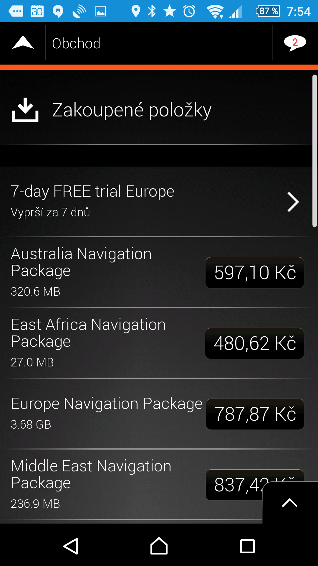 K pořizování map slouží sekce Obchod, kde si můžete vybrat z několika regionů (Austrálie, východní Afrika, Evropa, Střední Východ, Severní Amerika atd.). Následně si můžete vybrat jednotlivé země, takže když chcete jezdit výhradně po Česku, čeká vás stažení pouhých 45,2 MB dat. Po uplynutí sedmidenní zkušební doby budete muset mapové podklady zakoupit. Ceny nejsou přemrštěné: za mapu Evropy dáte 788 korun.