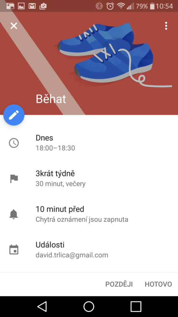 Jak na špatné návyky? Zbavit vás jich může i Google kalendář Hlavní stránka Návody Sdílejte: David Trlica Publikováno: 15.12.2016 06:00 (Aktualizováno: 14.12.2022 00:16) 2 komentáře 2 Google Kalendář není jen o událostech a schůzkách. Dá se poměrně dobře použít i jako aplikace pro vylepšení produktivity, nebo jako odrazový můstek, pokud máte špatné návyky. My vám ukážeme jak na to. Špatné návyky pomůže odstranit Google kalendář Všechno se točí kolem funkce cílů, která byla tento rok do kalendáře přidána. Pomůže vám nastavit cíle a následně vám bude připomínat, že na nich musíte pracovat. A nemusí se to týkat jen práce, můžete si třeba nastavit pravidelné běhání nebo alespoň 30 minut číst knihy. To nejlepší na tom je, že všechnu těžkou práci s plánováním splní Google kalendář za vás. Stačí mu jen říct, co všechno chcete dělat a on už najde dostatek času v týdnu. Samozřejmě ale za vás nebude vstávat, běhat, takže lidská síla a vůle je stále potřeba. Díky němu si ale můžete vypracovat dobré návyky. Vybrání cíle Začít je snadné. Po spuštění Google kalendáře klepneme na plusovou ikonku v pravém dolním rohu. Z nabídky pak vybereme cíle podle toho, co chceme zlepšit nebo s čím chceme začít. Aplikace se pak zeptá na několik otázek, podle kterých pak pozná kdy a jak často bude upozorňovat na cíl. Pokud v nabídce nenajdete aktivitu, kterou chcete provádět, můžete si vytvořit svůj vlastní cíl. Dále si pomocí odpovědí na otázky vyberete jak často chcete aktivitu dělat a také odhadnout kolik času vám zabere. Nakonec si vyberete nejlepší čas, ve kterém chcete, aby vás Google kalendář upozorňoval. V kalendáři se pak aktivita objeví jako událost, kde už si ji budete moct každý upravit pomocí standardního rozhraní kalendáře, pokud mu v něčem nebude vyhovovat původní zadání. A to je vše. Teď je řada na Google kalendáři, který bude hledat ideální čas pro splnění cílů. Bude například automaticky přesouvat cíle, pokud do kalendáře přidáte událost, která se časově kryje. Také se snaží učit podle toho, jestli cíle označíte jako hotové, nebo je naopak odložíte. To se hodí například na ranní běh, kdy několikrát po sobě odmítnete běhaní nastavené na 6:00. Aplikace tak zkusí pro příště nastavit běhání na pozdější čas, aby se dal splnit zadaný cíl a neprohlubovaly se tak špatné návyky. Google Calendar Google LLC Instalovat (Free) Google Play Používáte cíle v Google kalendář, nebo máte jiné triky jak na špatné návyky a lepší organizaci dne? Zdroje: blog.google, gizmodo.com O autorovi David Trlica Už od dětství ho bavily telefony, na půdě byste určitě našli mnoho a mnoho časopisů o telefonech. První setkání se smartphony proběhlo právě u Androidu.… Více o autorovi Sdílejte: 2 komentáře Vložit komentář Kalendář Google návod produktivita Mohlo by vás zajímat PixWords pomocník - nápověda k novým obrázkům Petr Mišák 19.1.2015 Návod: Jak v Androidu zjistit heslo ke známé WiFi síti? Marek Houser 8.8.2020 Google Chrome pro Android nyní konečně umí otevírat PDF soubory! Poradíme, jak funkci zprovoznit Adam Kurfürst 8.12.2024 Jak nainstalovat aktualizaci Windows 11 24H2 už dnes? Je to jednodušší, než byste čekali Libor Foltýnek 3.10.2024 Jak přepnout Google Gemini do češtiny a jak se vypořádat s problémy? Adam Kurfürst 26.7.2024 PixWords help - hra která procvičí vaší angličtinu (návod) Jan Tipmann 17.4.2014