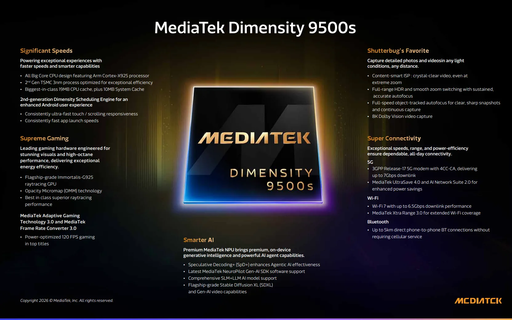 MediaTek ukázal nabušený Dimensity 9500s. Dostanou ho levnější vlajky, spoléhá na velká jádra a velkou cache Hlavní stránka Zprávičky MediaTek představil čipset Dimensity 9500s jako odlehčenou variantu vlajkového Dimensity 9500. Novinka využívá 3nm proces od TSMC a architekturu All Big Core s jádrem Cortex-X925 na 3,73 GHz. Xiaomi potvrdilo, že čipset dostane chystaný Redmi Turbo 5 Max s údajným skóre 3,61 milionu bodů v AnTuTu. Sdílejte: Adam Kurfürst Publikováno: 16.1.2026 10:00 Žádné komentáře 0 Tchajwanský výrobce čipů MediaTek rozšířil svou vlajkovou řadu o nový procesor Dimensity 9500s. Jde o odlehčenou variantu loňského Dimensity 9500, která má přímo konkurovat čipsetu Qualcomm Snapdragon 8 Gen 5 – ten je zase osekanou verzí Snapdragonu 8 Gen 5 Elite. Oba výrobci tak cílí na smartphony prémiového segmentu, které budou nabízet téměř vlajkovou výbavu. Pouze velká jádra a obří cache Grafika s ray tracingem a herní optimalizace Konektivita a fotografické schopnosti Xiaomi Redmi Turbo 5 Max jako první telefon? Představil se také Dimensity 8500 Pouze velká jádra a obří cache Dimensity 9500s využívá 3nm výrobní proces druhé generace od TSMC, který přináší vysoký výkon při zachování rozumné spotřeby energie. Osmijádrový procesor spoléhá na architekturu All Big Core, což znamená, že využívá pouze „velká“ výkonná jádra – žádná úsporná „malá“ jádra zde nenajdete. Konfigurace zahrnuje jedno ultra výkonné jádro Arm Cortex-X925 taktované na 3,73 GHz, tři jádra Cortex-X4 a čtyři jádra Cortex-A720. K tomu MediaTek přidává 19MB L3 cache a dalších 10 MB systémové cache, což je podle výrobce nejvíce ve své třídě. Paměťový subsystém podporuje LPDDR5X s rychlostí až 9 600 Mbps a úložiště UFS 4.0. Grafika s ray tracingem a herní optimalizace O grafický výkon se stará GPU Immortalis-G925 od Armu, které podporuje hardwarový ray tracing. MediaTek zmiňuje technologii Opacity Micromap (OMM), která má zrychlit vykreslování odrazů a stínů. Čipset dále obsahuje technologie Adaptive Gaming Technology 3.0 a Frame Rate Converter 3.0, které mají optimalizovat spotřebu energie při hraní her ve 120 FPS. Displeje může čipset pohánět až v rozlišení WQHD+ při 180 Hz, přičemž podporuje i trojité MIPI rozhraní pro skládací telefony s více panely. Konektivita a fotografické schopnosti V oblasti konektivity nabízí Dimensity 9500s modem 5G Release-17 s podporou 4CC-CA a rychlostí stahování až 7 Gbps. Nechybí ani Wi-Fi 7 s propustností do 6,5 Gbps a zajímavá funkce Bluetooth – přímé spojení mezi dvěma telefony může podle MediaTeku fungovat až na vzdálenost 5 kilometrů bez nutnosti mobilního signálu. Exynos 2600 je oficiálně venku! Po letech vypadá velice slibně Jakub Kárník Zprávičky Jakub Kárník Zprávičky Obrazový procesor Imagiq zvládne nahrávání 8K videa v Dolby Vision při 60 snímcích za sekundu. Podporuje snímače s rozlišením až 320 Mpx nebo současnou práci se třemi 36Mpx senzory. Xiaomi Redmi Turbo 5 Max jako první telefon? Xiaomi už na sociálních sítích potvrdilo, že nový čipset využije jeho připravovaný smartphone Redmi Turbo 5 Max. Podle uniklých informací telefon v benchmarku AnTuTu dosáhl skóre 3,61 milionu bodů. Čipset MediaTek Dimensity 9500s využije nové Redmi Turbo 5 Max (strojově přeloženo z čínštiny) Představil se také Dimensity 8500 Spolu s Dimensity 9500s MediaTek představil také Dimensity 8500 pro prémiovou střední třídu. Ten využívá 4nm proces a osm jader Cortex-A725 s taktem do 3,4 GHz. Grafiku obstarává Mali-G720, které má nabídnout o 25 % vyšší výkon při o 20 % nižší spotřebě oproti předchůdci. Co říkáte na nové čipsety od MediaTeku? Zdroje: MediaTek (1, 2, 3), ITHome O autorovi Adam Kurfürst Adam studuje na gymnáziu a technologické žurnalistice se věnuje od svých 14 let. Pakliže pomineme jeho vášeň pro chytré telefony, tablety a příslušenství, rád se… Více o autorovi Sdílejte: Žádné komentáře Vložit komentář čipset MediaTek Mohlo by vás zajímat POCO X7 (Pro) přichází do Česka! Za skvělou cenu nabídnou nejen vysoký výkon Adam Kurfürst 9.1.2025 Jakou výbavu přinese Xiaomi 15T Pro? Nejspíš známe první detaily! Adam Kurfürst 10.1.2025 Vivo X200 Pro recenze: hlavní roli dostal teleobjektiv a baterie Vašek Švec 10.1.2025 MediaTek představil procesor snů! Dostanou ho telefony střední třídy, první bude Xiaomi Jakub Kárník 23.12.2024 2nm čipy se odkládají. Nvidia a Qualcomm hledají řešení u Samsungu Libor Foltýnek 6.1.2025 Velký únik vykresluje telefony Google Pixel 10 a Pixel 11. Co se dozvídáme? Adam Kurfürst 23.10.2024