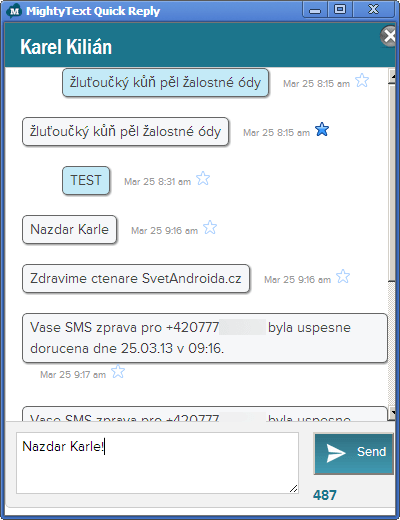 MightyText: čtěte a posílejte SMS z počítače či tabletu! Hlavní stránka Recenze Recenze na aplikace Sdílejte: Karel Kilián Publikováno: 2.4.2013 06:00 (Aktualizováno: 2.4.2013 15:17) 13 komentářů 13 Určitě to znáte: odkudsi z místnosti se ozve zvuk vašeho telefonu, indikující, že vám přišla nová textová zpráva. Buď můžete začít telefon hledat, nebo se podíváte na monitor počítače, co vám kdo píše a přímo z webového prohlížeče také odpovíte. Připadá vám druhá popsaná varianta pohodlnější? Stačí k tomu málo: telefon s nainstalovanou aplikací Free Text Messaging ↔ PC (SMS) připojený k Internetu a počítač s webovým prohlížečem. Hlavní výhodou tohoto řešení je, že telefon a počítač nemusí být ve stejné síti. Hned na začátek této recenze si řekněme, že název, pod kterým najdete probíranou aplikaci v Obchodě Play, zní „SMS Text Messaging ↔PC Texting“, nicméně obecně je známa pod podstatně jednodušším označením MightyText. Co MightyText umí? Číst doručené i odeslané SMS z telefonu na tabletu nebo počítači. Odesílat SMS z webového prohlížeče v počítači nebo z tabletu (reálně jsou zprávy posílány přes telefon a jsou tedy zpoplatněné jako běžné textové zprávy). Okamžité upozornění na počítači/tabletu v případě doručení nové zprávy. Velmi snadné nastavení, které dle autorů nebude trvat déle než půl minuty. 100% zdarma (abychom byli zcela přesní: aplikace je zdarma, za odeslané SMS platíte normální sazbu). Oznámení o příchozích hovorech na desktopu. Zahájení vytáčení zvoleného kontaktu z počítače. Synchronizace kontaktů s telefonem, díky které například uvidíte u textových zpráv jména a obrázky jejich odesílatelů/příjemců. Indikace stavu baterie. Synchronizace textových zpráv. Automatická záloha a obnova SMS na MightyText s možností prohlížení z jakéhokoli zařízení připojeného k Internetu (s tou obnovou si ale nejsme jistí – nikde v nastavení jsme tuto možnost nenašli). Instalace Základní instalace a konfigurace je skutečně jednoduchá – spočívá v instalaci aplikace do telefonu a otevření webové stránky https://mightytext.net/app ve webovém prohlížeči na PC. Aplikaci Free Text Messaging ↔ PC (SMS) si můžete do telefonu nainstalovat přes následující odkaz. Send SMS/MMS Messages from PC MightyText: SMS Texting w/ PC - SMS Messaging Instalovat (Free) Google Play Po spuštění aplikace pouze zvolíte, skrze který Google účet ji chcete ovládat. To je z hlediska akcí, jež budete provádět na telefonu, všechno. Skrze který účet chcete aplikaci ovládat? Program vás ještě upozorní, že k odesílání a příjmu SMS zpráv na počítači stačí otevřít stránku https://mightytext.net/app. Nenápadným tlačítkem Unlink Phone můžete telefon odpojit od této služby. Aplikace je nainstalována. V nastavení je možné určit, zda chcete synchronizovat SMS a MMS, telefonní hovory a jestli si přejete ukládat na web i záznamy o voláních. Možnosti nastavení SMSky ve webovém prohlížeči Po zadání adresy https://mightytext.net/app budete nejprve požádáni o povolení k přístupu k účtu Google. Aplikace požádá o přístup k účtu Google Poté se již otevře webové rozhraní skládající se ze tří sloupců: Sloupec vlevo slouží k přepínání mezi jednotlivými sekcemi webové aplikace. V dolní části můžete sledovat stav nabití baterie v telefonu. Druhý sloupec je přítomen pouze v sekci Classic View a jsou v něm k vidění kontakty, se kterými konverzujete (u těch, jež máte v adresáři, je zde fotografie a jméno). Ve třetím sloupci je konverzace s vybraným kontaktem. Ta je provedena standardním způsobem dialogu dvou stran, kde doručené zprávy jsou zarovnané vlevo, odeslané vpravo. Webové rozhraní MightyText.net Patrně jste si všimli, že webová aplikace nečiní rozdíly mezi zprávami fyzicky odeslanými z telefonu a těmi, které jste poslali z prohlížeče. Vysvětlení je jednoduché: všechny SMS se ve skutečnosti odesílají z vašeho telefonu! Jak to vlastně funguje? Odesílání SMS: Zadáte a odešlete SMS v prohlížeči. SMSka je následně serverem skrze Internet předána do vašeho telefonu – zde ji příjme na pozadí běžící služba nainstalované aplikace Free Text Messaging ↔ PC (SMS). Aplikace Free Text Messaging ↔ PC (SMS) zprávu zpracuje a odešle standardním způsobem jako běžnou textovou zprávu. Poté ještě Free Text Messaging ↔ PC (SMS) pošle serveru MightyText.net informaci, že zpráva byla úspěšně odeslána respektive doručena. Příjem SMS: Do telefonu přijde SMS. Služba na pozadí ji přijme a odešle skrze Internet na server MightyText.net informace o odesílateli a text zprávy. Následně předá zprávu k dalšímu zpracování systémové či jiné aplikaci pro správu SMS. K tomu, aby komunikace fungovala, jsou tedy nutné tři podmínky: Telefon musí být připojen k Internetu, aby mohl komunikovat se serverem MightyText.net. Telefon musí být připojen do sítě operátora a musí z něj být možné odesílat SMSky. V telefonu musí být nainstalována aplikace Free Text Messaging ↔ PC (SMS) a musí běžet příslušná služba, obstarávající výběr/posílání SMS a komunikaci se serverem. Nová zpráva Kliknete-li na tlačítko New Message, otevře se v prohlížeči plovoucí okno, ve kterém můžete napsat a odeslat textovou zprávu. Do políčka To: zadáte telefonní číslo nebo jméno příjemce (v případě zadávání jména je připraven našeptávač nabízející kontakty z vašeho adresáře), do pole Write a Message napíšete text zprávy. Výběr příjemce zprávy Během psaní jsou odpočítávány znaky, zbývající do konce maximální délky 500 znaků. Nikde ovšem není indikováno, do kolika zp