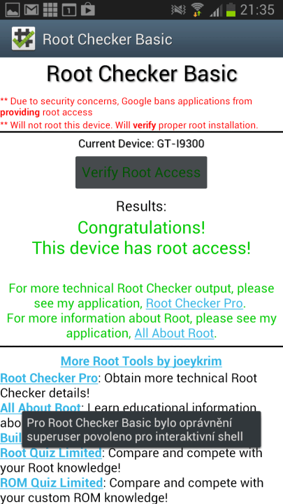 Návod jak na root telefonu Samsung I9300 Galaxy S III s Androidem 4.1.2 Hlavní stránka Návody Sdílejte: Karel Kilián Publikováno: 21.9.2013 12:00 (Aktualizováno: 12.12.2022 23:07) 37 komentářů 37 Galaxy S III – loňská vlajková loď Samsungu – se již snesl do cenově přijatelnějších výšin, takže se stále častěji objevuje v kapsách uživatelů, kteří nemusí mít za každou cenu „nejnadupanější“ mobil na trhu. Samozřejmě část těchto majitelů dochází k závěru, že k životu svému a svého telefonu potřebují práva roota. V podrobném popisu vám ukážeme, jak rootnout Samsung Galaxy S III se zatím poslední uvolněnou verzí operačního systému Android 4.1.2. Jak rootnout Samsung Galaxy S3? Důležitá upozornění Než se pustíte do čtení návodu a rootování, doporučujeme věnovat pozornost následujícím bodům! Návod platí pro Samsung I9300 Galaxy S III s Androidem 4.1.2 a firmwarem XXELKC. S jiným firmwarem může (ale nemusí) také fungovat, s jinou verzí Androidu skoro jistě fungovat nebude. (viz postup Jak zjistím verzi firmware?) Uvedený postup platí výhradně pro Samsung I9300 Galaxy S III. V žádném případě ho neaplikujte na jiném typu zařízení! Před instalací se ujistěte, že v počítači máte nainstalované správné USB ovladače pro telefony Samsung (ke stažení buď jako součást balíku Kies, nebo samostatně). Musíme vás také upozornit, že výrobce, prodejce nebo operátor může rootnutí považovat za důvod k neuznání záruky. Jestliže v průběhu rootování dojde k chybě, může se stát, že zařízení nebude schopné startu. Patříte-li k méně pokročilým uživatelům, patrně budete muset telefon odnést do servisu. Velmi důrazně doporučujeme před rootováním provést zálohu všech dat, o která nechcete přijít. Zálohujte videa a obrázky, případně i kontakty, zprávy, záložky, …. Zálohu nenechávejte v telefonu! Pro jistotu je vhodné na počítači dočasně vypnout všechny antivirové aplikace, aby žádný program nezasahoval do procesu rootnutí. Zapněte ladění USB (viz postup Jak zapnout ladění USB?). Telefon by měl mít také dostatečně nabitou baterii. Sice bude připojen k USB, ale jistota je jistota, a pokud by se vypnul během rootnutí, nemuselo by to dopadnout dobře. Než se pustíte do rootování, nejprve si pečlivě celý následující návod pročtěte. Nevynechejte žádné kroky! Pokud se dostanete do problémů, zkuste požádat o další pomoc v komentářích. Berte na vědomí, že celou operaci provádíte na vlastní zodpovědnost a s vědomím rizika, že může dojít k znefunkčnění telefonu. Metody a postupy popisované zde jsou považovány za riskantní a neneseme zodpovědnost v případě, pokud se něco pokazí. Aktualizací systému (pozor, nikoli aktualizací programů) s největší pravděpodobností o práva roota přijdete. Jak zjistím verzi firmware? Přejděte do systémového nastavení. Jděte do sekce O zařízení. Vyhledejte položku Číslo sestavení, která by měla končit XXELKC. Přejděte do systémového nastavení Jděte do sekce O zařízení Položka Číslo sestavení by měla končit XXELKC Jak zapnout ladění USB? Přejděte do systémového nastavení. Jděte do sekce Vývojářské možnosti. Pokud u položky Ladění USB není zatržítko, aktivujte ho. Potvrďte, že chcete povolit ladění USB tlačítkem OK. Přejděte do systémového nastavení Jděte do sekce Vývojářské možnosti Aktivujte Ladění USB Potvrďte, že chcete povolit ladění USB Jak rootnout Samsung Galaxy S3 i9300 s Androidem 4.1.2 a firmwarem XXELKC Stáhněte do počítače soubor CF-Root-Auto-zip a rozbalte obsah archívu do jedné složky. Stáhněte do počítače Odin 3.07 a rozbalte obsah do stejné složky, vytvořené v prvním kroku. Vypněte telefon a poté nabootujte do Download Mode. To lze provést současným stiskem tlačítek „snížení hlasitosti“, „domů“ a „zapnutí“. Potvrďte, že chcete zavést Download Mode. Spusťte telefon se stisknutými tlačítky Na počítači přejděte do vytvořené složky a spusťte soubor Odin3 v3.07.exe. Poté, co nastartuje aplikace Odin, připojte telefon k počítači. Spusťte soubor Odin3 v3.07.exe Odin by měl v sekci Message napsat Added!! Po připojení telefonu by měl Odin v sekci Message napsat Added!! Klepněte na tlačítko PDA. Klepněte na tlačítko PDA Najděte ve složce soubor CF-Auto-Root-m0-m0xx-gti9300.tar.md5 a otevřete ho. Najděte soubor CF-Auto-Root-m0-m0xx-gti9300.tar.md5 a otevřete ho. Neměňte výchozí nastavení aplikace Odin a klepněte na tlačítko Start. Klepněte na tlačítko Start Počkejte, až proběhne rootnutí a telefon se restartuje. Probíhá rootování telefonu Telefon je restartován Na konci procesu, když se na displeji zobrazí spouštěcí animace, by měl Odin oznámit PASS. Na konci procesu by měl Odin oznámit PASS! Telefon můžete odpojit od počítače. Jak ověřit, jestli se root povedl? K tomuto účelu se nejlépe hodí aplikace Root Checker, kterou nainstalujete standardním způsobem z Obchodu Play. Root Checker joeykrim Instalovat (Free) Google Play Po spuštění stiskněte tlačítko Verify root access, a následně povolte práva roota. Pokud se rootnutí povedlo, měla by se zobrazit zelená hláška The device has root access! Nainstalujte Root Checker Odsouhlaste licenční ujednání Odklepněte informace o novinkách Stiskněte tlačítko Verify root access Povolte práva roota Takto by měl vypadat výsledek O autorovi Karel Kilián Karel Kilián je zkušený technický redaktor a copywriter s bohatou praxí v oblasti informačních a komunikačních technologií. Jeho kariéra začala na pozici prodavače, odkud postupně… Více o autorovi Sdílejte: 37 komentářů Vložit komentář Android 4.1.2 i9300 jak rootnout Root S III s3 Samsung Galaxy sam