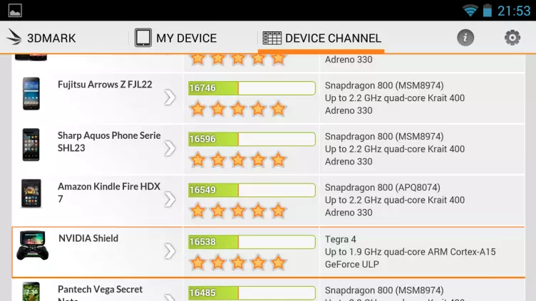 Konzoli Shield jsme podrobili benchmarkům AnTuTu, Quadrant a 3DMark. Ve všech případech si můžete všimnout skvělých výsledků, obzvláště pak v benchmarku AnTuTu, kde Shield předčil i taková zařízení, jako Samsung Galaxy Note 3 či Xiaomi Mi3 a LG G2.