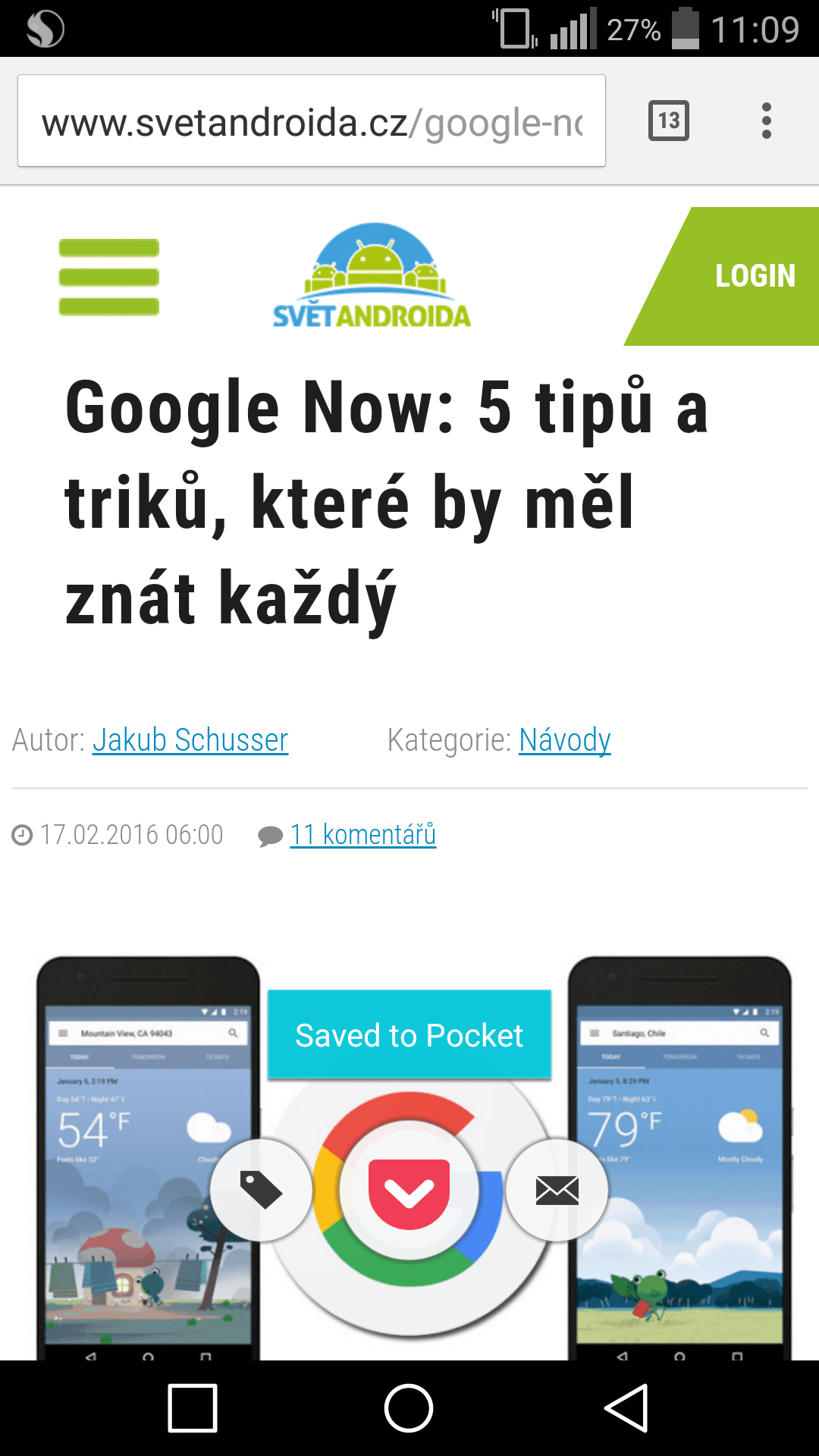 Pocket: Jak uložit webové stránky ke čtení offline? Hlavní stránka Návody Sdílejte: Jakub Schusser Publikováno: 19.2.2016 08:00 (Aktualizováno: 19.2.2016 11:53) 19 komentářů 19 Už se vám někdy stalo, že byste si rádi přečetli některý z článků z vašeho oblíbeného serveru, ale nemáte zaplacený mobilní internet? Máte mobilní internet, ale vstupujete do metra? Nebo byste si jen chtěli uložit pár webových stránek, protože jedete do míst, kde se k internetu jen tak nepřipojíte? Dnes jsme pro vás připravili jednoduchý návod, pomocí kterého si budete moci uložit webové stránky, které si poté budete moct přečíst offline. A to díky aplikaci Pocket. K celému postupu budeme potřebovat pouze internetový prohlížeč a aplikaci Pocket. Celý postup je pak velmi jednoduchý. Na stránce, která vás zajímá, stačí ve vašem prohlížeči kliknout na možnost „sdílet“ a vybrat možnost „Add to Pocket“. Po provedení těchto několika úkonů máte stránku uloženou v telefonu. Pro ukládání stránek není potřeba mít Chrome. Stačí, aby váš oblíbený prohlížeč nabízel možnost sdílení. Zde je ukázka toho, že lze uložit článek pro pozdější přečtení třeba i v UC Browseru: V momentě, kdy chcete uloženou stránku zobrazit, stačí otevřít aplikaci Pocket a na článek jednoduše kliknout. Nabízí Pocket něco dalšího? Za zmínku určitě stojí to, že pomocí Pocketu nemusíte ukládat jen webové stránky, které jste našli sami, ale můžete využít návrhů stránek, které vybrali lidé, které sledujete. Pokud navíc stránka obsahuje odkazy na další články, které máte v telefonu uložené, můžete jich také využít. Uživatele OLED displejů určitě potěší, že použitím čtecího módu využívajícího pravé černé můžete o něco prodloužit výdrž baterie. Skvělou vlastností použité aplikace je i to, že uloženou stránku mírně přeformátuje do velmi příjemné podoby, takže můžete nakonec zjistit, že vám čtení z Pocketu vyhovuje daleko víc než čtení ze samotné stránky. Aplikaci Pocket můžete zdarma stahovat z Google Play. A co vy? Využíváte možnosti čtení offline? Pocket: Save. Read. Grow. Mozilla Instalovat (Free) Google Play O autorovi Jakub Schusser Sdílejte: 19 komentářů Vložit komentář browser Pocket Prohlížeč sdílení Mohlo by vás zajímat Dark Web, skrytá část internetu. Co to je, jak se na něj dostat a kam se podívat? Adam Kurfürst 30.6.2024 Google Play ruší jednu z nejzajímavějších funkcí. Bude vám chybět? Jana Skálová 21.12.2024 Google Chrome pro Android nyní konečně umí otevírat PDF soubory! Poradíme, jak funkci zprovoznit Adam Kurfürst 8.12.2024 Zapomeňte na Chrome! Arc je unikátní prohlížeč, který jste ještě nikdy neviděli Jakub Kárník 11.8.2024 Rychlý jako blesk! Google Chrome pro Android je až dvakrát svižnější než loni Adam Kurfürst 5.12.2024 OpenAI chystá až děsivě schopnou AI. Částečně převezme kontrolu nad vaším počítačem Adam Kurfürst 15.11.2024