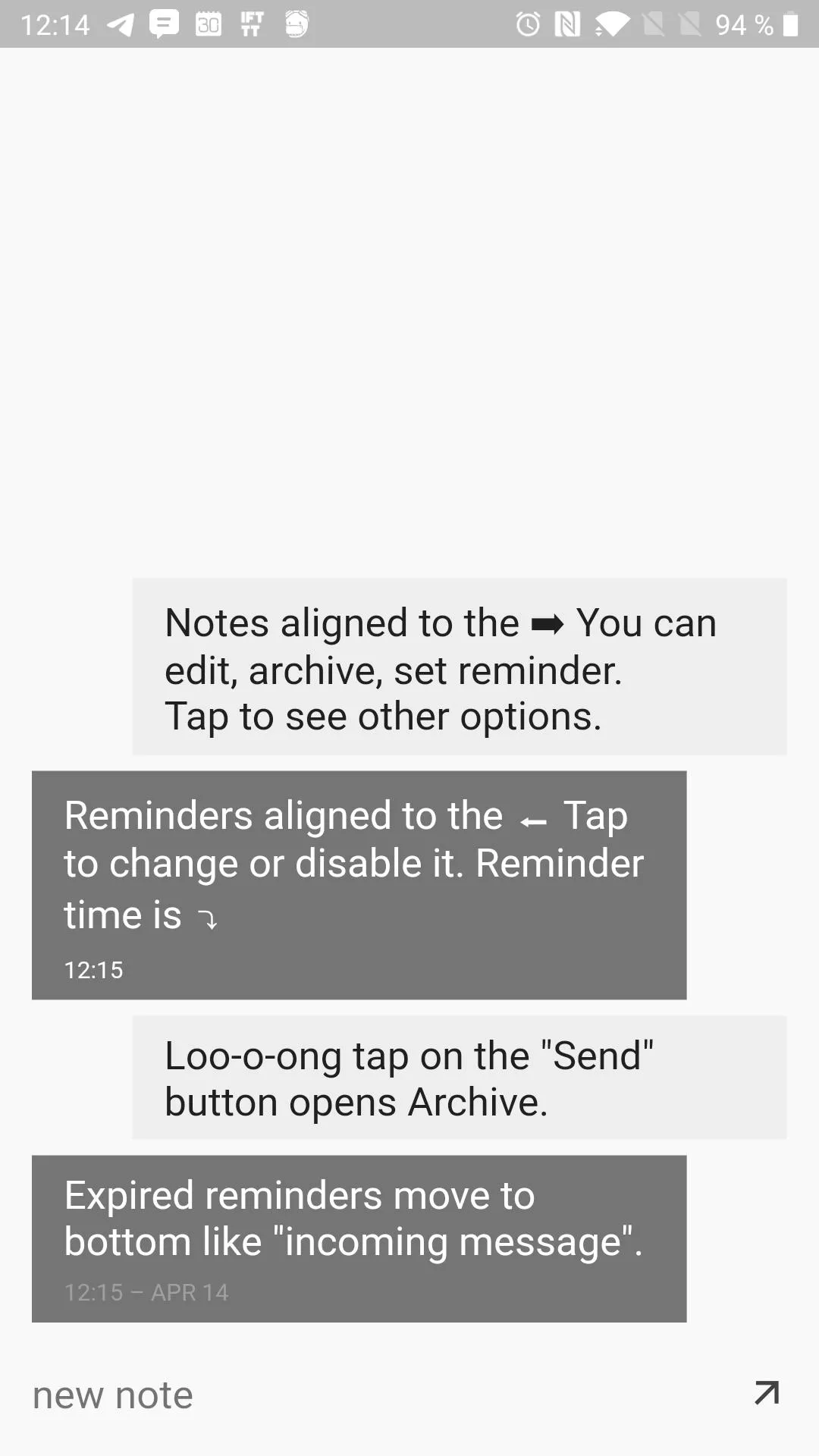 Zapisujte si poznámky a připomínky v netradiční aplikaci Notenger Hlavní stránka Recenze Recenze na aplikace Sdílejte: Karel Kilián Publikováno: 15.4.2019 16:00 2 komentáře 2 Evidujete si poznámky a připomínky v chytrém telefonu? Pokud je vaše odpověď záporná, možná byste měli vyzkoušet novou aplikaci Notenger! Po instalaci je připravena k vašim službám a láká na rychlé zadávání poznámek i snadné nastavení připomínek. Obsah článku Co aplikace slibuje? Jak funguje v praxi? Zadávání poznámek v aplikaci Resumé Co aplikace Notenger slibuje? Popisek v Obchodě Play je velmi stručný: slibuje, snadné vytváření, nastavování a uchovávání poznámek. Jako hlavní funkce a výhody autor Oleksii Masnyi slibuje: Velice rychlá aplikace. Vždy připravena na zadání nové poznámky. Snadný výběr data a času připomínky. Minimalistické uživatelské rozhraní. Poznámky se ukládají výhradně v zařízení. Z výše uvedeného je tedy zřejmé, že jde o minimalistickou aplikaci, sázející na snadnou použitelnost. Poznámky jsou v ní ukládány podobně jako v chatu s tím, že po dokončení se přesunou na pravou stranu obrazovky. Tímto způsobem můžete rychle rozpoznat nové a staré, ale i dokončené a nedokončené úkoly. Jak Notenger funguje v praxi? Aplikace běžně stojí 27,99 korun, nicméně v době testování (pondělí 15. dubna) byla v akci zadarmo, což je rozhodně příjemné. Po prvním spuštění jsou představeny základní principy práce s tímto poznámkovým systémem. Hlavní myšlenka spočívá v zarovnávání poznámek na levou, nebo pravou stranu. První jmenované jsou určené ke splnění v nějakém termínu, zarovnané vpravo žádný termín nemají. Poznámky, jimž vypršela platnost, jsou zařazeny na konec seznamu. Když na poznámce dlouze podržíte prst, objeví se čtyři tlačítka. První slouží k nastavení data a času připomínky, druhé kopíruje obsah poznámky do schránky. Třetím tlačítkem položku archivujete a posledním přepnete do režimu úprav. Zadávání poznámek v aplikaci Notenger Pokud jste někdy psali přes jakoukoli aplikaci pro textovou komunikaci (SMS, Messenger, WhatsApp), bude vám princip zadávání v programu Notenger velice blízký. Do pole v dolní části okna aplikace prostě zadáte text a odešlete ho tlačítkem se šipkou. Poznámka se zařadí na konec, zarovnaná k pravé části obrazovky, protože nemá zadaný termín splnění. Ten můžete určit tak, že na ni klepnete a poté použijete tlačítko s budíkem. Pomocí posuvníků vyberete den a čas, po uložení se poznámka přesune k levé straně obrazovky. S poznámkami lze dále pracovat, jak jsme si řekli výše, pomocí kvarteta kontextových tlačítek, jež se zobrazí po klepnutí na jednotlivé poznámky. Není tak například problém změnit termín připomínky nebo samotný text. Resumé Aplikace Notenger nabízí vskutku nekonvenční způsob, jak ukládat poznámky a připomínky rychle a jednoduše. Ovládání je sice na tento typ programu poněkud netradiční, avšak z pohledu uživatele velmi intuitivní a snadno naučitelné. Otázkou je, jak vnímat absenci synchronizace do cloudu – to, co autor předkládá jako výhodu, je například proti Google Keep poměrně citelným nedostatkem. Notenger – notes and reminders je v Obchodě Play dva týdny a za tu dobu zaznamenal jen jednotky instalací. Po osmi hodnocení se však může chlubit nadějnou průměrnou známkou 4,9. Instalační balíček velký 6,6 MB můžete používat na telefonech a tabletech s Androidem 5.0 a vyšším. Notenger – incredible fast not Oleksii LLC Instalovat (Free) Google Play V jaké aplikaci si evidujete poznámky a připomínky? O autorovi Karel Kilián Karel Kilián je zkušený technický redaktor a copywriter s bohatou praxí v oblasti informačních a komunikačních technologií. Jeho kariéra začala na pozici prodavače, odkud postupně… Více o autorovi Sdílejte: 2 komentáře Vložit komentář poznámky poznámky jednoduše připomínky Mohlo by vás zajímat Lidl nabízí supertenký digitální zápisník za pár kaček. Nemusíte ho nabíjet, využijí ho dospělí i děti Jana Skálová 17.10.2024 Ovládněte své poznámky: Jak využít Google Keep na maximum v roce 2024? Adam Kurfürst 30.11.2024 Zajímavé Google Play aplikace zdarma: 3D živá tapeta s planetami, poznámky, vodoznak i zámek aplikací Jana Skálová 18.10.2024 Microsoft chce vypálit rybník Googlu! Jeho poznámková aplikace vás možná přiměje k zahození Keepu Adam Kurfürst 24.8.2024 Tvůrci milované poznámkové aplikace chystají moderní e-mailový klient. Potěší designem i umělou inteligencí Adam Kurfürst 26.10.2024 Kdo by tohle čekal? Umělou inteligenci už dostává i Poznámkový blok ve Windows Adam Kurfürst 8.11.2024