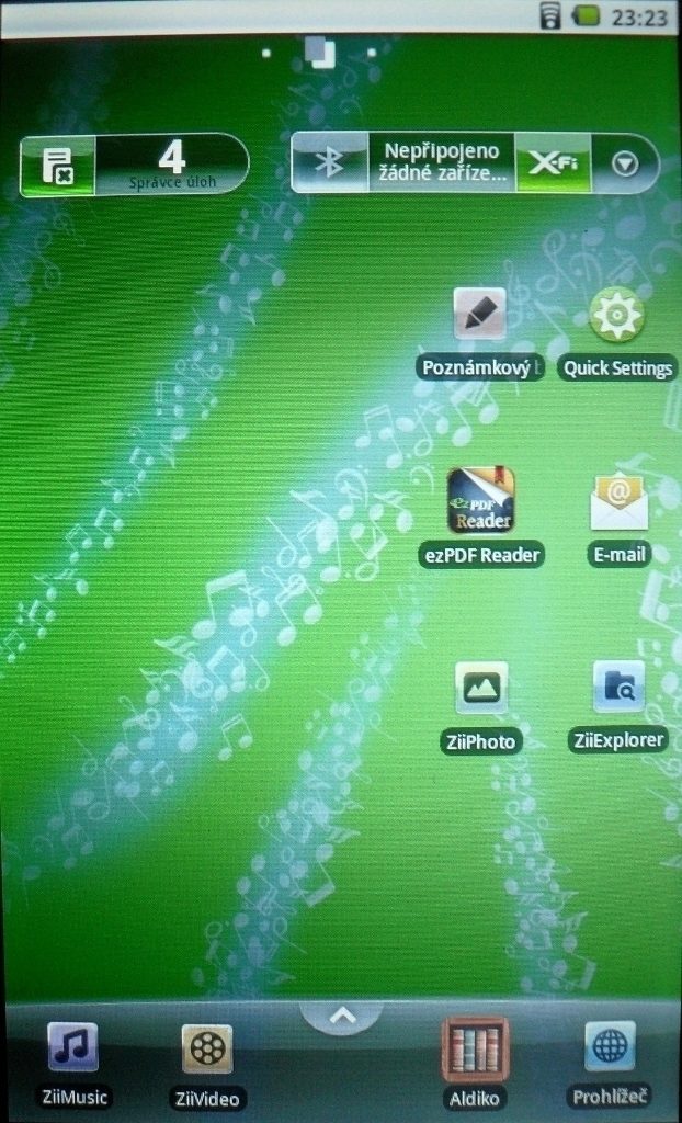 Recenze Creative Ziio 7 Hlavní stránka Recenze Recenze tabletů Sdílejte: Michal Mátl Publikováno: 19.7.2011 06:00 (Aktualizováno: 27.1.2015 16:48) 10 komentářů 10 Je docela překvapivé, že výrobce známý spíše výrobou sluchátek, reproduktorů či mp3 přehrávačů, se pustil do výroby tabletů. Bohužel si vybral cestu levných tabletů. Řadí se tak do řady výrobců jako je Prestigio či Archos. V segmentu levných tabletů je vysoká konkurence, a proto Ziio bude mít velice těžký úkol vydobýt si místo na trhu. Možná mu pomůže, že za ním stojí výrobce se zvučným jménem. Konstrukce a vzhled Po vybalení z krabice uvidíte sněhově bílý tablet. Připomíná mi svým vzhledem čtečku knih Kindle. Určitě Vás překvapí příjemná hmotnost, která činí 415 gramů. Váhu přístroje oceníte při delším držení během čtení nebo dívání se na film. Přední části dominuje sedmipalcový displej, kolem nějž je udělán prohnutý rám, který vyvyšuje celou obrazovku a usnadňuje držení. Pod displejem se nachází klasická androidí tlačítka (Hledat, Domů, Menu a Zpět). Mohlo by se na první pohled zdát, že jsou senzorická, ale není tomu tak. Fungují podobně jako rezistivní vrstva displeje. Reagují i při dotyku stylusem. Bohužel tlačítka nejsou podsvícena,což v noci dosti vadí. Nad obrazovkou si můžete všimnout kamerky. Umístění prozrazuje, že se Ziio nebudete příliš fotit, ale spíše jej využívat k videohovorům. Na pravém boku je umístěna kolébka s ovládacími tlačítky pro zvýšení/snížení hlasitosti. Na vrchní části jsou umístěny konektory pro 3.5mm jack, HDMI a miniUSB. Mezi konektory HDMI a 3.5mm jackem najdeme malý otvor pro mikrofon. Vedle konektorů se nachází tlačítko pro vypnutí/zapnutí. Na levém boku je otvor pro microSD kartu. Tablet si lze rozšířit kartu až do velikosti 32 GB. Na spodku už je jen jeden konektor pro nabíjení. Zadní strana je téměř prázdná. Pouze na straně, kde vidíme konektor pro nabíjení, jsou umístěny v ohybu reproduktory. Jejich umístění není zrovna nejlepší. Při sledování filmů si jeden reproduktor budete určitě zakrývat. Nepříjemné je občasné nedoléhání plastů na boku a s tím je spjato i vrzání konstrukce. To může odradit spoustu zájemců a snižuje Ziio na úroveň levných čínských tabletů. Obsah balení V balení naleznete nabíječku, stylus a USB kabel. Škoda, že se nedá tablet nabíjet přes miniUSB konektor. Sáhnout musíte po dodávané nabíječce. K tomuto příslušenství jsem dostal kožené pouzdro, které ochrání zařízení a navíc vrchní část pouzdra se dá srolovat do trojúhelníku a podložit jím tablet pro lepší psaní. Podobný mechanismus můžete vidět u iPadu a jeho obalu Smart Cover. Obal si ale musíte dokoupit za cenu kolem 800 Kč. Technické parametry: Rozměry a hmotnost: 207,4 x 133 x 13,7 mm, 415 g (s baterkou) Displej: Rezistivní TFT 7″ WVGA 800 x 480, 16,8 miliónu barev Procesor: Zii Labs ZMS-08, 1 GHz Paměť: Vnitřní paměť 8 GB, 512 MB RAM Konektivita: WiFi b/g, Bluetooth 2.1 EDR (s APTX a A2DP) Fotoaparát: Přední kamera 1,3 MPx Hudba: přehrávač hudby, 3,5mm jack Operační systém: Android 2.2 Baterie: 5000 mAh Displej a zvuk Displej je sedmipalcový rezistivní s rozlišením 800 x 480 pixelů. Barvy jsou poněkud bledé a rozlišení pro tak velký displej je nedostačující. Na přiložených fotografiích můžete vidět hrubší rastr displeje. Použitá rezistivní technologie má své výhody a nevýhody. Rezistivní displej oceníte při kreslení. Pro ovládání tabletu prstem však není tato technologie nejvhodnější. Za celou dobu testování jsem si zvykl používat stylus a ovládání prsty jsem využíval minimálně. Používat tužku ale budete jen v případě, že si pořídíte obal, kde si ji umístíte. Tablet totiž nemá otvor pro nošení stylusu. Zvuk linoucí se z reproduktorů na zadní straně je dostačující. Větší hlasitost by jim však rozhodně neuškodila. Výrobce se chlubí aplikací, která Vám zlepší poslech hudby. Mírné zlepšení lze pozorovat při zapnutí technologie X-Fi. Ale není to až takové vylepšení, kvůli kterému byste si Ziio koupili. Fotoaparát Nad displejem je čočka VGA kamery. Není určena pro focení, ale spíše jen pro videohovory nebo udělání fotky vlastního obličeje. V ,zip balíku najdete videa a fotky v neupravené formě. Systém Bohužel se mi nepodařilo rozchodit pořizování screenshotů přes aplikaci DDMS. Proto zde přikládám pouze fotky obrazovky tabletu. Výrobce použitý Android 2.2 upravil k obrazu svému. Na odemykací obrazovce musíte posunout zámek nahoru do otevíracího kolečka a přivítá Vás nadstavba od Creativu. Dole uvidíte panel, kde si můžete dát čtyři aplikace pro rychlé spuštění. Mezi aplikacemi je tlačítko pro vyvolání seznamu aplikací. Nahoře na displeji uvidíte tečky signalizující počet obrazovek. Zvláštní je ikona, která má podobu obdélníku, pod nímž se ukrývá další obdélník znázorňující dvě vrstvy obrazovek. Proto nejsou k dispozici jen tři obrazovky, ale celkem šest. Do vrchního patra obrazovek se dostanete posunem stylusu nahoru. Zpátky se vrátíte gestem dolů. Výborný je přehrávač filmů, který zvládne titulky. Dokonce přehraje oblíbené formáty .avi a .mkv. Zvládne bez problému přehrát 720p video. Velkou pozornost si zaslouží aplikace Poznámky. Má funkce pro malování. V poznámce lze mít kombinaci textu a nakreslených obrázků. Každou poznámku můžete zvýraznit obalem. Buď přiřadíte obal z obrázku od Creativu, nebo vlastní. Při kreslení je znát mírné zpoždění displeje, ale srovnám-li to s kreslením na HTC Flyeru, je kreslení na Ziio na podobné úrovni. Zamrzí absence Android Marketu a ostatních Google a