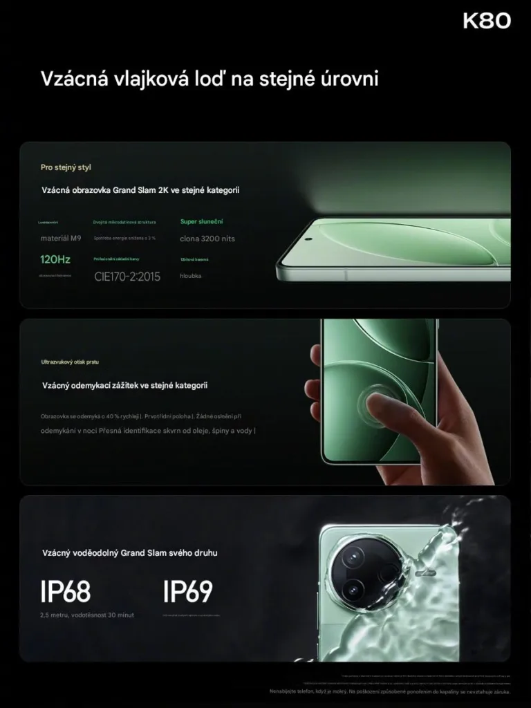 Řada Redmi K80 odhalena: Nabídne obří baterii a Snapdragon 8 Elite, do Evropy zamíří jako POCO F7 Hlavní stránka Zprávičky Xiaomi představilo Redmi K80 a K80 Pro, které do Evropy zamíří jako POCO F7 Pro a F7 Ultra Oba modely nabídnou vynikající výbavu včetně QHD+ displeje a extrémně velké baterie Samozřejmostí je také špičkový výkon, TOP model nabídne Qualcomm Snapdragon 8 Elite Sdílejte: Jakub Kárník Publikováno: 27.11.2024 20:04 1 komentář 1 Xiaomi dnes v Číně představilo pod taktovkou Redmi dvojici nových vlajkových lodí – modely Redmi K80 a Redmi K80 Pro. Zatímco základní model sází na loňský Snapdragon 8 Gen 3, vrcholná varianta dostala do vínku zbrusu nový čipset Snapdragon 8 Elite. Do Evropy by měla tato dvojice dorazit jako POCO F7 Pro a POCO F7 Ultra. Oba telefony spojuje především špičkový 6,67″ AMOLED displej s QHD+ rozlišením (2 400 × 1 080 px) a 120Hz obnovovací frekvencí. Panel se pyšní maximálním jasem až 3 200 nitů, podporou HDR10+ i Dolby Vision a nově použitými materiály, které mají zajistit lepší energetickou účinnost. Pod displejem najdeme ultrasonickou čtečku otisků prstů. Ta nabízí oproti té optické vyšší přesnost a nebude mít takový problém se snímáním špinavých či mokrých prstů. Obří baterie jako hlavní lákadlo Xiaomi se tentokrát vytáhlo s kapacitou baterie – základní K80 nabídne dokonce 6 550 mAh, zatímco Pro verze se musí spokojit s „pouhými“ 6 000 mAh. To je v obou případech velmi vysoká hodnota. K80 Pro podporuje 120W drátové a 50W bezdrátové nabíjení, základní model pak zvládá drátové nabíjení výkonem 90 W. Životnost baterie by měla být podle výrobce až 1 600 nabíjecích cyklů. Fotoaparát z Xiaomi Mix Flip Hlavní fotoaparát používá u obou modelů 50Mpx snímač OmniVision OVX8000 (1/1,55″) s optickou stabilizací a světelností f/1.6. Znát ho můžeme také pod názvem Light Hunter 800 a kromě Mix Flipu jej používá výrobce také v POCO F6 Pro. Podporuje natáčení videa ve 4K při 60 fps nebo dokonce v 8K, avšak jen při 24 fps. K80 Pro přidává 32Mpx ultraširokoúhlý snímač s úhlem záběru 120° a 50Mpx teleobjektiv Samsung JN5 s 2,5násobným optickým přiblížením. Základní model si musí vystačit s 8Mpx širokoúhlým fotoaparátem. Selfie kamerka má v obou případech rozlišení 20 Mpx. Špičková konektivita i chlazení Pro efektivní chlazení výkonných čipsetů vyvinulo Xiaomi speciální systém s dvojitou parní komorou. Ta by měla pomoci udržet teploty pod kontrolou i při náročném hraní. Samozřejmostí je certifikace IP68, v oblasti konektivity nabízí oba modely podporu 5G, Wi-Fi 7 a Bluetooth – základní model verzi 5.4, Pro varianta dostala nejnovější Bluetooth 6.0. O lepší signál se stará čip T1S, který posiluje nejen Bluetooth, ale také 5G a Wi-Fi připojení. Srovnání specifikací Specifikace Redmi K80 Redmi K80 Pro Procesor Snapdragon 8 Gen 3 Snapdragon 8 Elite RAM 12/16 GB LPDDR5X 12/16 GB LPDDR5X Úložiště 256 GB/512 GB/1 TB UFS 4.0 256 GB/512 GB/1 TB UFS 4.0 Displej 6,67″ AMOLED, QHD+, 120 Hz 6,67″ AMOLED, QHD+, 120 Hz Baterie 6 550 mAh, 90W nabíjení 6 000 mAh, 120W + 50W bezdrátové Hlavní foto 50 Mpx OV OVX8000, OIS 50 Mpx OV OVX8000, OIS Ultraširoký 8 Mpx 32 Mpx, 120° Teleobjektiv – 50 Mpx Samsung JN5, 2,5× zoom Přední kamera 20 Mpx 20 Mpx Konektivita 5G, Wi-Fi 7, BT 5.4 5G, Wi-Fi 7, BT 6.0 Ceny a dostupnost Xiaomi nabízí K80 Pro ve standardních barvách a také ve speciální Lamborghini edici, která obsahuje upravený design a speciální příslušenství včetně nabíječky s logem značky. Základní model je dostupný ve čtyřech barevných variantách. V Číně startuje základní Redmi K80 s 12 GB RAM a 256GB úložištěm na ceně 2 500 jüanů (asi 8 000 Kč). Za variantu s 16 GB RAM a 1TB úložištěm zaplatíte 3 600 jüanů (11 500 Kč). Model K80 Pro začíná s konfigurací 12/256 GB na 3 700 jüanech (11 800 Kč), vrcholná verze v Lamborghini edici s 16 GB RAM a 1TB úložištěm vyjde na 5 000 jüanů (přibližně 16 000 Kč). Do Evropy by měly telefony dorazit v prvním čtvrtletí příštího roku pod značkou POCO. Evropské ceny zatím neznáme, ale dá se očekávat, že budou o něco vyšší než přímý přepočet z čínských cen. Co říkáte na nové telefony řady Redmi K80? Zdroj: Mi.com (1, 2) O autorovi Jakub Kárník Jakub je znám svou nekonečnou zvědavostí a vášní pro nejnovější technologie. Jeho láska k mobilním telefonům začala s iPhonem 3G, ale dnes se spoléhá na… Více o autorovi Sdílejte: 1 komentář Vložit komentář POCO F7 Qualcomm Snapdragon 8 Gen 3 Redmi Redmi K80 Snapdragon 8 Elite Xiaomi Mohlo by vás zajímat Xiaomi spustilo obří zimní výprodej. Za mobily, tablety i další elektroniku ušetříte tisíce korun Jana Skálová 7.1. Datart prodává extra oblíbené Redmi za nesmyslně nízkou cenu! Kde je háček? Adam Kurfürst 28.12.2024 Black Friday: Datart vyprodává elektroniku za absurdní ceny, našli jsme skutečné perly (aktualizováno) Jakub Kárník 6.11.2024 POCO X7 (Pro) přichází do Česka! Za skvělou cenu nabídnou nejen vysoký výkon Adam Kurfürst 9.1. Jakou výbavu přinese Xiaomi 15T Pro? Nejspíš známe první detaily! Adam Kurfürst 10.1. Konečně pořádný malý tablet s Androidem. Lenovo Legion Tab Gen 3 překvapí výkonem i cenou Jakub Kárník 8.1.