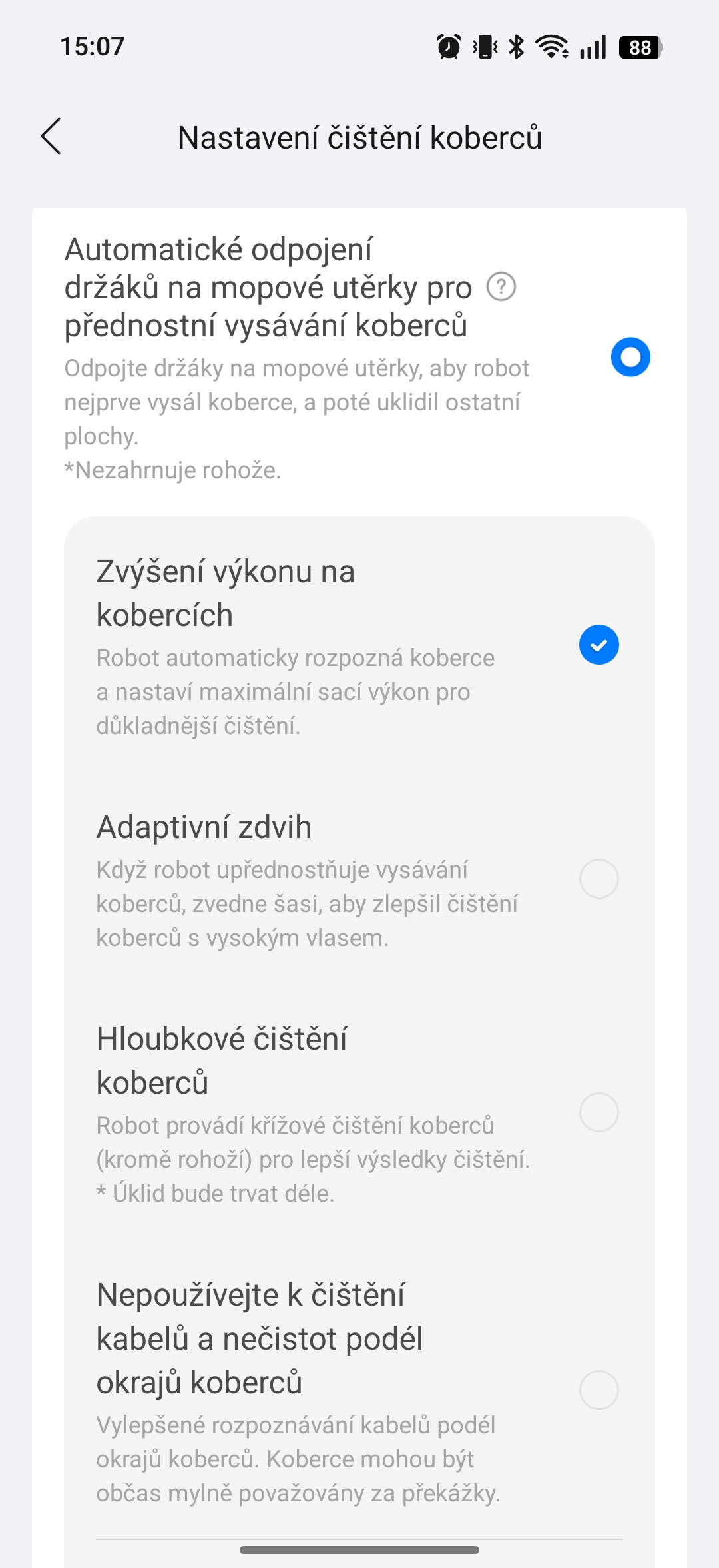 V nastavení aplikace pak naleznete celou řadu užitečných funkcí a voleb. Například jakým způsobem se má robot chovat ke kobercům? Má nechávat mopy v dokovací stanici nebo je jen zvednout? Dále lze nastavit adaptivní zdvih podvozku dle výšky vlasu koberce, hloubkové čištění či potlačit situace, kdy robot chybně vyhodnotí okraj koberce jako překážku. Zrovna tak lze definovat sekvenci úklidu aneb pořadí v jakém má Roborock Qrevo Curv 2 Pro jednotlivé místnosti uklízet.