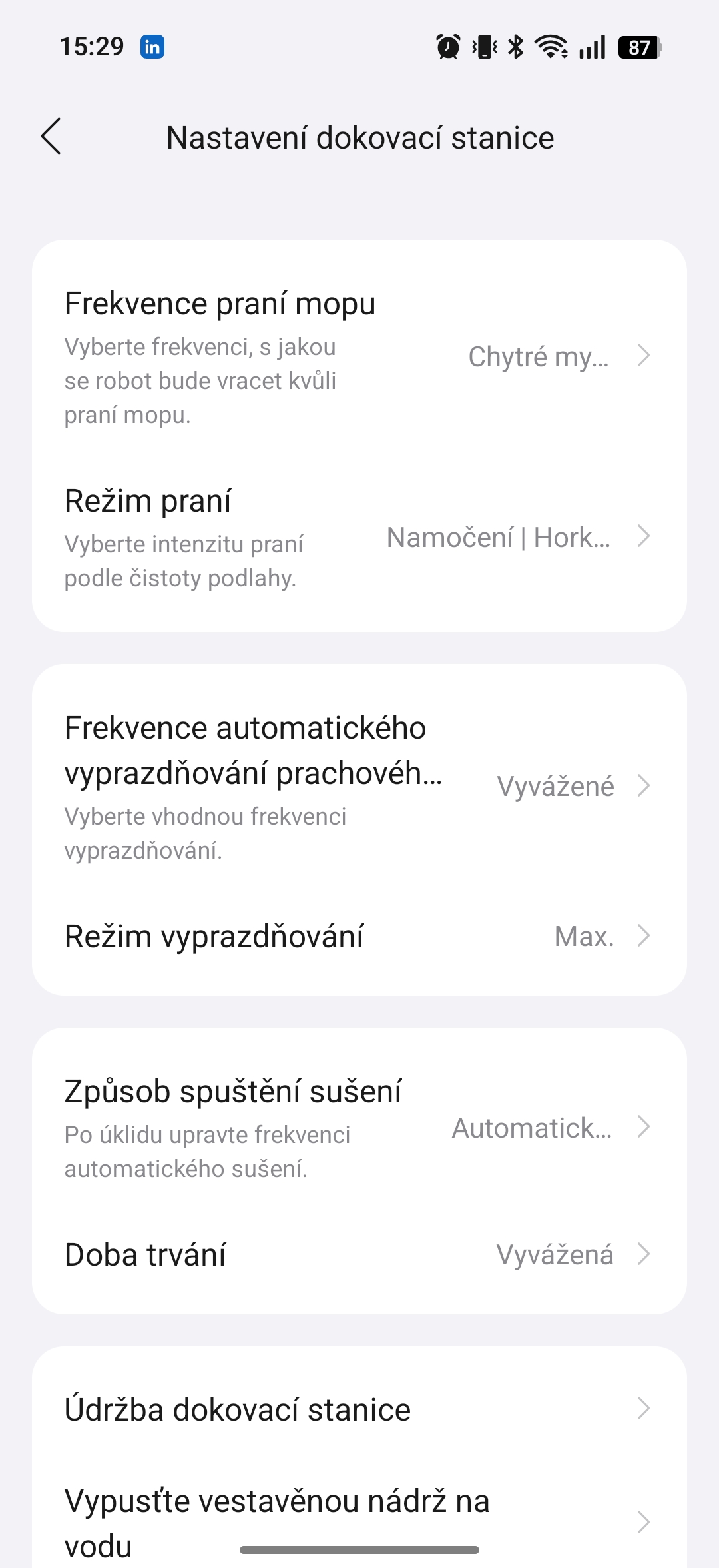 Z těch zajímavějších voleb v nastavení pak stojí za to zmínit možnosti nastavení vyhýbání překážkám, respektive jeho citlivosti. Dokonce včetně možnosti pořídit fotografii překážky, která vysavač donutila změnit trasu. A nechybí ani nastavení dokovací stanice u které lze definovat způsob a parametry praní i sušení mopů. Upravit můžete i četnost vyprazdňování zásobníku na prach nebo ručně spustit samočištění čistícího zásobníku pro praní mopů.