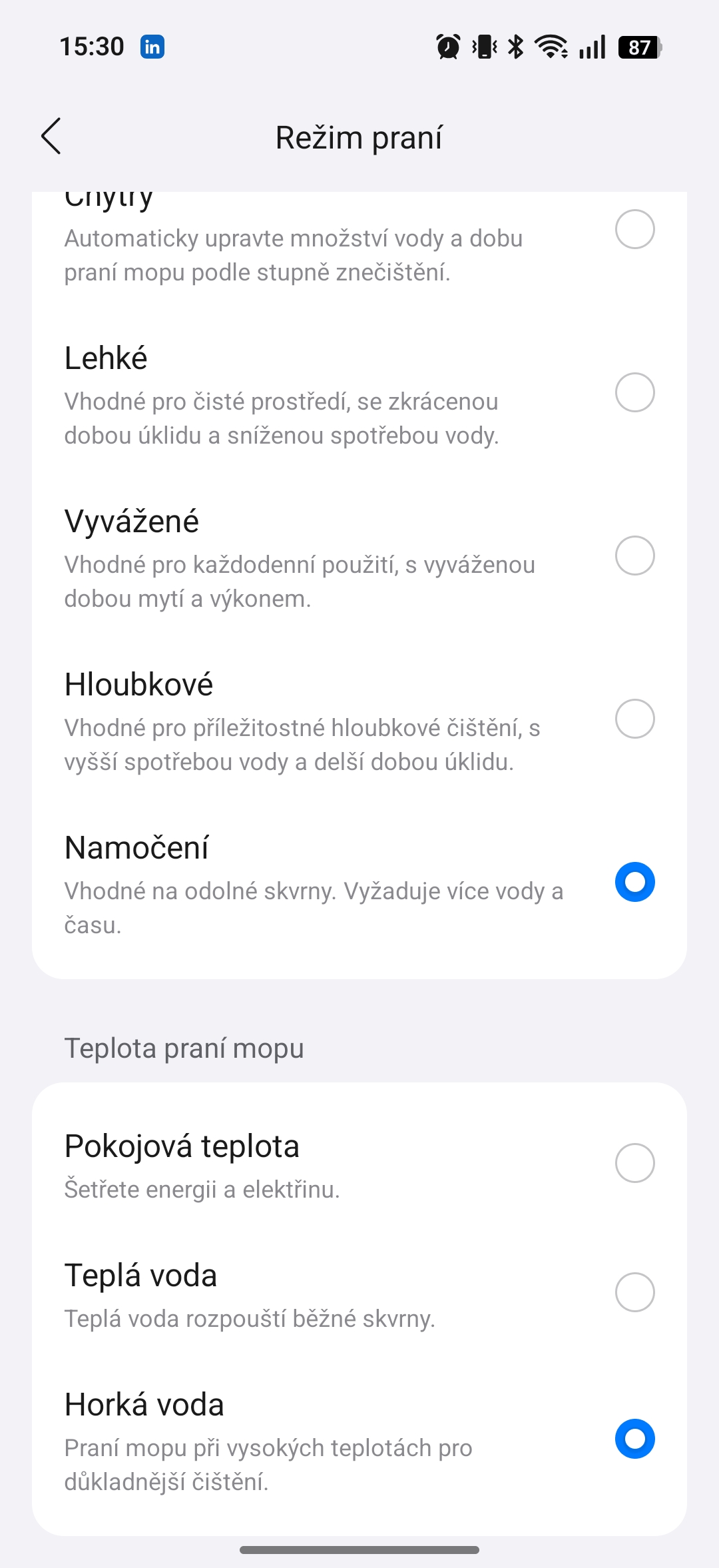 Podobně jako u vysávání, také při vytírání lze nastavit intenzitu úklidu. A to jednak pomocí hloubkového čištění, které upravuje trasu a rychlost úklidu. tak pomocí nastavení průtoku teplé vody. Nikde se mi nepodařilo dopátrat, jakému konkrétnímu průtoku vody jednotlivé stupně odpovídají, nicméně oproti původnímu Qrevo Curv mi u testovaného modelu pro dokonalé mopování stačilo nastavit přibližně o 20% nižší hodnotu průtoku. Že by vliv přepracovaného systému pro přítlak mopů?
