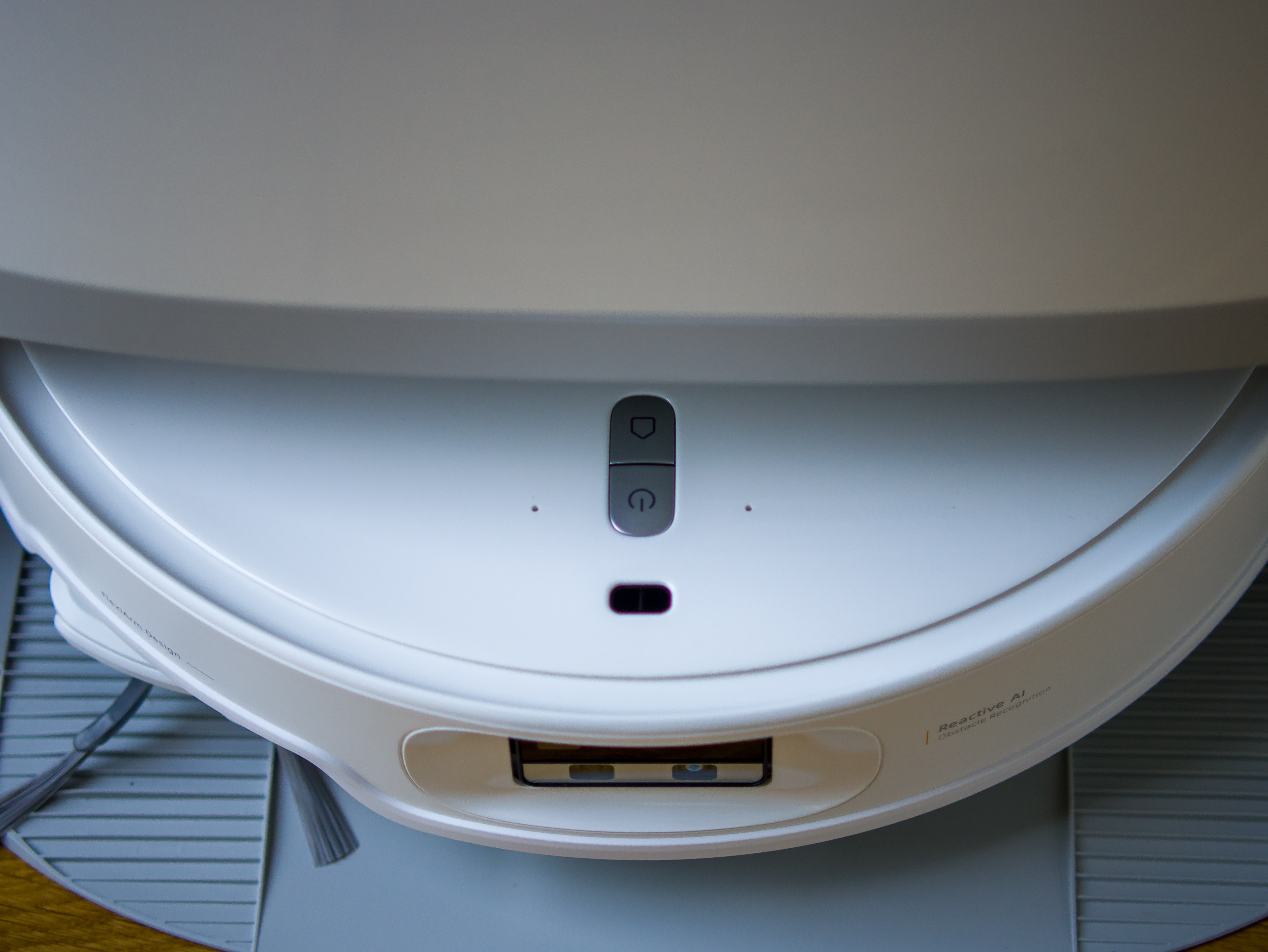 Lidaru dělá na horní straně tradičně také dvojice tlačítek – napájení a návrat do dokovací stanice. Nádoba na prach spolu s výměnným filtrem je pak tradičně ukryta pod vrchním krytem, který je přichycen pouze magneticky. Pohled okolo robota žádná velká překvapení neskýtá. V okně, vykrojeném do předního nárazníku, se uvelebila barevná kamera spolu s LED přisvícením.