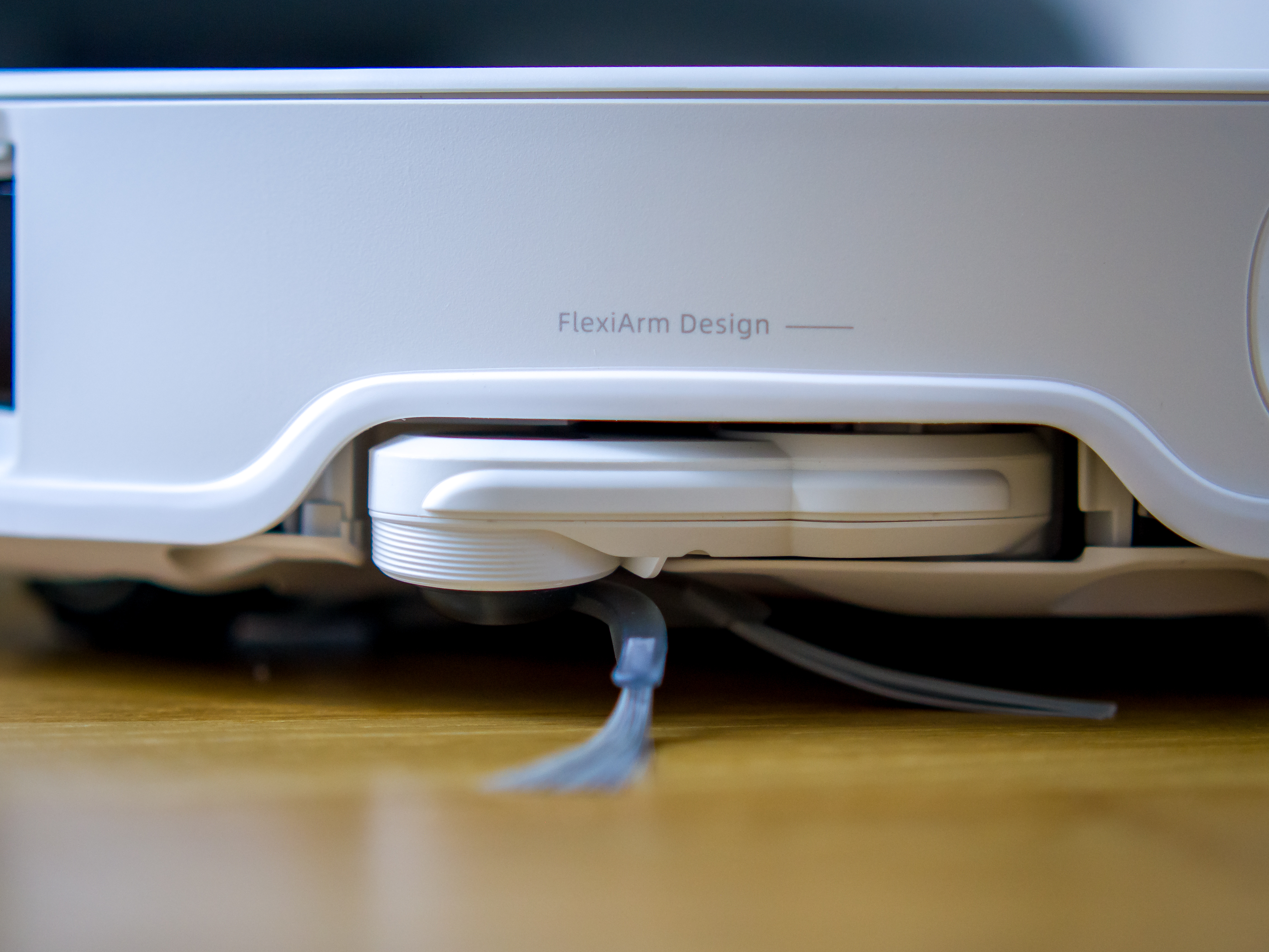 Ve druhém okně u samotného konce nárazníku, tedy na boku robota, se pak nachází laserový snímač řídící výsuv bočního kartáče a jednoho rotačního mopu. Menší zajímavost je pak na zadní straně, kde se ve společnosti napájecích kontaktů a ventilu pro čerpání vody nachází také výřez pro případ, že je Lidarová věžička zasunutá. Ani poté totiž Lidar není zcela deaktivovaný, pouze funguje s omezenou viditelností 100°.