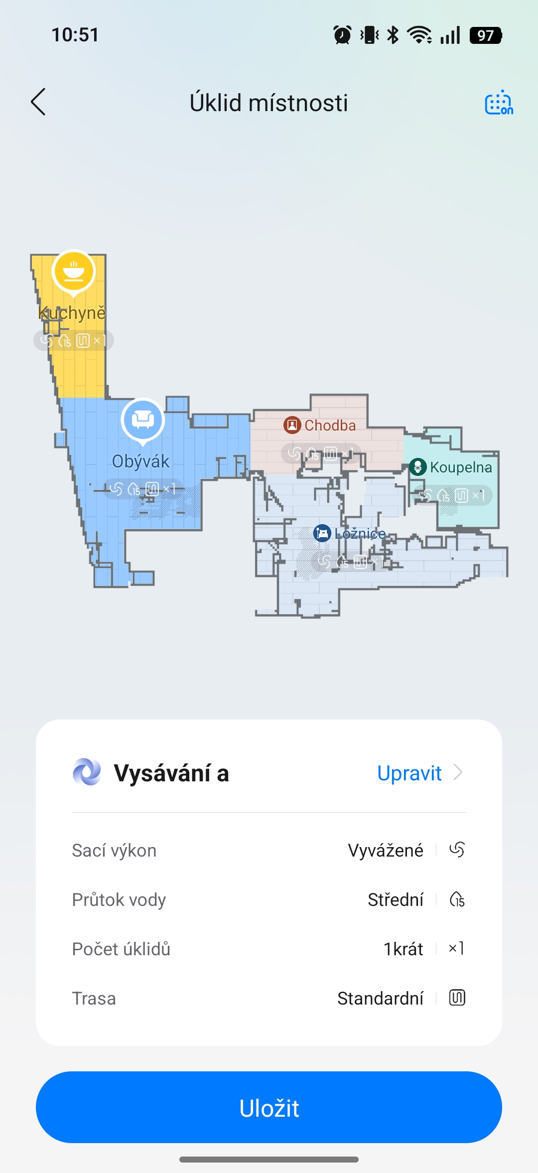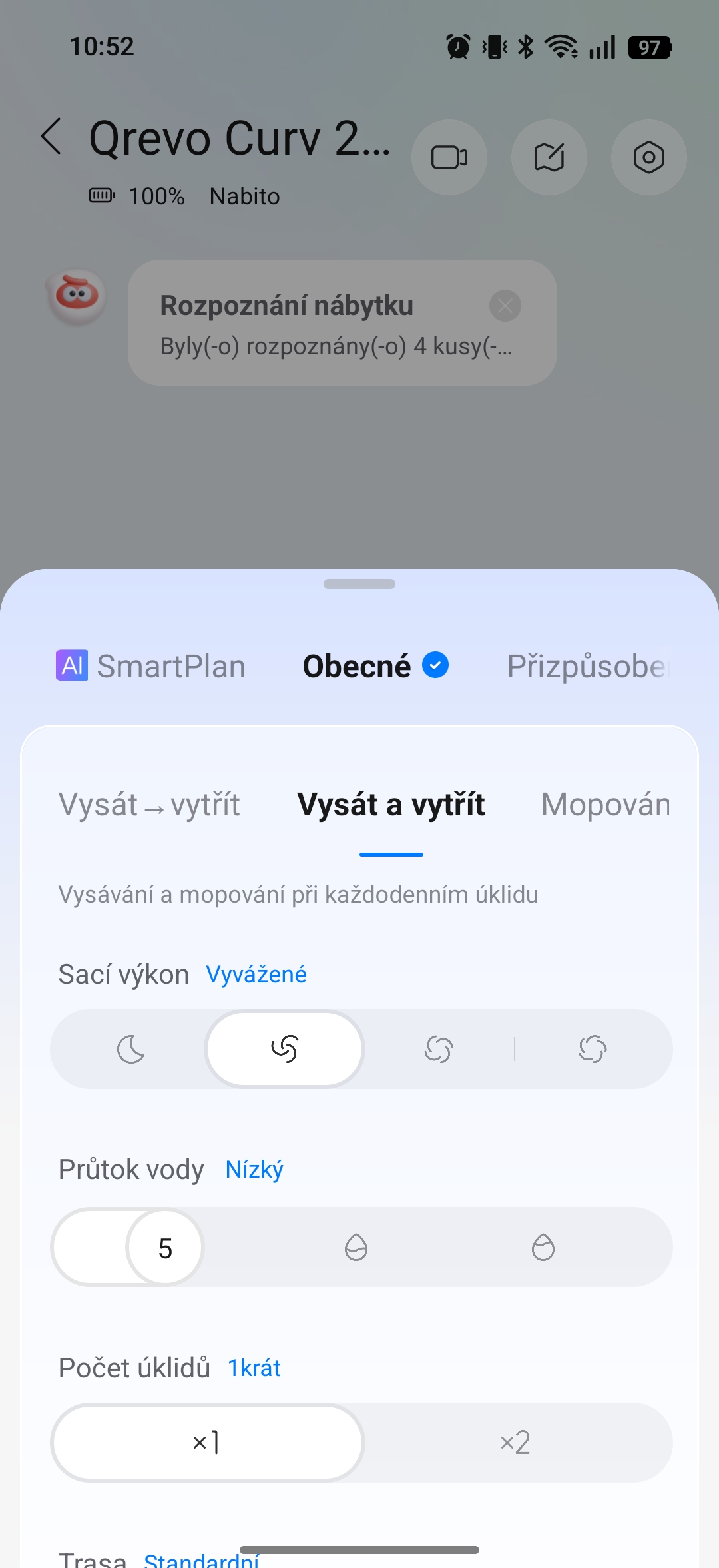 Na základní obrazovce daného vysavače pak vidíte mapu domácnosti včetně základního ovládání. Nejčastěji budete potřebovat kartu ve spodní části obrazovky. Na ní se nalézá volby režimů úklidu, okamžité spuštění úklidu i přístup k základnímu ovládání dokovací stanice včetně informací o jejím aktuálním stavu. Pro celkový úklid máte několik možností, můžete si například vybrat, zda má robot nejdříve vysát a až pak vytřít, či má oba úkony provádět najednou. U vysávání můžete definovat sací sílu, při vytírání nastavíte průtok vody a také můžete vysavači říct kolikrát má úklid provést či jakou trasu zvolit – nejrychlejší, standardní nebo hloubkové čištění pro nejdůkladnější úklid.