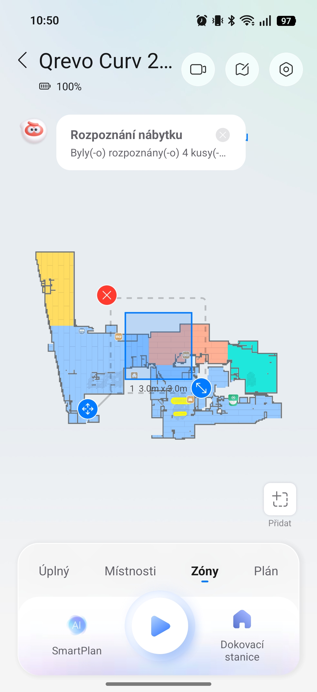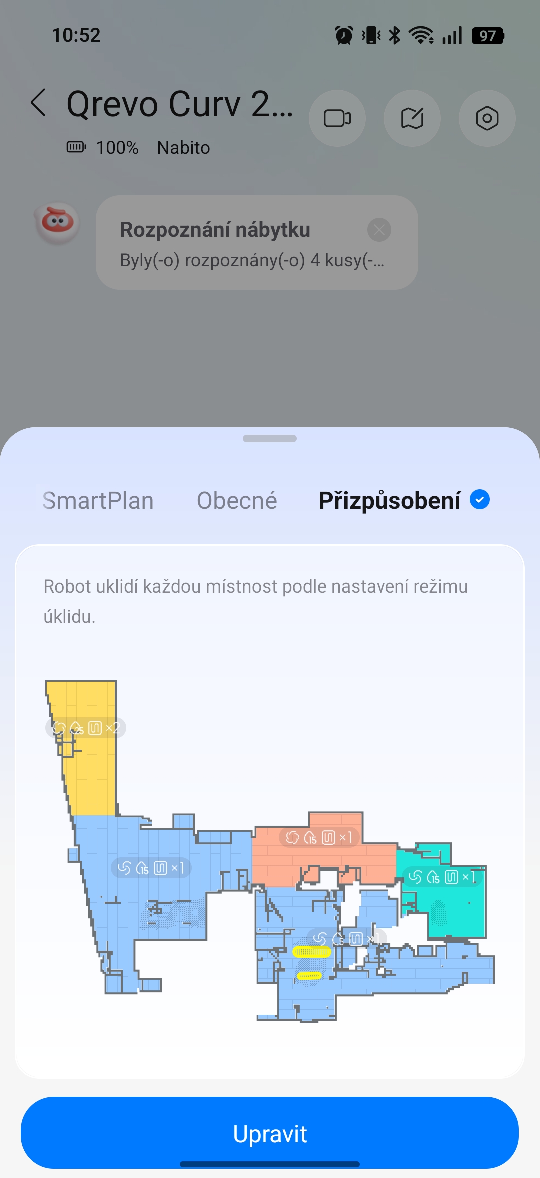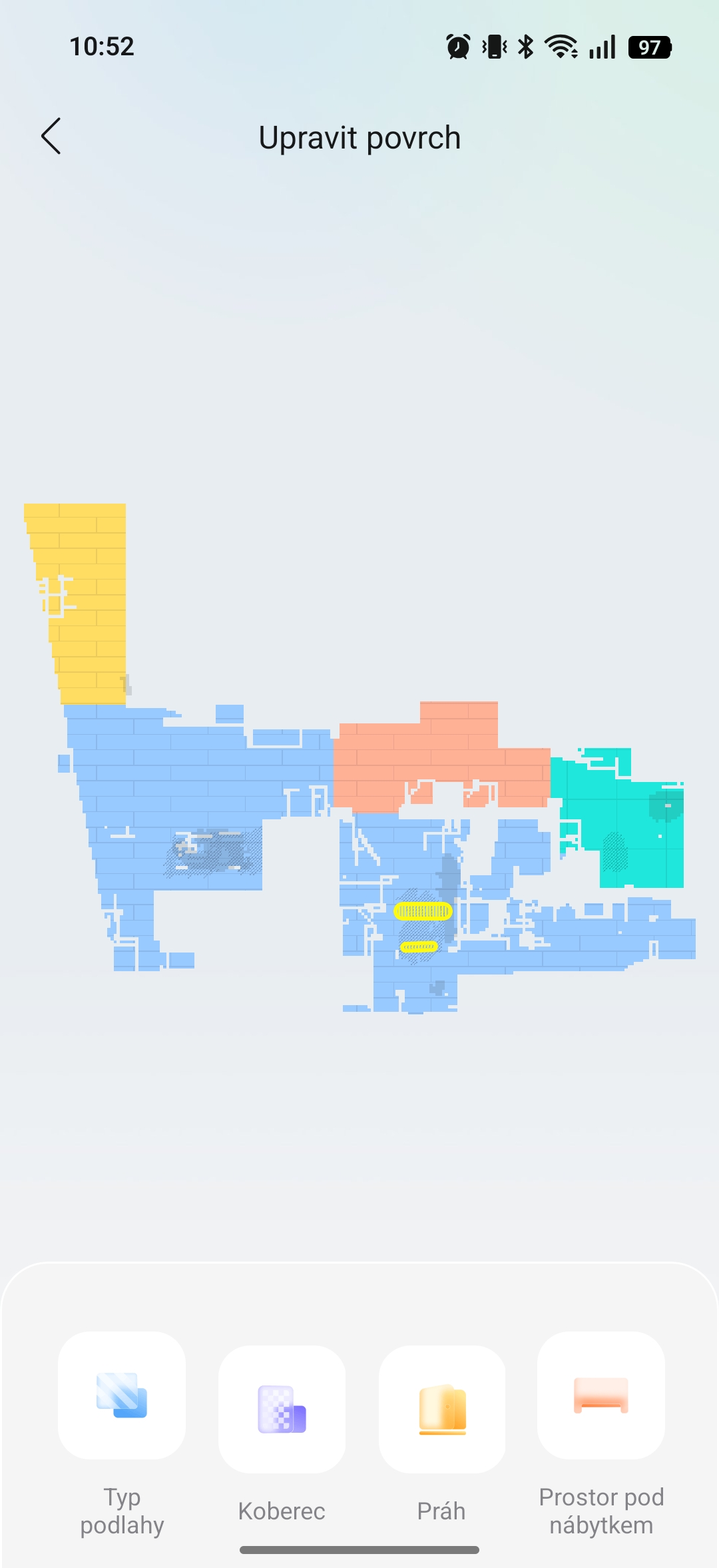 Aplikace vás při prvním spuštění provede úvodním nastavením. Během něj je potřeba spárovat vysavač a následně jej seznámit s vaší domácností včetně úvodního mapování. Aplikace se rovnou pokusí vytvořit na mapě hranice jednotlivých místností a odhadnout jejich účel. Snadno však můžete špatně detekované místnosti sloučit, rozdělit či přejmenovat. Zrovna tak můžete na mapu přidávat nábytek či pomoci vysavači s určením pozic koberců a typu podlahy – včetně orientace pokládky.