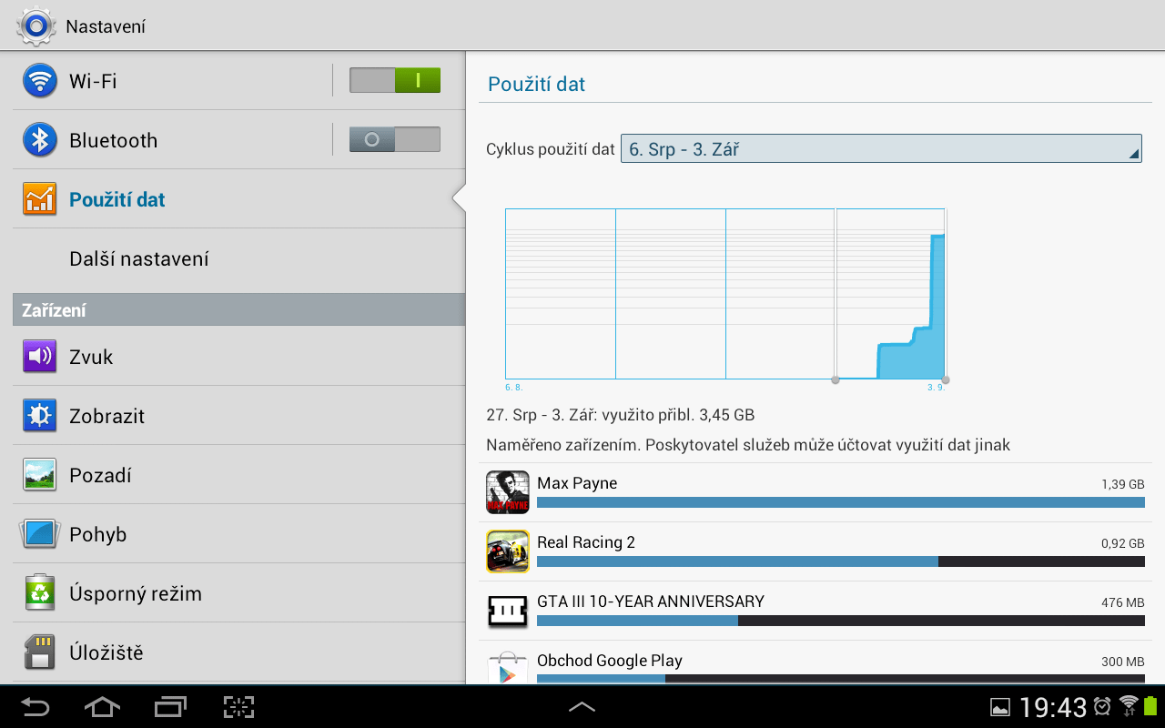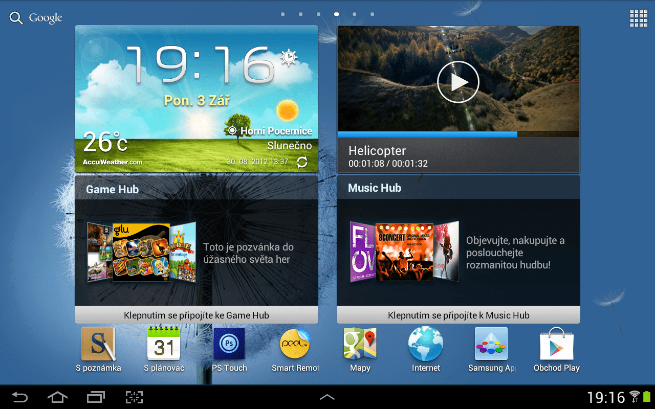 Samsung Galaxy Note 10.1 (N8010) - placka s kouzelným perem [recenze] Hlavní stránka Recenze Recenze tabletů Sdílejte: Jan Dolejš Publikováno: 6.9.2012 19:31 (Aktualizováno: 27.1.2015 16:01) 62 komentářů 62 Nástup kapacitních displejů znamenal konec pro používání stylusů, na které jsme byli zvyklí ze starší rezistivní technologie dotykových obrazovek. Společnost Samsung však představila tabletotelefon Galaxy Note, který díky speciální úpravě displeje a stylusu dokáže opět přenášet náš dotyk s vysokou přesností a citlivostí. Mnoho uživatelů dychtilo po větší verzi tohoto přístroje, která by se proměnila v tablet s možností ovládání stylusem. A konečně se dočkali. Dámy a pánové, přichází Samsung Galaxy Note 10.1. Tento přístroj přitom není taková novinka, jak by se mohlo na první pohled znát, neboť o jeho existenci jsme se dozvěděli již na únorovém veletrhu Mobile World Congress 2012 v Barceloně. Po představení však informace o tomto přístroji poněkud utichly a mezi běžné smrtelníky se tento přístroj dostal až o půl roku později. Nová verze se dočkala několika vylepšení, které se týkalo také hardwaru – Galaxy Note 10.1 totiž obsahuje čtyřjádrový procesor Exynos 4412, čímž se řadí mezi nejvýkonnější mobilní řešení. Oproti konkurentům má však již zmiňovanou výhodu v podobě stylusu S-Pen, který dokáže zaznamenávat pohyby daleko přesněji a citlivěji, než by to dokázal prst uživatele. „Větší Note“ se tak může proměnit v kreslící plátno, v elektronický zápisník či editor rovnic. A jak si s těmito výjimečnými funkcemi poradí a jak obstál v našem testu? Obsah recenze Rozbalování a první dojem Konstrukce tabletu a vzhled Technické (HW) parametry Displej Systém Rychlost, stabilita a odezva systému Domácí obrazovka Widgety Menu Notifikační lišta Zamykací obrazovka Kalendář Zprávy E-mail a Gmail Klávesnice Internetový prohlížeč Kontakty Galerie, Editor fotografií a videí Organizace času Správce souborů Používání Účty a synchronizace Menu Nastavení Pořizování screenshotů Přepínání aplikací Chytrý pohotovostní stav Správce úloh Multidisplej S-pen – kouzelný stylus na scéně Gesta S poznámka Konektivita GPS a navigace Multimédia Aplikace fotoaparát Pořizování fotografií a videa Přehrávání videa Přehrávání hudby Výdrž Výkon v testech a hráchBenchmarkyHry Slabiny, nedostatky a chyby zařízení Závěr Klady Zápory Orientační cena na našem trhu Rozbalování a první dojem Přístroj k nám do redakce dorazil v čistě bílé krabici, jejíž rozměr se blížil hodnotám 27 x 19 x 5 cm. Jak už jsme z ostatních krabic zvyklí, přístroj se nachází v horním patře, které spatříme ihned po odendání vrchního dílu balení. Po odstranění dalšího plata se dostáváme do prostoru s příslušenstvím. Zde nalezneme standardní výbavu v podobě USB kabelu, rozebíratelné nabíječky, špuntová sluchátka a náhradní špunty. U našeho přístroje nebyl dodán manuál, v prodejní verzi se však s nějakým papírovým doprovodem uživatel zcela jistě setká. S dodávanými sluchátky můžete také hravě telefonovat, neboť obsahují mikrofon a ovládání hlasitosti. Dnes již převládá spíše špuntová konstrukce sluchátek, a tak se Samsung již delší dobu uchyluje k tomuto typu. Při prvním pohledu na tablet je vidět, že si dala jihokorejská firma záležet, aby se přístroj vzhledově trochu lišil od konkurenčních výrobků. Poměrně nezvyklé je umístění reproduktorů, které nalezneme ve stříbrném rámečku kolem displeje. Přístroj na mě působí od pohledu poněkud lacině, snadno odhalíte, že stříbrný rámeček není kov, ale pouhý plast. Váha přístroje mi přišla přiměřená a díky plastové konstrukci si drží stále přijatelné hodnoty. Kvalitu zpracování však musím pochválit, neboť vše lícuje perfektně a neozývá se ani žádné vrzání či skřípání, což není u plastové konstrukce pravidlem. V ruce se přístroj drží dobře, což je však nejspíše u placatého obdélníku a tedy každého tabletu pravidlem. Po zapnutí přístroje mě vítalo dobré podání barev displeje a je vidět, že Samsung technologii PLS, kterou používá ve svých tabletech, prostě umí. Ačkoliv by přístroji mohlo slušet FullHD rozlišení, 1280 x 800 pixelů mi přišlo dostatečné a žádný rastr jsem nezaznamenal. Nejvíce jsem byl logicky zvědav na ovládání pomocí pera S-Pen, po kterém jsem intuitivně sáhl do pravého spodního rohu a stylus se zde opravdu nachází. Na vysunutí pera reagoval i přístroj, který mi po pravé straně zobrazil lištu s aplikacemi, které jsou přizpůsobeny na ovládání perem. Jako první jsem vyzkoušel aplikaci S poznámka, ve které se dá stylusem kreslit. Trochu mě překvapilo, že aby displej dokázal pohyby pera snímat, je potřeba stylus trochu na displej přitlačit. To však trochu komplikuje možnost snímání tlaku stylusu na displej a při snaze o tenčí čáru se mi stávalo, že přístroj přestal čáru zaznamenávat. Při psaní je patrné menší zpoždění, tipoval bych však hodnotu tohoto zpoždění tak na desetinu sekundy, což je hodnota, kterou uživatel nejspíše řešit nemusí. Pero má na sobě také menší tlačítko, pomocí kterého můžeme ovládat přístroj gesty. Konstrukce telefonu a vzhled Jak už je u dotykových přístrojů zvykem, nejdůležitější část je dotykový displej. Ten v případě modelu Galaxy Note 10.1 činí 10,1 palce a rozlišení se drží na hodnotě 800 x 1280 pixelů. Displej má okolo sebe bílý rámeček, který je lemován stříbrnou imitací kovu z plastu. Ve stříbrném rámečku se nachází také dvojice reproduktorů, což u tabletů rozhodně není standardem a na pře