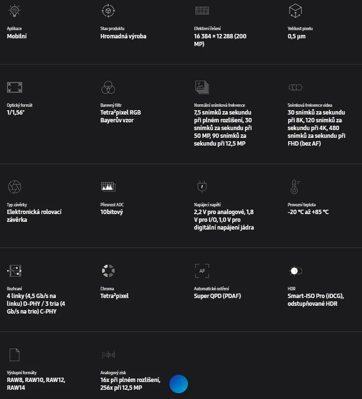 Samsung představil 200Mpx senzor ISOCELL HP5. Má maličké pixely, přesto prý dobře performuje ve tmě Hlavní stránka Zprávičky ISOCELL HP5 nabízí rozlišení 200 Mpx a velikost pixelu 0,5 μm Podporuje 2× in-sensor zoom a až 6× bezztrátové přiblížení Umožňuje natáčet 8K video při 30 fps nebo 4K při 120 fps Sdílejte: Adam Kurfürst Publikováno: 9.10.2025 14:00 Žádné komentáře 0 Samsung rozšířil svou nabídku obrazových snímačů o nový model ISOCELL HP5. Jde o 200Mpx čip s dosud nejmenší velikostí pixelu 0,5 μm, který má nabídnout lepší kvalitu obrazu i v horších světelných podmínkách. Novinka už vstoupila do hromadné výroby a podle dostupných informací se objeví v telefonech značek jako Oppo, Vivo nebo Realme. Nejmenší pixely na světě, ale více světla Při vývoji senzoru HP5 o velikosti 1/1,56″ se Samsung zaměřil na vyřešení typického problému – menší pixely obvykle znamenají méně světla a více šumu. Pomocí technologií Front Deep Trench Isolation (FDTI) a Dual Vertical Transfer Gate (D-VTG) dokázal výrobce zachovat vysokou citlivost snímače i přes rekordně malou velikost pixelu. Čip tak zvládne vytvářet jasnější a čistší fotografie i ve tmě. Specifikace senzoru ISOCELL HP5 Nový senzor využívá systém High Precision Microlens a High Transmittance ARL pro efektivnější zachycení světla. Dále přidává strukturu High Sensitivity DTI, která snižuje rušení mezi jednotlivými pixely a zlepšuje věrnost barev. Díky kombinaci těchto řešení má být obraz kontrastnější a barevně přirozenější, a to i při slabém osvětlení. Flexibilní zoom i adaptace na světlo ISOCELL HP5 zvládne tzv. in-sensor zoom s dvojnásobným přiblížením bez ztráty kvality. V kombinaci s 3× teleobjektivem pak dokáže dosáhnout až 6× optického přiblížení. Technologie Tetra²pixel umožňuje spojovat nebo oddělovat pixely podle množství světla – při šeru vznikne 12,5Mpx snímek se světelnějšími pixely (2,0 μm), zatímco za dne senzor využívá plných 200 Mpx. Rychlé zpracování a video až do 8K Díky technologii Smart ISO Pro a tzv. staggered HDR dokáže HP5 lépe vyvažovat expozici mezi světlými a tmavými částmi snímku. Procesor umělé inteligence zvládne zpracovat 200Mpx fotografie za méně než dvě sekundy. Senzor podporuje 13bitovou barevnou hloubku (až 550 miliard odstínů) a umožňuje natáčet 8K video při 30 snímcích za sekundu nebo 4K při 120 fps. Řada Samsung Galaxy S22 dostává v Evropě poslední aktualizaci Androidu spolu s One UI 8 Adam Kurfürst Zprávičky Adam Kurfürst Zprávičky Kde se s ním setkáme? Samsung už potvrdil, že ISOCELL HP5 je ve fázi masové výroby. První telefony s tímto čipem se očekávají ještě letos – zmíněny byly například Oppo Find X9 Pro nebo vivo Y500 Pro. Zajímavé je, že sám Samsung tento snímač do svých modelů zatím neplánuje nasadit, podobně jako v minulosti u některých předchozích senzorů řady ISOCELL. Víte, jaké senzory využívá váš smartphone? Zdroje: Samsung, Gizmochina, GSMArena O autorovi Adam Kurfürst Adam studuje na gymnáziu a technologické žurnalistice se věnuje od svých 14 let. Pakliže pomineme jeho vášeň pro chytré telefony, tablety a příslušenství, rád se… Více o autorovi Sdílejte: Žádné komentáře Vložit komentář isocell Samsung senzor Mohlo by vás zajímat Tohle je budoucnost Galaxy Watch: Samsung předvedl hodinky s pokročilým displejem Adam Kurfürst 8.1. Black Friday: Datart vyprodává elektroniku za absurdní ceny, našli jsme skutečné perly (aktualizováno) Jakub Kárník 6.11.2024 Unikají oficiální tapety řady Galaxy S25! Tady je stáhnete ve vysokém rozlišení Jakub Kárník 9.1. Samsung odhalil datum představení Galaxy S25, máme i oficiální rendery. Čeká nás jedno velké překvapení! Jakub Kárník 7.1. Roztomilý robůtek od Samsungu zamíří do domácností. Malý AI asistent pomůže zahnat nudu i samotu Jana Skálová 9.1. První benchmarky Galaxy S25 Ultra jsou venku! Takto si novinka vede oproti současné vlajce Jakub Kárník 2.1.