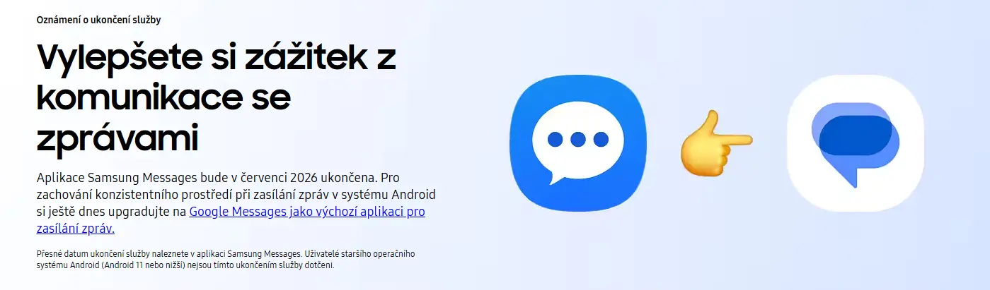 Samsung brzy ukončí svou aplikaci pro zasílání SMS. Náhradu zvolil rozumně Hlavní stránka Zprávičky Samsung oficiálně oznámil ukončení aplikace Zprávy (Samsung Messages) v červenci 2026 Uživatelé mají přejít na Google Messages, která je už výchozí na Galaxy S26 Majitelé telefonů s Androidem 11 nebo starším se změny nedočkají Sdílejte: Adam Kurfürst Publikováno: 5.4.2026 22:00 Žádné komentáře 0 Po letech spekulací a postupného ústupu do pozadí přichází definitivní konec. Samsung na svém americkém webu zveřejnil oznámení o ukončení podpory vlastní aplikace Zprávy, kterou po léta dodával jako výchozí na svých telefonech Galaxy. Od letošního července již nebude možné prostřednictvím Samsung Messages odesílat zprávy s výjimkou čísel tísňových služeb nebo kontaktů pro případ nouze, které jste si v zařízení nastavili. Náhradou se stanou Zprávy Google Co to znamená v praxi? Koho se změna netýká Náhradou se stanou Zprávy Google Samsung uživatele v aplikaci upozorní na blížící se konec a provede je přechodem na Zprávy Google. U zařízení s Androidem 14 a novějším se ikona aplikace od americké společnosti automaticky přesune do doku na domovské obrazovce. „Přesné datum ukončení služby najdete v aplikaci Samsung Messages,“ dodává výrobce na svém webu. Oznámení o ukončení podpory Samsung Messages (převzato z webu výrobce, strojově přeloženo z angličtiny) Krok nepřekvapuje. Už v červenci 2024 se Zprávy Google staly nativní aplikací pro zasílání SMS/MMS a RCS zpráv na tehdy čerstvě vydaných skládacích telefonech Galaxy Z Flip6 a Galaxy Z Fold6, s tím že aplikace Samsung Messages nebyla vůbec předinstalovaná. Co to znamená v praxi? Po ukončení podpory nebude možné odesílat zprávy přes Samsung Messages kromě nouzových kontaktů. Aplikace zmizí z Galaxy Store a přestane být dostupná ke stažení. Majitelé starších hodinek s Tizen OS (před Galaxy Watch4) ztratí možnost zobrazit historii konverzací, i když samotné odesílání a čtení zpráv zůstane funkční. Samsung Galaxy S26 FE se objevil v Geekbench. Co únik prozradil o výbavě? Adam Kurfürst Zprávičky Adam Kurfürst Zprávičky U zařízení vydaných před rokem 2022 může přechod dočasně narušit probíhající RCS konverzace. Ty se obnoví, jakmile obě strany přejdou na Google Messages. Klasické SMS a MMS zůstanou funkční bez přerušení. Koho se změna netýká Samsung upřesňuje, že zařízení s Androidem 11 nebo starším ukončení podpory neovlivní. Důvodem jsou pravděpodobně problémy s kompatibilitou. Pokud tedy máte starší telefon Galaxy, Samsung Messages vám zůstane. Používáte Samsung Messages, nebo už jste přešli na Google Messages? Zdroje: Samsung, 9to5Google, Android Authority O autorovi Adam Kurfürst Adam studuje na gymnáziu a technologické žurnalistice se věnuje od svých 14 let. Pakliže pomineme jeho vášeň pro chytré telefony, tablety a příslušenství, rád se… Více o autorovi Sdílejte: Žádné komentáře Vložit komentář Samsung Zprávy Google Mohlo by vás zajímat Tohle je budoucnost Galaxy Watch: Samsung předvedl hodinky s pokročilým displejem Adam Kurfürst 8.1.2025 Black Friday: Datart vyprodává elektroniku za absurdní ceny, našli jsme skutečné perly (aktualizováno) Jakub Kárník 6.11.2024 Unikají oficiální tapety řady Galaxy S25! Tady je stáhnete ve vysokém rozlišení Jakub Kárník 9.1.2025 Samsung odhalil datum představení Galaxy S25, máme i oficiální rendery. Čeká nás jedno velké překvapení! Jakub Kárník 7.1.2025 Roztomilý robůtek od Samsungu zamíří do domácností. Malý AI asistent pomůže zahnat nudu i samotu Jana Skálová 9.1.2025 První benchmarky Galaxy S25 Ultra jsou venku! Takto si novinka vede oproti současné vlajce Jakub Kárník 2.1.2025
