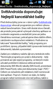 SvětAndroida doporučuje: 6 nejlepších kancelářských balíků Hlavní stránka TOP Sdílejte: Karel Kilián Publikováno: 19.4.2012 06:00 (Aktualizováno: 10.5.2013 16:37) 19 komentářů 19 Před dvěma týdny jsme se v rámci cyklu SvětAndroida doporučuje věnovali programům pro měření výkonu neboli benchmarkům. Dnes měli dostat slovo čtenáři, ale protože jsme patrně vyčerpali všechny aplikace ve zvoleném segmentu a neobdrželi jsme ani jednu čtenářskou nominaci, pokračujeme dnes dalším dílem, založeném na doporučení redaktorů. Podíváme se na takzvané „kancelářské balíky,“ tedy programy pro prohlížení, úpravy, případně další zpracování textových dokumentů, tabulek a prezentací. Zadání pro redaktory našeho serveru tentokrát znělo: „Nominujte programy pro práci s dokumenty – tedy primárně asi (ale nejen) programy, ve kterých může uživatel prohlížet či dokonce editovat textové dokumenty (MS Word), tabulky (MS Excel), prezentace (MS PowerPoint), nebo jiné dokumenty (např. PDF).“ Celkem se zúčastnilo pět redaktorů, kteří nominovali šest aplikací. Poprvé v historii se stalo, že žádný program nebyl nominován více než jednou, takže o pořadí v tomto článku rozhodovalo primárně hodnocení v Google Play. Pořadí je tedy tentokrát určeno dle následujícího klíče: podle hodnocení v Google Play (od nejvyšší známky), v případě shody dále podle celkového počtu hodnocení v Google Play (více hodnocení = lépe), v případě shody dále podle počtu pětihvězdičkových hodnocení (více hodnocení = lépe). Jedna z nominovaných aplikací není v Google Play, takže jsme ji umístili úplně nakonec. Jak funguje cyklus SvětAndroida doporučuje/Čtenáři doporučují? týden sbíráme doporučení od redaktorů, za další týden vychází článek „SvětAndroida doporučuje …,“ následující týden sbíráme doporučení od čtenářů (formulář najdete na konci článku), za další týden vychází článek „Čtenáři doporučují …“ na stejné téma. Pojďme se tedy podívat na to, jaké kancelářské balíky nominovali redaktoři Světa Androida. Kingsoft Office S převahou nejvyššího hodnocení 4,5 body z pěti možných se na prvním místě dnešního přehledu umístil Kingsoft Office, nominovaný Tomášem Hochmuthem. Tomáš svou nominaci poměrně podrobně zdůvodnil: „Dle mého názoru se jedná o názornou ukázku vyladěné a bezproblémově funkční aplikace, která je navíc zdarma. Kancelářský balík Kingsoft Office umožňuje čtení i editaci klasických wordovských, excelovských i powerpointích souborů, včetně nejnovějších přípon docx, xlsx a pptx. Další výhodou je schopnost čtení PDF souborů, čili po instalaci Kingsoft Office je možné ihned odinstalovat Adobe Reader. Při úpravách dokumentů máme k dispozici vše, co v klasickém MS Word 2010 – text můžeme zarovnávat, stylizovat a formátovat. Prezentace lze přepnout do full-screen módu a přiřadit jim i nějaké ty přechodové efekty. Navíc lze balík propojit s Dropboxem a mít tak své dokumenty ihned dostupné bez nutnosti je hledat na webu či v aplikaci Dropboxu. Když spojím bezvadnou funkčnost s příjemným uživatelským rozhraním, znamená to, že pro mne je Kingsoft Office numero uno.“ Sami autoři aplikace na prvním místě zdůrazňují fakt, že svůj produkt nabízejí zdarma, což je zásadní rozdíl od většiny konkurentů. Podle popisu v Google Play umí Kingsoft Office prohlížet a editovat soubory DOC, DOCX, TXT, XLS, XLSX, PPT, PPTX a PDF (to, pochopitelně, pouze prohlížet) a vytvářet DOC, DOCX, XLS, XLSX. Z dalších funkcí jmenujme: Integrovaný správce souborů, který může automaticky organizovat vaše dokumenty spolupráce s poštovní aplikací – můžete otevřít přílohu a po úpravách ji hned odeslat zpět podpora cloudových úložišť přes protokol WebDAV možnost čtení v režimu celé obrazovky výběr textu s lupou otevírání a ukládání dokumentů chráněných heslem v textových dokumentech MS Word možnost práce se záhlavím a zápatím, komentáři a revizemi v tabulkách MS Excel možnost ukotvení příček, automatické doplňování, práce se vzorci, podpora grafů Také uživatelé v hodnoceních vyjadřují svou spokojenost s tímto balíkem. Například Martin uvádí: „Hledal jsem aplikaci zdarma, která by uměla dokumenty office i editovat. Našel jsem a jsem spokojený.“ To potvrzují i další: „Tak tohle je naprosto dokonalá aplikace. Otevře naprosto vše a má velice slušné editační schopnosti. Vřele doporučuji! Na HTC EVO chod bez nejmenších problémů.“ Také majitelé výkonnostně slabších telefonů jsou s Kingsoft Office spokojení: „Jako Office do mobilu super. Z mobilu vymáčkne maximum. Otevře vše, edituje vše a uloží kam libo. Na Galaxy mini bez nejmenších problémů.“ WPS Office-PDF,Word,Sheet,PPT WPS SOFTWARE PTE. LTD. Instalovat (Free) Google Play Documents To Go 3.0 Balík Documents To Go 3.0 dosáhl v Google Play hodnocení 4,2, tedy stejně, jako následující aplikace. Hodnotilo ho ale nejvíce uživatelů a počet instalací převyšuje úctyhodných deset milionů. Do dnešního přehledu nominoval Documents To Go 3.0 Karel Kilián. „S dokumenty na Androidu příliš často nepracuji, nicméně na Documents To Go 3.0 jsem narazil při recenzích celé řady telefonů,“ říká, a dodává: „Myslím, že jde o dobrý balík, poskytující vše, co by uživatel mohl potřebovat. Škoda jen, že placená verze patří k těm nejdražším aplikacím, které lze v Google Play sehnat. Skoro 300 korun je přeci jen poměrně hodně.“ Documents To Go je dostupný ve dvou verzích – varianta zdarma umí otevírat a prohlížet dokumenty ve formátu MS Word, Excel a PowerPoint. Neumí je ale upravovat, stejn