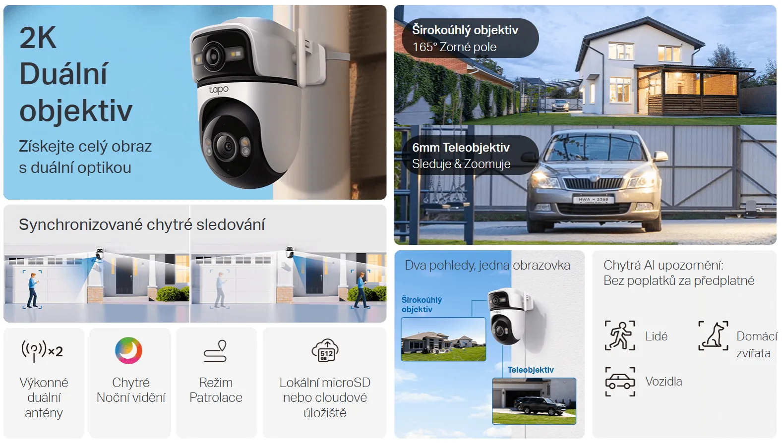 Nová venkovní kamera TP-Link láká na dva objektivy, zaostření jedním klepnutím či AI detekce Hlavní stránka Zprávičky TP-Link rozšiřuje nabídku venkovních kamer o model Tapo C545D s duální optikou za cenu od 2 321 Kč Kamera kombinuje širokoúhlý objektiv s úhlem 165° a 6mm teleobjektiv s automatickým sledováním pohybu Oba objektivy nahrávají v 2K rozlišení a AI detekce osob, zvířat i vozidel funguje bez měsíčního poplatku Sdílejte: Adam Kurfürst Publikováno: 8.1.2026 14:00 Žádné komentáře 0 TP-Link uvedl na český trh další bezpečnostní kameru se dvěma objektivy. Tapo C545D je určená pro užití ve venkovních prostorech a kombinace širokoúhlého záběru a teleobjektivu s možností otáčení má minimalizovat slepá místa a zachytit detaily, které by jinak unikly. Kamera míří na majitele domů, garáží i menších firem, kteří chtějí pokrýt větší plochu jedním zařízením. Na našem trhu ji pořídíte od 2 321 Kč. Dva objektivy, dva pohledy najednou Hlavní předností Tapo C545D je její duální optický systém. Horní širokoúhlý objektiv nabízí zorné pole 165° a slouží k monitorování rozsáhlé scény. Spodní 6mm teleobjektiv se dokáže automaticky otáčet a naklánět, přičemž při detekci pohybu se sám zaměří na pohybující se objekt a sleduje ho. Oba objektivy zaznamenávají v 2K rozlišení (2304 × 1296 pixelů), což by mělo stačit pro rozpoznání obličejů nebo registračních značek. Zajímavá je funkce chytrého zaostření jedním klepnutím – v aplikaci stačí vybrat oblast v širokoúhlém záběru a teleobjektiv se na ni okamžitě zaměří. Kamera také umožňuje sledovat dvě oddělené oblasti současně na jedné obrazovce. AI detekce bez měsíčních poplatků Tapo C545D disponuje AI detekcí, která rozpoznává osoby, domácí zvířata a vozidla. Při zachycení události kamera odešle push notifikaci do mobilní aplikace. Na rozdíl od některých konkurenčních řešení TP-Link za tuto funkci neúčtuje měsíční poplatek – funguje přímo v zařízení bez nutnosti předplatného. Pro noční snímání nabízí kamera tři režimy: barevné noční vidění s vestavěnými reflektory, klasický infračervený režim s dosahem až 30 metrů, nebo automatický chytrý režim, který přepíná mezi nimi podle světelných podmínek. Připojení a ukládání záznamů Kamera podporuje připojení přes Wi-Fi i Ethernet, což oceníte v místech se slabším bezdrátovým signálem. Záznamy lze ukládat na microSD kartu s kapacitou až 512 GB nebo do cloudového úložiště Tapo Care, které je ale zpoplatněné. Samozřejmostí je obousměrná komunikace díky vestavěnému mikrofonu a reproduktoru. Kamera je kompatibilní s hlasovými asistenty Amazon Alexa, Google Assistant i Samsung SmartThings, takže živý přenos můžete sledovat například na displeji Echo Show. Venkovní odolnost a instalace Tapo C545D je určena pro celoroční venkovní provoz. Certifikace IP66 zajišťuje odolnost proti dešti, prachu i sněhu. Kamera funguje v teplotním rozsahu od -30 °C do 60 °C, takže by měla zvládnout jak české zimy, tak letní vedra. Instalovat ji můžete na zeď, strop nebo pomocí volitelného držáku na tyč. Cena a dostupnost TP-Link Tapo C545D na náš trh přišla s doporučenou cenou 2 899 Kč, u některých prodejců ji ale seženete již od 2 321 Kč. Zaujala vás kamera s duálním objektivem? Zdroje: TZ, TP-Link O autorovi Adam Kurfürst Adam studuje na gymnáziu a technologické žurnalistice se věnuje od svých 14 let. Pakliže pomineme jeho vášeň pro chytré telefony, tablety a příslušenství, rád se… Více o autorovi Sdílejte: Žádné komentáře Vložit komentář bezpečnostní kamera česko Chytrá domácnost Kamera TP-Link Mohlo by vás zajímat Velký výprodej chytrých zásuvek v Lidlu! Některé modely koupíte za hubičku Jana Skálová 8.1.2025 Zpestřete si domácnost s chytrým světlem z Lidlu. Teď je o několik stovek levnější Adam Kurfürst 3.1.2025 TP-Link ukázal parádní chytrý zámek. Odemknete ho skenem dlaně a možná přijde i do Česka Adam Kurfürst 8.1.2025 Xiaomi zahajuje Black Friday! Zlevnily mobily, televize i chytrá domácnost, vybrali jsme TOP nabídky Adam Kurfürst 30.10.2024 Je vám doma horko? Lidl zlevnil parádní chytrou klimatizaci na minimum, můžete ji ovládat mobilem Jakub Kárník 10.7.2024 LIDL má zase skladem extra levný Wi-Fi zesilovač Xiaomi. Moc dlouho nečekejte, zájem je vysoký Adam Kurfürst 13.12.2024