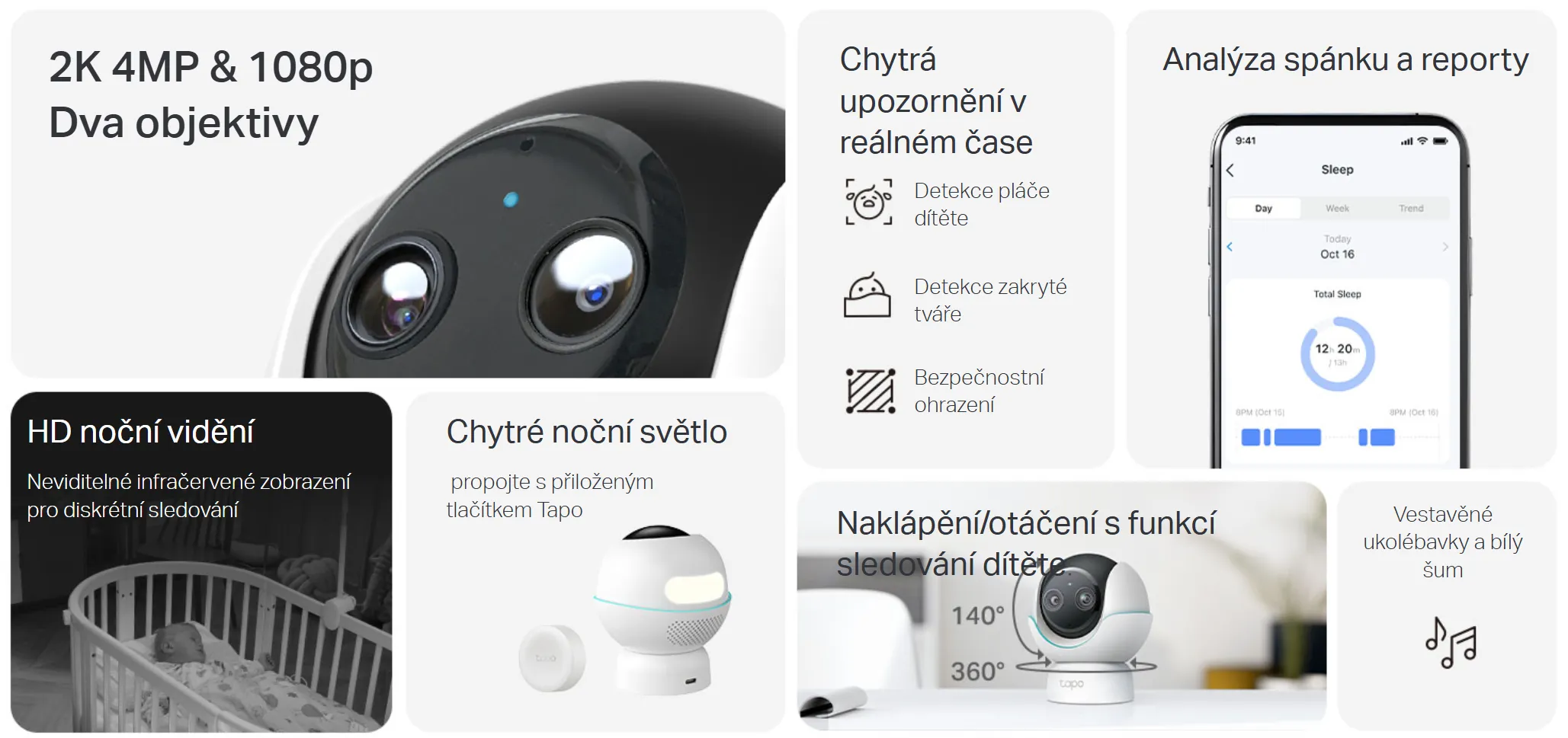 TP-Link do Česka přinesl chytrou chůvičku s dvěma objektivy. Detekuje pláč a analyzuje spánek dítěte Hlavní stránka Zprávičky TP-Link uvedl dětskou chůvičku Tapo C840 s duální optikou a 2K rozlišením Nabízí AI detekci pláče, sledování pohybu a analýzu spánku dítěte Stojí 3 999 Kč a funguje bez nutnosti jakéhokoli předplatného Sdílejte: Adam Kurfürst Publikováno: 20.10.2025 16:00 Žádné komentáře 0 Společnost TP-Link rozšířila řadu chytrých kamer Tapo o nový model Tapo C840, zaměřený především pro rodiče malých dětí – prezentuje se tedy především jako chůvička. Novinka spojuje kvalitní obraz, umělou inteligenci a praktické funkce, které pomáhají sledovat dítě bezpečněji a s větším klidem. Na našem trhu je novinka k dispozici za 3 999 Kč. Hlavní senzor s 2K rozlišením v doprovodu teleobjektivu Chůvička je vybavena dvěma objektivy – širokoúhlým 2K (4 MP) pro celkový přehled o místnosti a teleobjektivem s rozlišením 1080p pro detailní pohled na tvář dítěte. Kamera se dokáže otáčet o 360° a naklánět o 114°, takže rodiče mají jistotu, že jim nic neunikne. Funkce inteligentního sledování pohybu navíc zajišťuje, že dítě zůstane neustále v záběru. Umělá inteligence, která opravdu pomáhá Vestavěná AI dokáže rozpoznat pláč dítěte, zakrytý obličej nebo opuštění vymezené bezpečnostní zóny. Na všechny události kamera okamžitě upozorní prostřednictvím aplikace Tapo, aniž by bylo potřeba předplatné. Díky funkci Safety Fence si mohou rodiče nastavit virtuální hranice, aby věděli, kdy se dítě pohybuje mimo bezpečný prostor. Funkce pro klidný spánek a lepší přehled Tapo C840 nabízí obousměrnou komunikaci s potlačením šumu, přehrávání ukolébavek a bílého šumu pro snadnější usínání. Noční vidění využívá neviditelné infračervené světlo, které dítě neruší, a chytré noční světlo lze ovládat tlačítkem Tapo nebo přímo z aplikace. TP-Link Tapo C840 se dodává se třemi typy montážních stojanů. Chůvičku tak lze umístit na zeď nebo zábradlí dětské postýlky Zajímavou funkci představuje analýza spánku, která sleduje délku a kvalitu odpočinku a z dat vytváří denní i týdenní reporty. Kamera umí také automaticky pořizovat snímky a krátká videa důležitých okamžiků – od prvních úsměvů po první krůčky – a ukládat je na microSD kartu (až 512 GB) nebo do cloudu Tapo Care. Bezpečí a snadné propojení se smart home Soukromí hlídá fyzické zakrytí objektivu, nastavitelné zóny soukromí a 128bitové šifrování AES. Kamera se instaluje jednoduše – lze ji umístit na stůl, stěnu nebo připevnit k postýlce. Kromě aplikace Tapo podporuje i hlasové ovládání přes Alexa, Google Assistant, Apple HomeKit a Samsung SmartThings. Už jste někdy zkoušeli chytrou dětskou chůvičku? Jakou funkci byste ocenili nejvíc? Zdroje: TZ, TP-Link O autorovi Adam Kurfürst Adam studuje na gymnáziu a technologické žurnalistice se věnuje od svých 14 let. Pakliže pomineme jeho vášeň pro chytré telefony, tablety a příslušenství, rád se… Více o autorovi Sdílejte: Žádné komentáře Vložit komentář česko Chytrá domácnost TP-Link Mohlo by vás zajímat Velký výprodej chytrých zásuvek v Lidlu! Některé modely koupíte za hubičku Jana Skálová 8.1. Zpestřete si domácnost s chytrým světlem z Lidlu. Teď je o několik stovek levnější Adam Kurfürst 3.1. TP-Link ukázal parádní chytrý zámek. Odemknete ho skenem dlaně a možná přijde i do Česka Adam Kurfürst 8.1. Xiaomi zahajuje Black Friday! Zlevnily mobily, televize i chytrá domácnost, vybrali jsme TOP nabídky Adam Kurfürst 30.10.2024 Je vám doma horko? Lidl zlevnil parádní chytrou klimatizaci na minimum, můžete ji ovládat mobilem Jakub Kárník 10.7.2024 LIDL má zase skladem extra levný Wi-Fi zesilovač Xiaomi. Moc dlouho nečekejte, zájem je vysoký Adam Kurfürst 13.12.2024