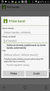 Třetí tlačítko slouží ke správě RSS kanálů, ze kterých je možné manuálně nebo automaticky stahovat publikované torrenty. V takovém případě budete zadávat název kanálu, adresu RSS zdroje, můžete povolit nebo zakázat automatické stahování nových souborů, případně filtrovat na základě klíčových slov.