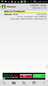 V pravém horním rohu jsou průběžně zobrazovány údaje o rychlosti stahování/odesílání dat a volném místě v úložišti. Na SGS3 s CyanogenModem program vybral pro ukládání interní paměť zařízení, ačkoli na paměťové kartě byl k dispozici více než dvojnásobek prostoru. Naštěstí je možné to změnit v nastavení v sekci Adresáře-Nastavit adresář pro ukládání.