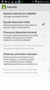 • Adresáře – nastavení adresáře pro ukládání, zapnutí/vypnutí skenování médií po dokončení, přesun stažených souborů na jiné místo, automatické stahování torrentů, jež se objeví v určeném adresáři.