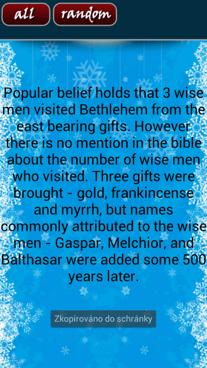 Vánoční nadílka 22 aplikací a tapet. Zkraťte dětem i sobě čekání na Štědrý den! Hlavní stránka Recenze Recenze na aplikace Sdílejte: Karel Kilián Publikováno: 10.12.2013 06:00 (Aktualizováno: 17.11.2016 11:01) 13 komentářů 13 Štědrý den se blíží každým okamžikem, vy svědomitější už máte určitě nakoupené dárky pro všechny kolem, ovšem neměli byste zapomenout na jednoho velmi důležitého člena vaší domácnosti! Vzhledem k zaměření tohoto serveru již patrně tušíte, že máme na mysli telefon nebo tablet s Androidem. Přinášíme vám výběr těch nejzajímavějších aplikací a nejhezčích tapet, jež vnesou do vašeho křemíkového kamaráda tu správnou vánoční atmosféru. Vánoční nadílka 22 aplikací Raději předem upozorňujeme, že většina aplikací pochází ze Spojených států, kde je hlavní vánoční postavou Santa Claus. Chápeme, že čeští uživatelé často lpí na tradičním Ježíškovi, nicméně komerční potenciál této figurky je nesrovnatelně menší – přeci jen kojenec roznášející dárky je o trochu absurdnější a obtížněji ztvárnitelnou představou než otylý postarší vousáč v rudém oděvu. Magic Christmas Coloring Book Prosinec je nesporně vzrušujícím měsícem plným radostných očekávání nejdůležitějších zimních svátků – Vánoc a Nového roku. Pokud chcete zkrátit čas svým dětem, nainstalujte jim Magic Christmas Coloring Book – aplikaci, ve které mohou objevovat vánoční obrázky díky „teplu svých dlaní“. Dítě pohybem prstu po obrazovce postupně odkryje celou scénu za doprovodu sváteční hudby. Magic Christmas Coloring Book Magic Christmas Coloring Book Magic Christmas Coloring Book si zatím stáhlo přes tisíc uživatelů a jeho průměrná známka je 5,0. 25 MB velký balíček zdarma nainstalujete na Android 2.3 a vyšší. Christmas Ringtones Co to slyšíme? Vám ještě nezvoní telefon ve vánočním duchu? Tak to je ten správný čas okamžitě zjednat nápravu! Proč to dělat složitě, když to jde jednoduše? Stačí stáhnout aplikaci Christmas Ringtones a hned budete mít na výběr z bezmála čtyřicítky těch nejvánočnějších skladeb, skladbiček a zvuků, jež jsou průběžně doplňovány. Tapnutím na tón si ho můžete poslechnout, a pokud se vám zalíbí, stačí ho nainstalovat a poté zvolit jako výchozí v systémovém nastavení. Christmas Ringtones Christmas Ringtones Christmas Ringtones Christmas Ringtones už vyzkoušelo více než padesát tisíc uživatelů, přičemž průměrná udělená známka 4,9 zní velice slibně. Balíček je velký 9,4 MB a použít ho můžete na Androidu 2.0 a novějším. Christmas Ringtones 2024 Vipos Apps Instalovat (Free) Google Play 100 Christmas Gifts Potřebujete zabavit své potomky? Nainstalujte jim sérii „miniher“, jejichž cílem je pomoci Santa Clausovi s otevřením všech dárků. 100 Christmas Gifts 100 Christmas Gifts 100 Christmas Gifts Hlavní vlastnosti této aplikace v bodech: Zábavné hlavolamy. Zcela zdarma. Kompletní využití funkcí zařízení! Návykové mini hry. Nádherná grafika a zvuk. Vyvážené úrovně obtížnosti od velmi jednoduchých až po velmi těžké. 100 Christmas Gifts 100 Christmas Gifts 100 Christmas Gifts Vyřešením hlavolamu, spočívajícím v přesouvání a odkrývání správných objektů na příslušná místa se odemknou dveře a hráč se dostane do další úrovně. Každý level pochopitelně obsahuje jinou hádanku. Sbírku her „vše v jednom“ si nainstaloval více než milion uživatelů a průměrná známka je 4,8. Stahovat budete 12 MB velký balík, který lze instalovat na Android 2.2 a vyšší. Christmas Live Wallpaper Počítáte, kolik času ještě zbývá do Štědrého dne? Abyste to měli jednodušší, můžete si nainstalovat tuto živou vánoční tapetu, která vám zbývající čas ukáže přímo na domovské obrazovce. Ve výchozím stavu prozáří váš displej 3D světla ve tvaru vánočního stromku. Ve verzi zdarma dostanete pouze Vánoce, ale pokud budete ochotni sáhnout do peněženky a utratit čtyřicet korun, získáte navíc například scénu s ohňostrojem, odpočet do přelomu roku či k jinému datu a řadu dalších scenérií a možností nastavení. Christmas Live Wallpaper Christmas Live Wallpaper Christmas Live Wallpaper Verzi zdarma z Obchodu Play nainstalovalo více než pět milionů uživatelů, kteří v průměru udělili známku 4,7. 1,6 MB velký balíček můžete použít na zařízeních s Androidem 2.2 a vyšším. Christmas Live Wallpaper Free Jetblack Software Instalovat (Free) Google Play Talking Santa meets Ginger Pokud vám něco říkají názvy aplikací Talking Tom Cat nebo Talking Ben, pak už s velkou pravděpodobností tušíte, o co půjde v Talking Santa meets Ginger. Vězte tedy, že Ginger je nezbedný synovec mluvící kočky jménem Tom. Spolu se vydávají do nákupního centra, kde Ginger poprvé uvidí Santu. Milý starý Santa si myslí, že ho čeká další běžný rozhovor s dítětem na téma jeho vánočních přání, ale Ginger má v rukávu nejedno překvapení. Skrze obrazovku může malý kocour Santu lechtat, kopnout ho, tahat za vousy, strkat prst do nosu, zapálit mu čepici, dát mu výbušný balíček a provádět řadu dalších neplech. Talking Santa meets Ginger Talking Santa meets Ginger Talking Santa meets Ginger Co aplikace umí? Promluvte na Santu a on bude opakovat vaše slova. Polechtejte Santu a sledujte jeho veselé reakce, případně mu vlepte facku, ať překvapeně kouká! Můžete zkusit pozlobit Gingera, který umí interaktivně reagovat. Postrčením vláčku ho vykolejíte, po stisku tlačítka s píšťalkou mašinka zahouká. Zazvoňte na vánoční stromeček potřesením telefonu, nebo klepnutím na zvonek. Po zmáčknutí tlačítka s kočičí tlapkou bude Ginger r