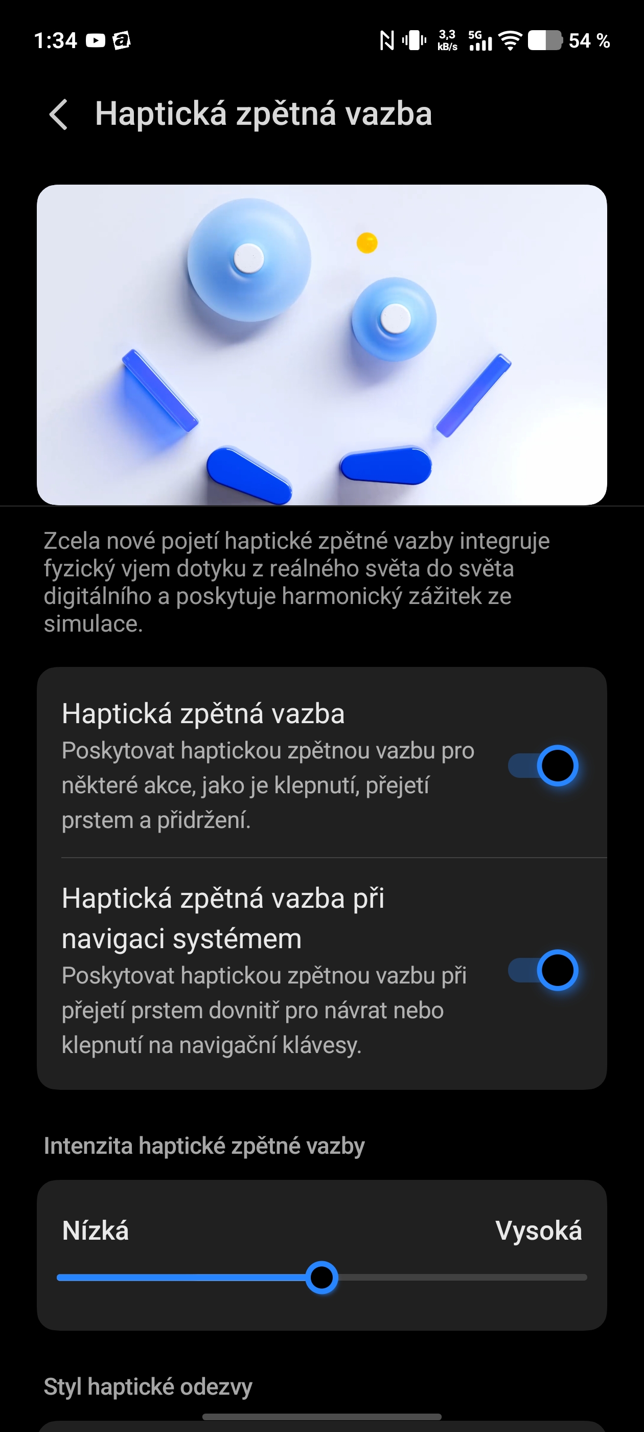 Skvělá je pak haptická zpětná vazba. Nejen, že je příkladně přesná díky čemuž umocňuje dobrý dojem z používání telefonu. Můžete si ji i přizpůsobit k obrazu svému. Kromě samotné intenzity vibrací je zde i nastavení jejího stylu. Prvním stylem jsou ostré – spíše krátké a důrazné vibrace. Druhou volbou jsou pak jemné, o něco delší vibrace.
