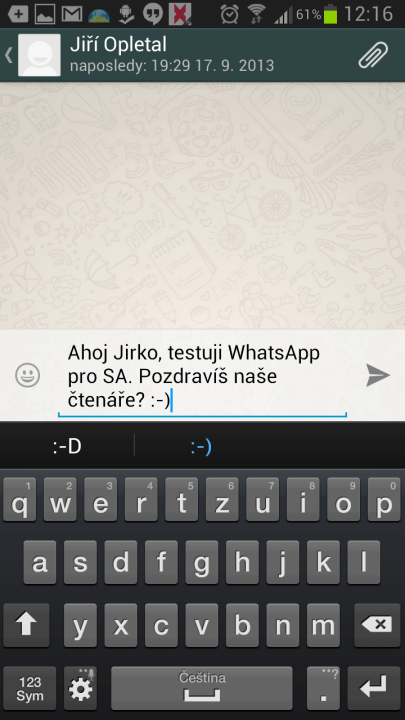 WhatsApp Messenger: posílejte textové i multimediální zprávy zadarmo! Hlavní stránka TOP Sdílejte: Karel Kilián Publikováno: 26.9.2013 06:00 (Aktualizováno: 17.12.2014 15:28) 55 komentářů 55 Připadají vám ceny textových zpráv absurdně vysoké? Pak se sami sebe zeptejte, zda je opravdu nutné posílat je přes operátora. Existuje totiž několik jednoduchých způsobů, jak si psát s přáteli zadarmo, a to dokonce i na zahraniční čísla! Nemáme přitom na mysli „instantní kecálky“ typu ICQ, Skype a další podobné, ale aplikace, ze kterých můžete posílat textové zprávy kamarádům a známým, jež máte v adresáři svého telefonu. Na výběr je celá řada alternativ, nicméně základním předpokladem je, aby danou platformu používalo co možná nejvíce lidí, kterým hodláte psát. Především díky majitelům iPhonů se značně rozšířil WhatsApp Messenger, takže se podíváme na to, co může nabídnout uživatelům Androida, kde si ho nainstalovalo již více než sto milionů uživatelů! WhatsApp Messenger: posílejte textové i multimediální zprávy zadarmo! Co slibuje WhatsApp? WhatsApp Messenger je aplikace pro psaní, odesílání, příjem a čtení krátkých textových zpráv, určená pro chytré mobilní telefony. K přenosu zpráv používá datové připojení (mobilní či Wi-Fi), čímž (svým způsobem) eliminuje operátora, kterému tak nemusíte platit za odeslané SMSky. Podívejme se na důvody, proč byste si tento program měli nainstalovat: Žádné skryté náklady – jakmile si vy a vaši přátelé nainstalujete tuto aplikaci, můžete si mezi sebou psát bez omezení. Pošlete třeba stovku zpráv denně a nebudete platit ani korunu (v případě připojení přes mobilní Internet samozřejmě platíte datové přenosy dle sazebníku vašeho operátora; za samotné zprávy ale neplatíte opravdu vůbec nic). Podpora multimédií – podobně, jako lze z mobilu poslat MMSku, umí i WhatsApp Messenger odesílat video, obrázky a hlasové poznámky. Zatímco běžné MMS nebývají právě levné, při odeslání přes tuto aplikaci je to zdarma. Skupinový chat – dostáváme se k funkci, kterou vám SMS nemají šanci nabídnout – totiž možnost konverzace více lidí. I to WhatsApp Messenger zvládá díky funkci skupinového chatu. Žádné poplatky za SMS do zahraničí (a ze zahraničí) – stejně, jako neplatíte za odeslání e-mailu třeba do Ameriky, nebudete platit ani za zprávy odeslané kamkoli do ciziny. WhatsApp Messenger nerozlišuje, komu a kam píšete – sazba je vždy tatáž: 0 Kč. Stejně tak zadarmo můžete psát i ze zahraniční dovolené či služební cesty – zde ale jedině tehdy, pokud budete posílat zprávy přes Wi-Fi, nebo máte-li výhodná roamingová data, kde se nepočítá přenesený objem. Řekněte ne PINům a uživatelským jménům – proč byste si měli pamatovat další uživatelské jméno, heslo nebo PIN? Aplikace vás identifikuje na základě telefonního čísla, a stejně tak rozpoznává i vaše kontakty. Nemusíte tak řešit, jakou přezdívku používá v dané komunitě vaše drahá polovička nebo šéf – pracovat budete s normálním adresářem kontaktů, stejně jako při psaní SMS. Žádné odhlašování a přihlašování – aplikace je ve spojení s okolním světem kdykoli a kdekoli, kde je k dispozici Internet. Zprávy jsou doručovány hned, jak je to možné, s použitím technologie „push“. Offline zprávy – asi vás při čtení předchozího bodu napadla otázka, co se stane se zprávou, kterou nebylo možné doručit, protože byl příjemce offline a/nebo měl vypnutý telefon. Je to tak jednoduché, jak jen může být: po zapnutí telefonu a spuštění aplikace budou všechny zprávy příjemci doručeny. Nehledejte kamarády – proč byste měli hledat své přátele, známé a pracovní kontakty, když je již máte ve svém adresáři? WhatsApp používá adresář telefonu, přičemž vám nabídne všechny kontakty, které také používají tuto komunikační platformu. Další funkce – výčet všech funkcí by trval ještě docela dlouho, takže vyberme alespoň ty zajímavé, jako jsou sdílení polohy, výměna kontaktů, vlastní tapety, zvuky oznámení, režim na šířku, odeslání historie chatu e-mailem, hromadné posílání zpráv více kontaktům najednou a další. Jak funguje v praxi? Aplikaci ve verzi 2.11.23 jsme nainstalovali standardním způsobem na redakční Samsung Galaxy S III s Androidem 4.1.2. Po prvním spuštění jsme byli přivítáni a dozvěděli jsme se, že skrze WhatsApp můžeme komunikovat s uživateli Windows Mobile/Phone, Androida, Symbianu, BlackBerry a iOS. Museli jsme také odsouhlasit podmínky a ujednání. Nesporným pozitivem je skutečnost, že aplikace komunikuje v českém jazyce. Přivítání v aplikaci Ověření telefonního čísla Ověření čísla V dalším kroku následuje ověření telefonního čísla, které probíhá tak, že zadáte zemi a telefon, na který vám bude odeslána kontrolní SMS. WhatsApp Messenger si pak sám ohlídá příchozí SMS s verifikačním kódem, takže pokud vše proběhne korektně, nemusíte ani nikam nic opisovat. Ověření čísla Nastavení profilové fotky a jména První rok je WhatsApp zdarma Následně jsme si mohli nastavit profilovou fotku, která bude zobrazována ostatním uživatelům, a jméno. Volitelně lze také „vytáhnout“ ikonu aplikace na domovskou obrazovku. Poté proběhla inicializace služeb, kde jsme se dozvěděli jednu podstatnou informaci: WhatsApp není zcela zdarma – zdarma získáte roční předplatné, za každý další rok pak zaplatíte symbolických 0,99 dolarů. Prostředí aplikace WhatsApp Pak už jsme se ocitli v prostředí aplikace, které odpovídá standardním aplikacím na posílání SMSek. Konverzace jsou tedy sdruženy podle kontaktů a seřazeny 