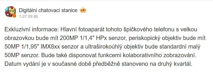 Nečekaný přírůstek do rodinky Xiaomi 17 dostane zajímavou fotovýbavu. Leaker prozradil detaily Hlavní stránka Zprávičky Xiaomi 17 Max má dostat 200Mpx hlavní snímač Samsung ISOCELL HPE o velikosti 1/1,4" Telefon doplní 50Mpx periskopický teleobjektiv Sony IMX8 a 50Mpx ultraširokoúhlý foťák Novinka má dorazit v Číně ve druhém čtvrtletí, globální uvedení je nepravděpodobné Sdílejte: Adam Kurfürst Publikováno: 30.1.2026 06:00 Žádné komentáře 0 Před dvěma týdny jsme vás informovali o chystaném Xiaomi 17 Max, které by mělo zaujmout především obří 8 000mAh baterií. Tehdy se spekulovalo o převzetí fotovýbavy ze standardního Xiaomi 17. Nový únik od leakera Digital Chat Station však naznačuje, že dojde k nečekané obměně. 200Mpx hlavní snímač místo 50Mpx Podle nejnovějších informací má Xiaomi 17 Max disponovat dosud nepředstaveným 200Mpx snímačem Samsung ISOCELL HPE o velikosti 1/1,4″. Je otázka, jak bude performovat v podmínkách s horším osvětlením, neboť má o něco menší optický formát než 50Mpx senzor využívaný základním Xiaomi 17. Hlavní fotoaparát údajně doplní 50Mpx periskopický teleobjektiv Sony z řady IMX8 (o velikosti 1/1,95″) a 50Mpx ultraširokoúhlý objektiv. Spolupráce s Leicou má pokračovat i u tohoto modelu. Příspěvek leakera Digital Chat Station (strojově přeloženo z čínštiny) Zbytek výbavy beze změn Co se týče zbytku výbavy, zatím nic nenasvědčuje jakékoliv změně oproti předchozím zvěstem. Xiaomi 17 Max má tedy nabídnout 6,9″ displej, procesor Snapdragon 8 Elite Gen 5 a již zmíněnou 8 000mAh baterii s podporou 100W drátového a 50W bezdrátového nabíjení. Na rozdíl od verzí Pro a Pro Max nebude disponovat zadním displejem. Ultratenká powerbanka Xiaomi přichází do dalších zemí. Má 5 000 mAh a magnetické uchycení Adam Kurfürst Zprávičky Adam Kurfürst Zprávičky Telefon by měl dorazit na čínský trh ve druhém čtvrtletí 2026. Globální uvedení se bohužel neočekává – Xiaomi pravděpodobně mimo Čínu nabídne pouze standardní model 17 a verzi Ultra. Zaujala by vás taková fotografická výbava u Xiaomi 17 Max? Zdroje: Digital Chat Station/Weibo, Gizmochina, Notebookcheck O autorovi Adam Kurfürst Adam studuje na gymnáziu a technologické žurnalistice se věnuje od svých 14 let. Pakliže pomineme jeho vášeň pro chytré telefony, tablety a příslušenství, rád se… Více o autorovi Sdílejte: Žádné komentáře Vložit komentář android telefon vlajková loď Xiaomi Xiaomi 17 Mohlo by vás zajímat Xiaomi spustilo obří zimní výprodej. Za mobily, tablety i další elektroniku ušetříte tisíce korun Jana Skálová 7.1.2025 Datart prodává extra oblíbené Redmi za nesmyslně nízkou cenu! Kde je háček? Adam Kurfürst 28.12.2024 Black Friday: Datart vyprodává elektroniku za absurdní ceny, našli jsme skutečné perly (aktualizováno) Jakub Kárník 6.11.2024 POCO X7 (Pro) přichází do Česka! Za skvělou cenu nabídnou nejen vysoký výkon Adam Kurfürst 9.1.2025 Jakou výbavu přinese Xiaomi 15T Pro? Nejspíš známe první detaily! Adam Kurfürst 10.1.2025 Xiaomi zahajuje Black Friday! Zlevnily mobily, televize i chytrá domácnost, vybrali jsme TOP nabídky Adam Kurfürst 30.10.2024