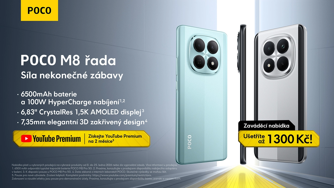 Exkluzivně: Řada POCO M8 brzy přijde do Česka. Známe přesné datum a zaváděcí slevy Hlavní stránka Zprávičky Značka POCO uvede 8. ledna na český trh nové smartphony M8 a M8 Pro Model M8 Pro nabídne 6,83" quad-curved AMOLED displej a 6 500mAh baterii se 100W nabíjením. Zaváděcí slevy dosahují až 1 300 Kč a platí do 25. ledna 2026. Sdílejte: Adam Kurfürst Publikováno: 31.12.2025 14:00 Žádné komentáře 0 Po nedávném odhalení zaváděcích bonusů u řady Xiaomi Redmi Note 15 přicházíme s dalšími informacemi. Tentokrát se zaměřujeme na značku POCO, která už 8. ledna uvede na český trh dvojici cenově dostupných smartphonů M8 5G a M8 Pro 5G. Zaváděcí akce: slevy až 1 300 Kč Přehled modelů a zaváděcích slev POCO M8 Pro: výkon a výdrž v jednom POCO M8: cenově dostupnější volba Srovnání specifikací Zaváděcí akce: slevy až 1 300 Kč POCO má pro první kupce nachystané slevové kódy platné od 8. do 25. ledna 2026. Nejvyšší úsporu získají zájemci o model M8 Pro v konfiguraci 8/256GB, kde bude sleva činit 1 300 Kč. U vyšší paměťové varianty 12/512GB je zvýhodnění o něco nižší – 1 000 Kč. Základní POCO M8 5G v jedné dostupné konfiguraci 8/256GB nabídne slevu 600 Kč. Oficiální české ceny prozatím nemáme k dispozici, ale na základě úniku ze zahraničí se dá očekávat, že by POCO M8 5G mohlo stát přibližně 7 tisíc korun v přepočtu, zatímco model Pro 5G v základní konfiguraci zhruba 9,5 tisíce korun. Varianta s dvojnásobnou kapacitou paměti by pak mohla těsně přesáhnout hranici 10 tisíc korun. Přehled modelů a zaváděcích slev ModelPaměťová variantaZaváděcí slevaPOCO M8 Pro 5G8/256GB1 300 KčPOCO M8 Pro 5G12/512GB1 000 KčPOCO M8 5G8/256GB600 Kč POCO M8 Pro: výkon a výdrž v jednom Vyšší model řady zaujme především svým 6,83″ quad-curved AMOLED displejem se 120Hz obnovovací frekvencí. Obrazovku chrání odolné sklo Corning Gorilla Glass Victus 2. O výkon se stará čipset Qualcomm Snapdragon 7s Gen 4, který pohání také Android 15 s nadstavbou HyperOS 2. Fotovýbava zahrnuje 50Mpx hlavní snímač doplněný o 8Mpx ultraširokoúhlý objektiv. Přední strana nabídne 32Mpx selfie kameru. K velkým přednostem patří 6 500mAh baterie s podporou 100W rychlého nabíjení, díky němuž telefon dobijete za velmi krátkou dobu. Rozměry činí 162,5 × 74,7 × 7,9 mm při hmotnosti 207 gramů. POCO M8: cenově dostupnější volba Základní model disponuje 6,77″ zakřiveným AMOLED displejem rovněž se 120Hz obnovovací frekvencí. Pod kapotou najdeme procesor Qualcomm Snapdragon 6 Gen 3, který zajistí dostatečný výkon pro běžné používání. Systémem je opět Android 15 s HyperOS 2. Fotoaparáty tvoří 50Mpx hlavní snímač a 2Mpx hloubkový senzor. Selfie kamera má rozlišení 20 Mpx. Baterie s kapacitou 5 520 mAh podporuje 45W nabíjení, což je u cenově dostupných telefonů stále nadprůměrná hodnota. Srovnání specifikací SpecifikacePOCO M8POCO M8 ProDisplej6,77″ AMOLED, 120 Hz6,83″ AMOLED, 120 HzProcesorSnapdragon 6 Gen 3Snapdragon 7s Gen 4Hlavní fotoaparát50 Mpx + 2 Mpx50 Mpx + 8 MpxSelfie kamera20 Mpx32 MpxBaterie5 520 mAh, 45 W6 500 mAh, 100 WSystémAndroid 15, HyperOS 2Android 15, HyperOS 2 Který z nových modelů POCO vás zaujal více? Zdroje: vlastní, GSMArena, YTECHB O autorovi Adam Kurfürst Adam studuje na gymnáziu a technologické žurnalistice se věnuje od svých 14 let. Pakliže pomineme jeho vášeň pro chytré telefony, tablety a příslušenství, rád se… Více o autorovi Sdílejte: Žádné komentáře Vložit komentář android telefon POCO M8 Střední třída únik Xiaomi Mohlo by vás zajímat Xiaomi spustilo obří zimní výprodej. Za mobily, tablety i další elektroniku ušetříte tisíce korun Jana Skálová 7.1. Datart prodává extra oblíbené Redmi za nesmyslně nízkou cenu! Kde je háček? Adam Kurfürst 28.12.2024 Black Friday: Datart vyprodává elektroniku za absurdní ceny, našli jsme skutečné perly (aktualizováno) Jakub Kárník 6.11.2024 POCO X7 (Pro) přichází do Česka! Za skvělou cenu nabídnou nejen vysoký výkon Adam Kurfürst 9.1. Jakou výbavu přinese Xiaomi 15T Pro? Nejspíš známe první detaily! Adam Kurfürst 10.1. Xiaomi zahajuje Black Friday! Zlevnily mobily, televize i chytrá domácnost, vybrali jsme TOP nabídky Adam Kurfürst 30.10.2024
