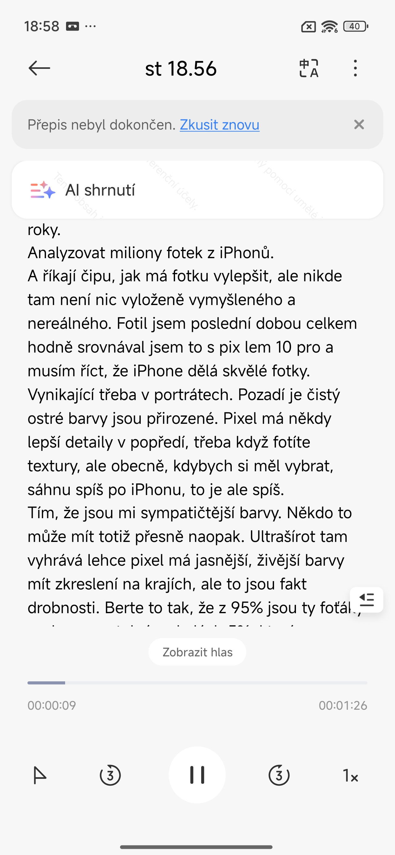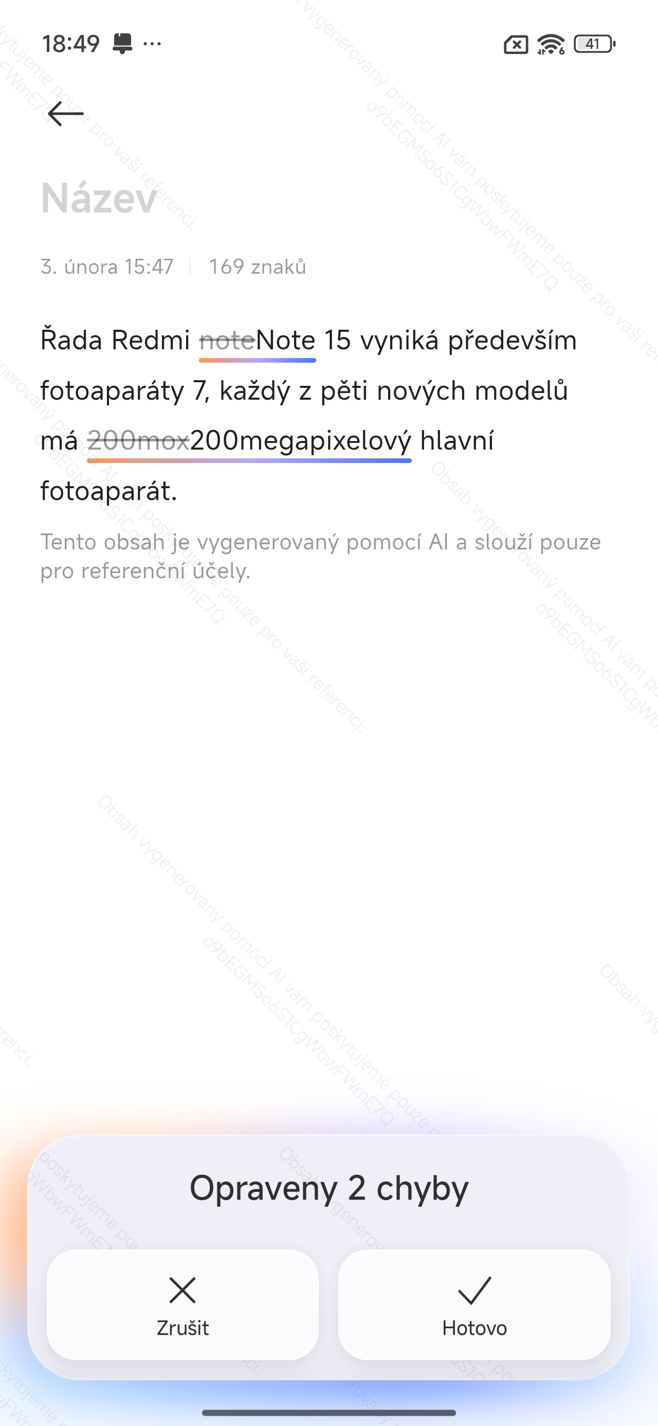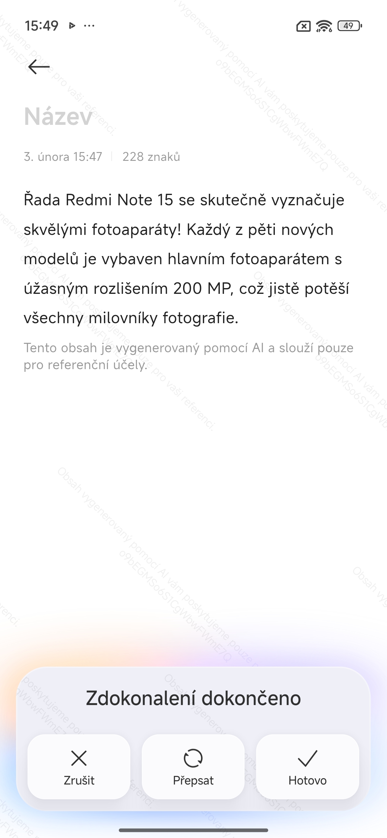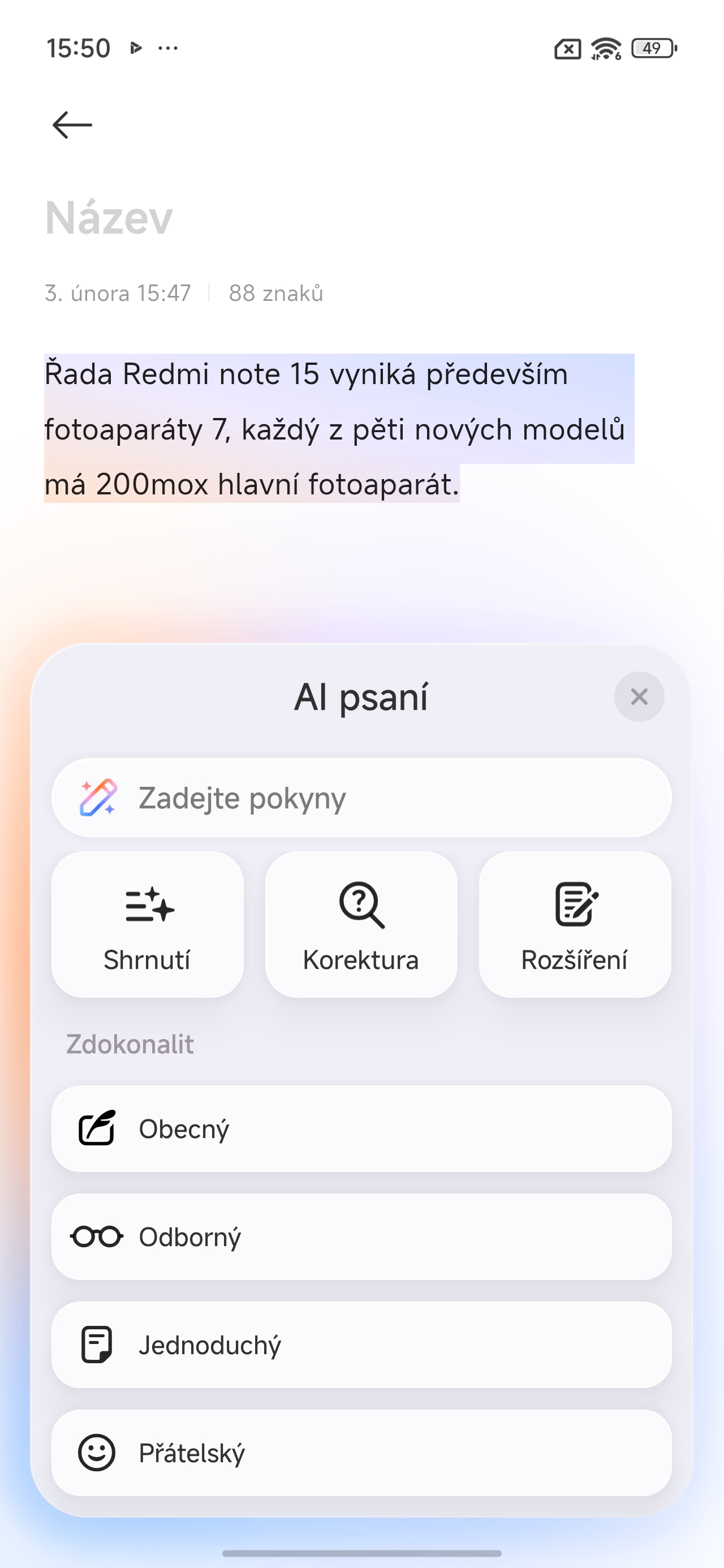 Proč koupit Redmi Note 15 Pro+ 5G? Důvodem může být kompletní balíček AI funkcí, které umí česky! Hlavní stránka Zprávičky Kompletní sadu generativních AI funkcí HyperAI najdete v řadě Note 15 pouze na modelu Pro+ 5G AI Psaní, přepis řeči i tlumočení jsou tři funkce, které v celé řadě Note 15 nemá žádný jiný model Vše funguje v češtině, ale internet je nutnost – lokálně žádná AI funkce neběží Sdílejte: Jakub Kárník Publikováno: 6.2.2026 10:00 Žádné komentáře 0 Xiaomi už loni vsadilo na HyperAI jako na deštník, pod kterým se soustředí všechny funkce umělé inteligence. Deštník ale nedrží nad každým stejně. V řadě Redmi Note 15 dostane kompletní AI balíček pouze Pro+ 5G, ostatní modely mají omezenější verzi – a u nejlevnějších generativní AI schází úplně. Dnes se podíváme blíže na to, co kompletní balíček obsahuje, kde leží praktická hodnota a hlavně, kde se modely navzájem liší. Tři funkce, které nemá žádný jiný Note 15 Fotky: kde je hlavní rozdíl mezi modely Gemini a Circle to Search: pro všechny bez rozdílu Čeština ano – ale internet je nutnost Kolik AI dostanete za kolik korun Závěrečné hodnocení Tři funkce, které nemá žádný jiný Note 15 Začnu těmi, které odlišují Pro+ 5G od celé řady. AI Writing (Psaní) pracuje systémově – aktivujte jej v Poznámkách, v mailech, zkrátka kdekoli, kde píšete text. Dokáže text prodloužit, zkrátit, přepsat nebo opravit, a to ve čtyřech odlišných tónech. Nejde o jednorázovou hračku, ale o nástroj pro opakované použití, který šetří čas hlavně při delších textech. Psaní skrz AI funguje relativně dobře u kratších a středně dlouhých zpráv, což dává smysl. Pro úpravu textu jej stačí označit a následně si můžete vybrat – text může být obecného rázu, ale také odborný, jednoduchý nebo přátelský. Kromě jeho přepsání můžete umělou inteligenci požádat také o shrnutí, jazykovou korekturu nebo rozšíření textu. AI Speech Recognition (Rozpoznání textu) je záznamník s přepisem mluveného slova. Telefon převádí řeč do textu, rozpozná jednotlivé osoby a na konci vygeneruje shrnutí celé konverzace. Na schůzce, přednášce, rozhovoru – místo psaní zápisků se soustředíte na obsah. Funkci Xiaomi úspěšně testoval loni na Xiaomi 15T, v Note 15 Pro+ je implementace totožná. KOUPIT REDMI NOTE 15 PRO+ 5G Třetí je AI Interpreter, real-time tlumočník mezi 30 jazyky. Mluvíte česky, telefon okamžitě převádí do angličtiny, japonštiny, čínštiny – a naopak. Prakticky se hodí na situace v zahraničí. Navíc AI Search umožňuje kontextové vyhledávání přímo v aplikaci a AI Dynamic Wallpapers generují pozadí pro displej. Fotky: kde je hlavní rozdíl mezi modely AI Erase Pro odstraňuje objekty z fotek přes cloud. Díky generativní AI vyplní prostor přirozeně, bez viditelných artefaktů – oproti základnímu Erase, který najdete i u nejlevnějších modelů Note 15, je rozdíl patrný. Remove Reflection eliminuje odlesky ze skla, hodí se na snímky pořízené za oknem. Image Expansion prodlužuje obraz za jeho původní hranice tak, že vygenerovaná plocha splývá se zbytkem. Sky nahradí nebe, Bokeh přidá umělé rozmazání pozadí k portrétům a Image Enhancement zvyšuje obecnou kvalitu jedním klepnutím. Dva bonusy navíc patří jen Pro+ 5G: Cutouts umí vyjmout objekt z fotky a uložit ho jako samostatný prvek – v podstatě tvoří samolepky přímo v telefonu. AI Film pak automaticky sestrojí krátký film se zvukem z vašich nejlepších snímků, bez ručního sestřihu. To se mi ale v praxi upřímně moc neosvědčilo. KOUPIT REDMI NOTE 15 PRO+ 5G Pro kontext: Pro a Pro 5G tyto foto funkce mají skoro všechny, chybí jim pouze Cutouts. Note 15 a Note 15 5G mají z AI v Galerii hodně málo – základní Erase (bez „Pro“), Sky, Bokeh a Beautify. Image Expansion, AI Film ani Image Enhancement u nich nehledejte. Gemini a Circle to Search: pro všechny bez rozdílu Google Gemini jako hlasový asistent a Circle to Search pro vizuální vyhledávání nejsou HyperAI exkluzivitou – ty dostanete na všechny modely Note 15 (a všechny ostatní Androidy), dokonce i na nejlevnější. Circle to Search je v praxi možná ta nejpoužívanější AI funkce z celého balíčku: podržete spodní lištu, zakroužkujete cokoliv na obrazovce a telefon to vyhledá. Jednodušší to být nemůže. Čeština ano – ale internet je nutnost Psaní, přepis řeči, tlumočení – klíčové funkce HyperAI fungují v češtině. To je konkrétní výhoda, která u Xiaomi existuje od Xiaomi 14T a platí i tady. Gemini v češtině spolehlivě odpovídá rovněž. KOUPIT REDMI NOTE 15 PRO+ 5G Podmínka ale platí pro všechny bez výjimky: žádná AI funkce neběží lokálně. Bez internetového připojení HyperAI umlkne – a to platí i pro ta nejzákladnější řešení, jako Writing. V offline situacích se zkrátka vrátíte zpět k standardním funkcím telefonu a vlastní hlavě. Kolik AI dostanete za kolik korun Rozdíly nejsou malé a stojí za to je pojmenovat. Redmi Note 15 a Note 15 5G nemají generativní AI vůbec – žádné psaní, přepis ani tlumočení, foto AI mají jen v nejzákladnější verzi. Note 15 Pro a Pro 5G přidají Image Expansion, AI Film a Erase Pro, ale generativní nástroje jim stále chybí. Kompletní balíček je výsada jednoho telefonu v řadě – a ten je právě Pro+ 5G. KOUPIT REDMI NOTE 15 PRO+ 5G Závěrečné hodnocení HyperAI v Redmi Note 15 Pro+ 5G je zatím nejúplnější AI balíček, který Xiaomi nabídlo v telefonu pod 10 tisíc korun. Zda každou z těch funkcí budete používat pravidelně, to je jiná otázka – nejspíše nejčastěji sáhnete po záznamníku, Circle to Search a Erase Pro. Ale paket jako celek je kompletní, fungu