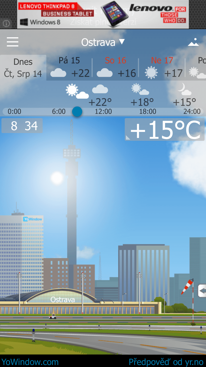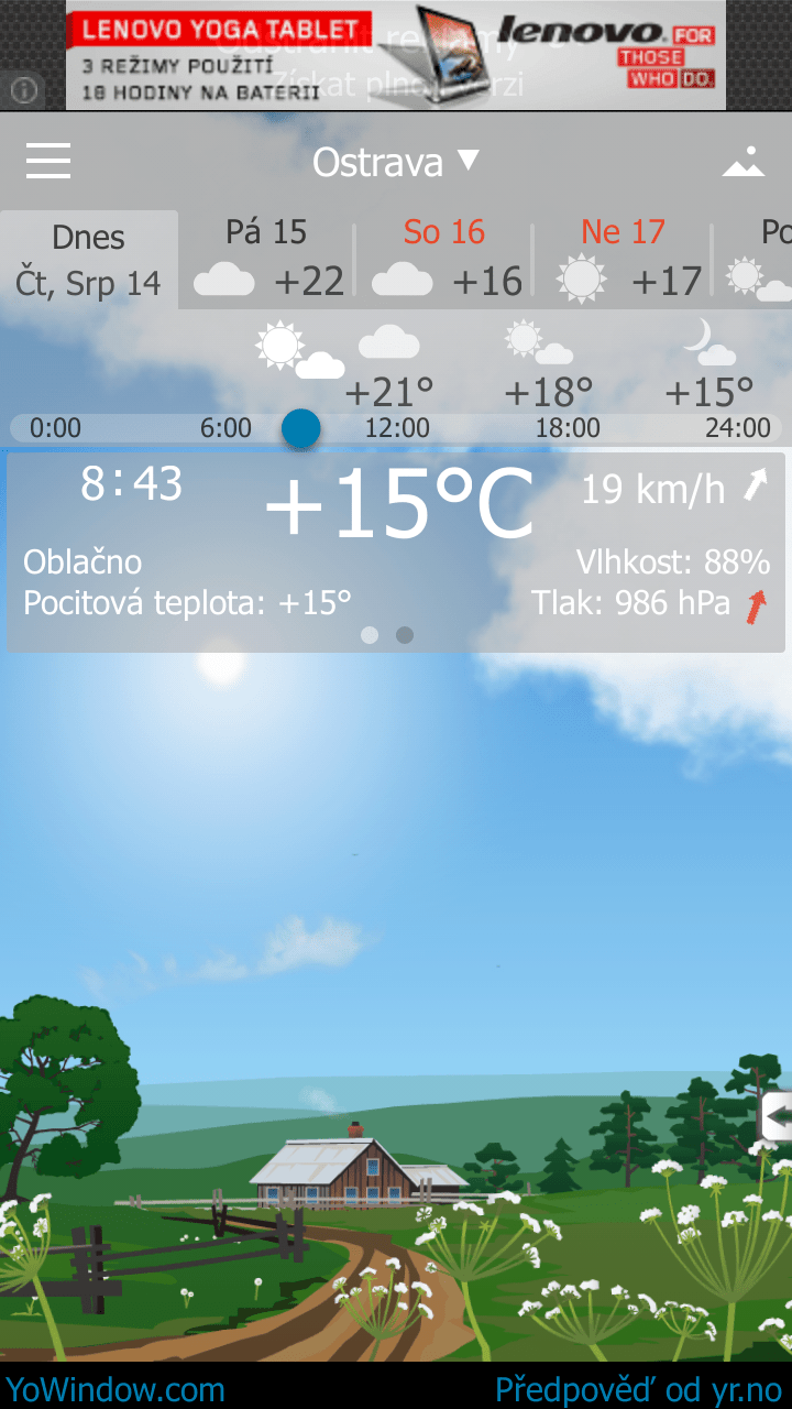 YoWindow: předpověď počasí, díky níž nebudete potřebovat okno Hlavní stránka Recenze Recenze na aplikace Sdílejte: Karel Kilián Publikováno: 14.8.2014 14:00 17 komentářů 17 Už vás nebaví dívat se z okna, abyste zjistili, jaké je venku počasí? Pak určitě využijete služeb aplikace YoWindow, která přináší aktuální meteorologickou situaci do vašeho telefonu takřka v přímém přenosu. Jedním pohledem na displej tak například zjistíte, že prší, sněží, nebo je naopak hezky a slunečno. Poté se můžete podívat na informace o teplotě a další údaje, jakož i předpověď pro následující dny – k těm se přitom dostanete snadno a rychle přejetím prstu po obrazovce. YoWindow: předpověď počasí, díky níž nebudete potřebovat okno Co YoWindow slibuje? YoWindow má být nová, jedinečná aplikace, jejíž kouzlo spočívá v tom, že zobrazuje animovanou krajinu s realistickým odrazem aktuálního počasí v místě, kde se nalézáte, nebo v zadaném městě. Například pokud venku prší, uvidíte dešťové kapky i v tomto programu. Aplikace dokonce respektuje skutečný východ i západ slunce a roční období a přizpůsobuje tomu podmínky zobrazované scény. Stačí si jen vybrat krajinu, která se nejlépe hodí pro vaši oblast, nebo jež se vám nejvíce líbí. YoWindow přizpůsobuje obraz denní době a ročnímu období YoWindow přizpůsobuje obraz denní době a ročnímu období YoWindow přizpůsobuje obraz denní době a ročnímu období V YoWindow můžete sledovat nejen aktuální situaci, ale také prognózu na devět dalších dnů. Předpověď počasí přitom poskytují renomované meteorologické instituce – Yr.no a NWS. Jak YoWindow funguje v praxi? Aplikaci ve verzi 1.0.8 jsme nainstalovali na telefony HTC One s operačním systémem Android 4.4.2 a Samsung Galaxy S III s alternativní ROMkou CyanogenMod 11.0 M9 (Android 4.4.4). Po spuštění se okamžitě zobrazí aktuální situace a překryvná vrstva s nápovědou, která vám sdělí, že „Posouváním obrazovky uvidíte změny počasí v čase.“ Z toho plyne příjemná skutečnost, že YoWindow komunikuje s uživatelem v češtině. Vrstva s nápovědou Vrstva s nápovědou Vrstva s nápovědou Program také korektně rozpoznal, že se nacházíme v Ostravě, nicméně na území naší republiky zná jen pět největších měst. Uživatelské prostředí se skládá z: Horní nástrojové lišty, ze které se dostanete do nastavení či ke změně lokality. Správa sledovaných lokalit Přidání místa – výběr země Přidání místa – výběr města Tlačítko v pravém horním rohu slouží k výběru animovaných krajinek (k dispozici je vesnice, pobřeží, letiště, orientální a obloha). Výběr krajiny na pozadí Výběr krajiny na pozadí: vesnice Výběr krajiny na pozadí: pobřeží Výběr krajiny na pozadí: letiště Výběr krajiny na pozadí: orientální Výběr krajiny na pozadí: obloha Přepínačů mezi dny (k dispozici je následujících devět dnů). Přepínání mezi dny Přepínání mezi dny Přepínání mezi dny Posuvníku pro posun v čase. Nad tímto prvkem jsou vyobrazeny očekávané teploty a grafické znázornění předpovídaného počasí. Posun v čase Posun v čase Posun v čase Největší část okna zabírá pohled na situaci s vyobrazením času a teploty. Klepnutím na teplotu se dozvíte další podrobnosti, jako jsou: slovní vyjádření počasí, pocitová teplota, směr větru, vlhkost a tlak vzduchu a tlaková tendence. Po odsunutí těchto údajů do strany jsou k dispozici informace o časech východu a západu slunce, viditelnosti, délce dne, měsíční fázi, rosném bodu a času aktualizace zdrojových dat. Klepnutím na krajinu přepnete program do celoobrazovkového režimu, kde dominuje obrázek s informacemi o čase a teplotě. Podrobnější informace o počasí Podrobnější informace o počasí Celoobrazovkový režim aplikace Ovládání je tedy velice prosté: přepínači v horní části volíte den, pro který chcete vidět předpověď, posuvníkem pak nastavujete požadovaný čas. Klepnutím na tlačítko Živě se kdykoli můžete vrátit k aktuální situaci. V celoobrazovkovém režimu lze posun v čase provádět horizontálním posunem prstu po obrazovce, což je intuitivní a pohodlné. Možnosti nastavení Možnosti nastavení, do kterých se dostanete klepnutím na tlačítko v levém horním rohu aplikace, jsou poměrně omezené. Kromě odkazu na plnou verzi aplikace, zde naleznete možnost aktualizovat předpověď, zadat hodnocení programu v Obchodě Play a výběr jednotek (metrické, americké, britské, finské, nebo ruské). Možnosti nastavení aplikace YoWindow Možnosti nastavení aplikace YoWindow Možnosti nastavení: výběr jednotek Volitelně můžete zapínat/vypínat iluzi 3D prostoru, zobrazování aktuální teploty v oznamovací liště a zvuk. Dále následují odkazy na YoWindow pro iOS, Windows a Mac OS, nakonec zde jsou informace o aplikaci s odkazy na sociální sítě. Resumé Celkově patří YoWindow spíše k jednodušším meteorologickým programům, který bude vyhovovat uživatelům, jež od tohoto typu aplikací neočekávají co možná nejpodrobnější informace. Pochvalu si jistě zaslouží lokalizace do češtiny a netradiční grafické provedení, jakož i intuitivní uživatelské prostředí, se kterým se sžijete během několika mála okamžiků. Nesporným kladem je skutečnost, že meteorologické informace jsou přebírány z Yr.no, který řada uživatelů považuje za přesný a spolehlivý. Čeští uživatelé v Obchodě Play kritizují například příliš malý počet nabízených měst – k dispozici jsou jen Brno, Olomouc, Ostrava, Plzeň a Praha. Naopak mezi spokojené patří Petr Semerák, který k plnému hodnocení napsal: „Na PC Používám tuhle super aplikaci už dlouho. N