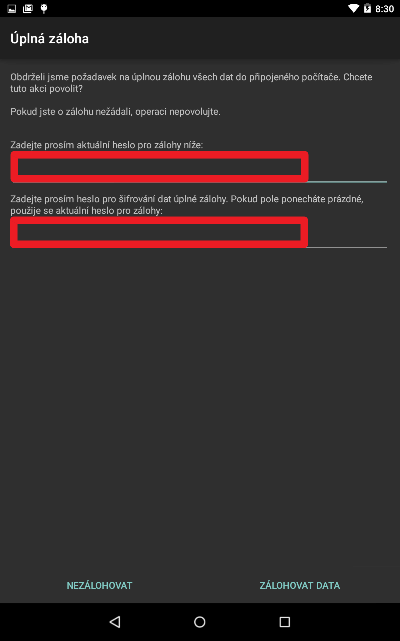 Kompletní záloha telefonu/tabletu s Androidem bez rootu [návod] Hlavní stránka TOP Sdílejte: Karel Kilián Publikováno: 4.12.2014 12:00 (Aktualizováno: 10.12.2014 09:56) 23 komentářů 23 Chcete provést kompletní zálohu svého telefonu či tabletu s operačním systémem Android? Pokud použijete náš postup, obejdete se bez práv roota! Operační systém Android sám o sobě ani ve verzi 5.0 neumí kompletní zálohu včetně aplikací, dat a nastavení. Obecně se traduje, že k takové operaci jsou nutná práva roota a nějaká aplikace třetí strany – nejčastěji je v tomto kontextu zmiňován skutečně velice silný nástroj Titanium Backup (viz náš návod Jak na Androidu zálohovat aplikace a jejich data s programem Titanium Backup?). Co ale dělat v případě, že práva roota na svém Androidu z nějakého důvodu nemáte, a přesto byste chtěli zálohovat? Existuje přinejmenším jedna osvědčená a spolehlivá cesta – nástroj adb a jeho parametr backup. Ukážeme vám dvě cesty, jak tuto situaci můžete vyřešit. Záloha pomocí aplikace Simple ADB Backup/Holo Backup Ve své podstatě se v tomto případě nejedná ani tak o aplikaci, jako spíše o uživatelsky přívětivější rozhraní k nástroji adb, který sám o sobě pracuje z příkazového řádku. Jedním z možných použití ADB Backup je zálohování zařízení Nexus před odemykáním bootloaderu, které maže obsah zařízení. Poté můžete jednoduše obnovit zálohu do (většinou) stejného stavu jako předtím. Aplikaci můžete stáhnout z oficiální stránky buď ve formátu ZIP, nebo TGZ; balíček je velký kolem 30 MB. V archivu je vše potřebné, včetně již zmiňovaného programu adb.exe, který nás ale v tomto případě nebude zajímat. Vzhledem k tomu, že tato funkce je zahrnuta v operačním systému, není k činnosti této aplikace potřebný root telefonu/tabletu. Může být velmi užitečná, protože zálohu byste měli provést před jakoukoli operací, dotýkající se systému. V některých případech totiž může dojít ke smazání obsahu zařízení a záloha je jedinou cestou, jak dostat vše do původní podoby. Protože tato funkce přišla až s Androidem 4.0, bude fungovat pouze na zařízeních s touto a vyšší verzí systému, tedy vyrobených v roce 2011 či později. Příprava zařízení k záloze Abyste mohli provést zálohu pomocí adb backup, je nutné zařízení připravit. Splněny musí být následující podmínky: Musíte mít v systému nainstalované správné ovladače, které najdete zpravidla na webu výrobce. Připojené zařízení by mělo být přepnuté do režimu PTP (Fotoaparát). Zařízení v režimu MTP Přepněte na režim fotoaparát Zařízení v režimu PTP Musí být povolené ladění USB. Sekce Pro vývojáře Povolit Ladění USB Povolit Ladění USB Operační systém Android musí být ve verzi 4.0 a vyšší. Režim PTP a ladění USB Provedení zálohy Stažený soubor stačí rozbalit a spustit HoloBackup.exe. Spusťte soubor HoloBackup.exe Spusťte soubor HoloBackup.exe Následně ještě budete muset potvrdit, že ADB Backup je nedokumentovaná část Android SDK a na některých zařízeních nemusí fungovat správně. Jedná se o experimentální funkci, takže není vhodné spoléhat na ni jako na jedinou metodu zálohování! ADB Backup je nedokumentovaná část Android SDK Uživatelské prostředí aplikace je prosté a působí poněkud zastarale, nicméně hlavní jsou v tomto případě nabízené funkce, nikoli grafický kabátek. Uživatelské prostředí aplikace Podívejme se na jednotlivá tlačítka a jejich funkci: Backup all without system apps – záloha všeho bez systémových aplikací (doporučená volba – zálohu je pak možné obnovit i na jinou verzi systému). Backup all with system apps (unsafe) – záloha včetně systémových aplikací (zálohu nedoporučujeme obnovovat na jinou verzi systému). Backup app data and device data – záloha dat aplikací a zařízení. Backup apps – záloha pouze aplikací bez nastavení a dat. Backup storage / SD card – zálohuje obsah interní paměti a/nebo paměťové karty. Restore – obnova dat ze zálohy. V prvním kroku zvolíte soubor se zálohou, v dalších krocích pak jen budete potvrzovat. SMS Backup / Restore – záloha a obnova textových zpráv. K této operaci je nutné do zařízení nainstalovat program SMS Backup+. Backups will be stored here – složka, kam budou uloženy zálohy. Connect to Wireless ADB – připojení přes bezdrátové ADB. Pro tyto operace musí být telefon nebo tablet připojen a nakonfigurován pro tento způsob komunikace. V aplikaci pak zadáte IP adresu a port. Jestliže se pustíte do zálohy, aplikace upozorní na nutnost mít nastavené heslo pro zálohy. Aplikace upozorní na nutnost mít nastavené heslo Tuto možnost najdete v systémovém nastavení v sekci Pro vývojáře-Heslo pro zálohy v počítači. Pro vývojáře Heslo pro zálohy v počítači Nastavit heslo pro zálohy Pak ještě budete upozorněni, že byste měli sledovat celý proces a nezavírat příkazový řádek, dokud aplikace nedokončí všechny operace. Měli byste sledovat celý proces a nezavírat příkazový řádek Zejména pokud se na obrazovce telefonu/tabletu zobrazí výzva k povolení ladění, budete ji muset odsouhlasit. V prvním kroku budete vyzváni k odemknutí zařízení a potvrzení operace zálohy. Povolte ladění USB Potvrzení operace zálohy Potvrzení operace zálohy Pak již budete moci sledovat, jak záloha probíhá. S ohledem na počet aplikací, jejich velikost a objem dat může tato operace trvat až několik minut. Ve výchozím stavu (tedy pokud jste neměnili nastavení Backups will be stored here), najdete soubor se zálohou ve složce Backups v adresáři, odkud jste aplikaci spustili. Záloha přes příkazový řádek s adb backup Pokud přeci jen r